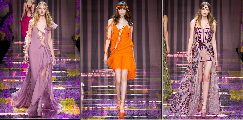 Fra le maison francesi hanno sfilato anche case italiane importanti quali Atelier Versace, seguita da una Donatella Versace che ha dato vita ad una collezione meno aggressiva e più romantica. Questo passaggio è stato esplicato dalla scelta di creare abiti leggeri in chiffon dal taglio sfrangiato, bustier in Swarovski, mini tuniche ricamate, maxi robe in organza, abiti da sera drappeggiati con nodi in tessuto.