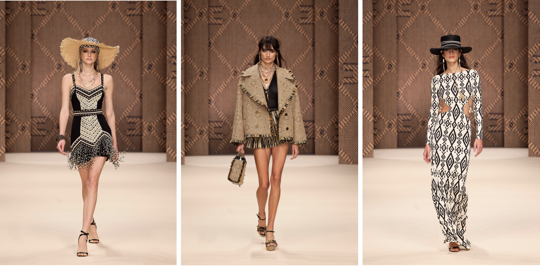 Elisabetta Franchi dedica la sua collezione SS 2023 a questo istinto nomade e gioioso che porta nell’anima come nel guardaroba femminile suggestioni e ricordi di un altrove senza confini. Niente ha il sapore del già visto e della consuetudine, ma c’è un profumo che dal New Messico all’Argentina riporta la mente ai suoni tribali della Pampa e delle grandi città del Sud America.