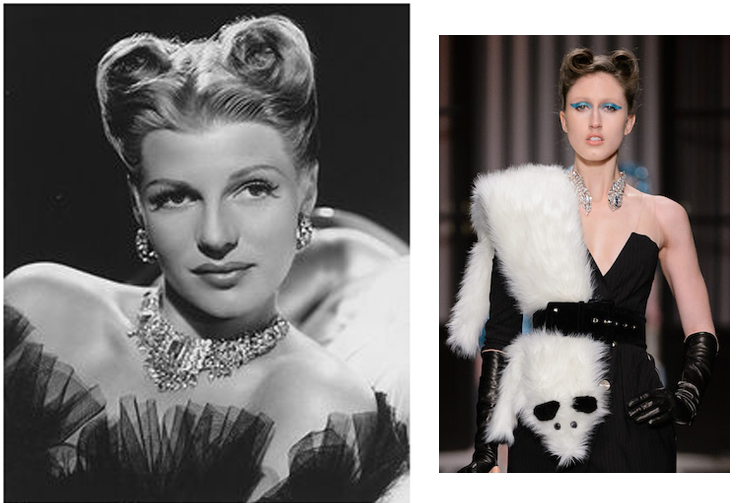 Dei ’40 tornano anche le acconciature, i victory rolls, i dettagli preziosi dei gioielli per capelli, dei cappellini con veletta che nascondono il viso rendendo l’allure misteriosa come quella delle dive hollywoodiane.