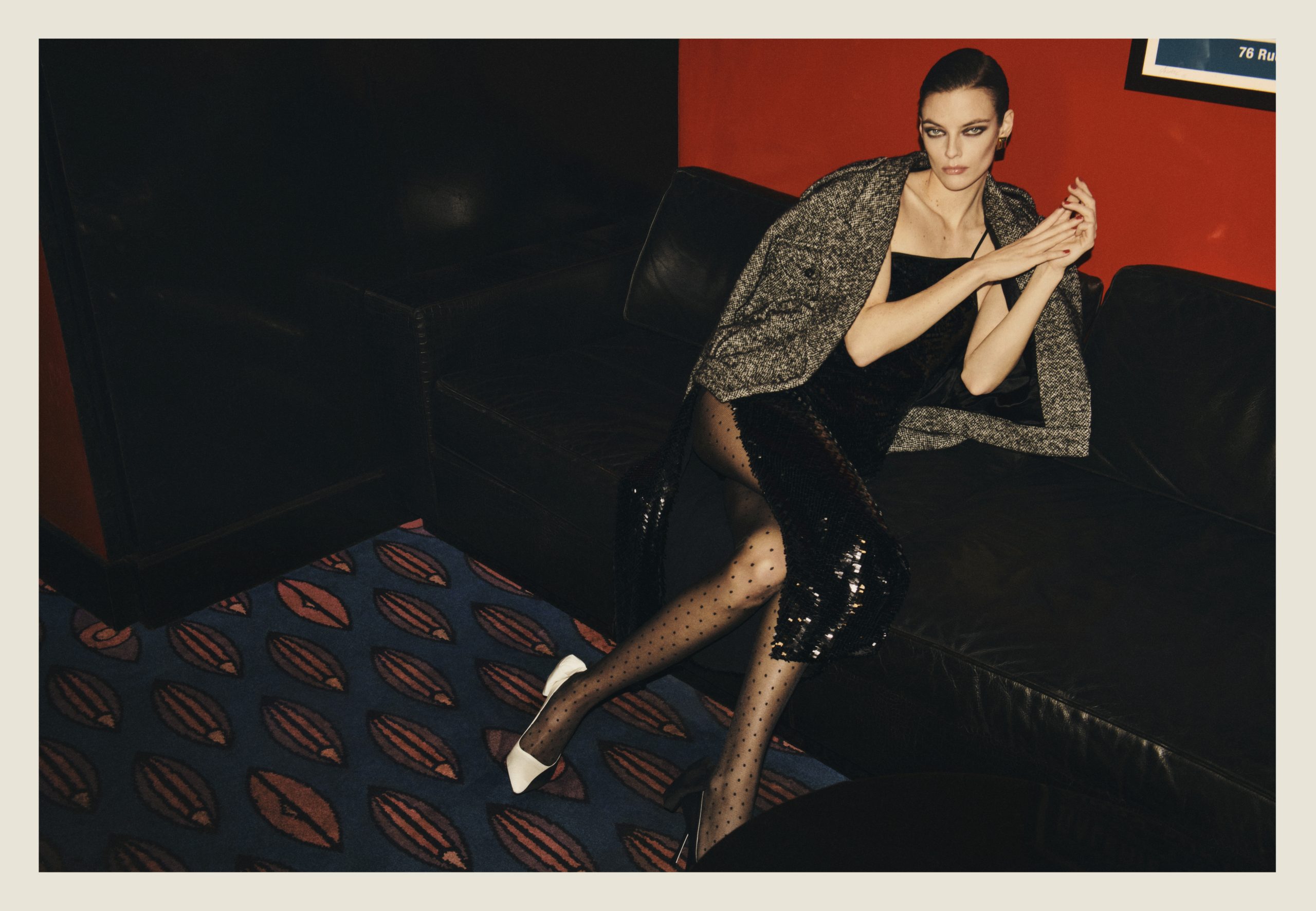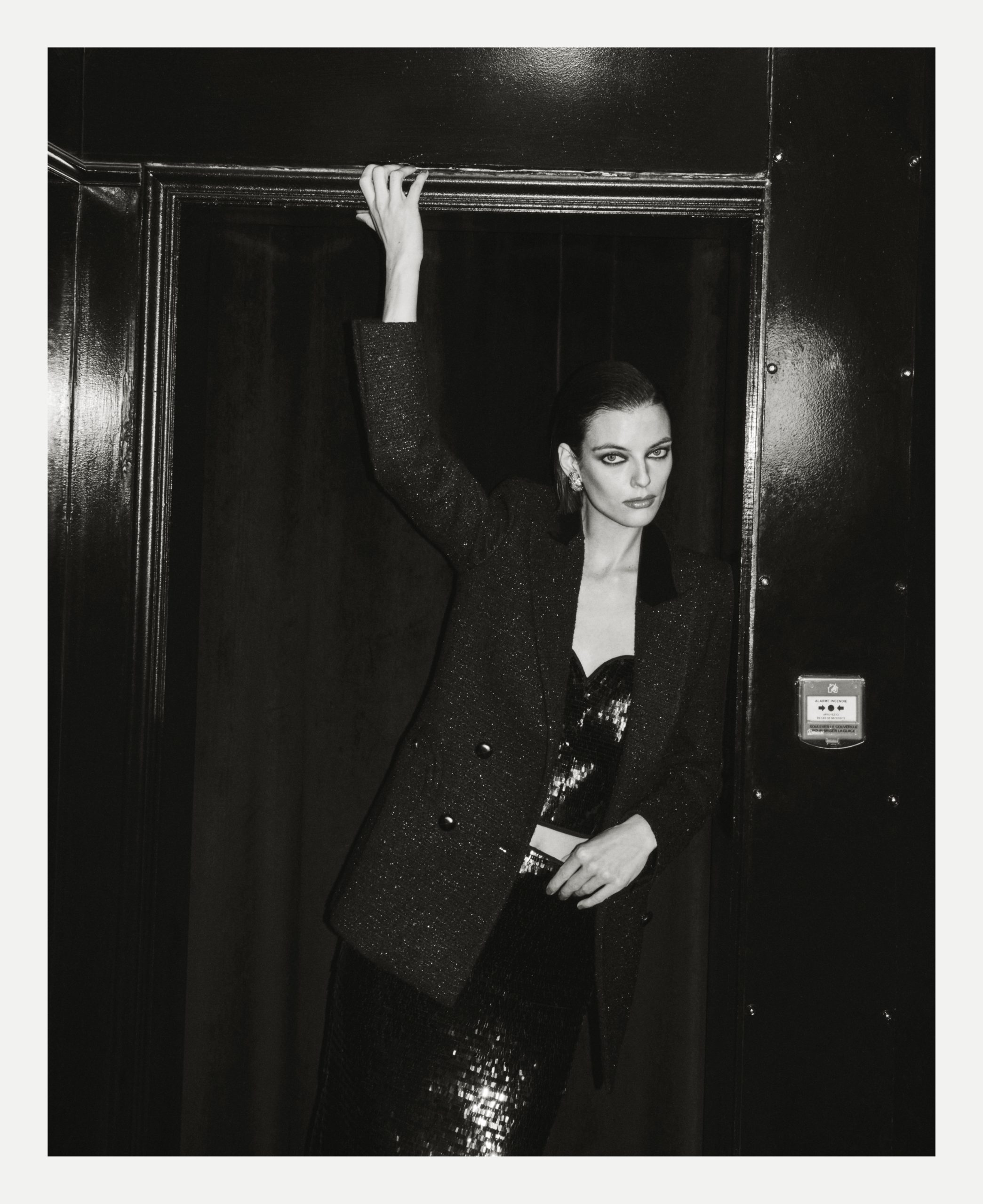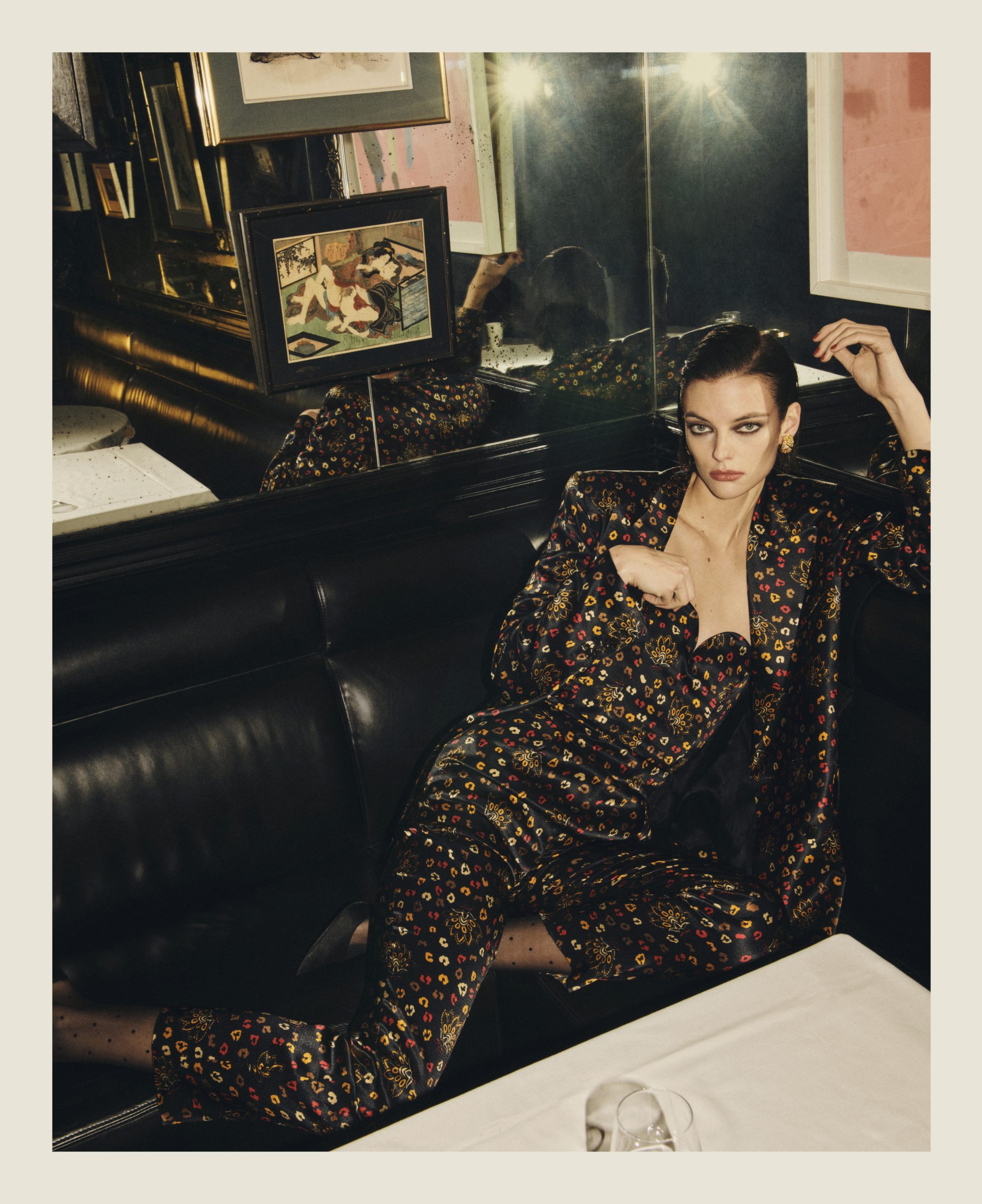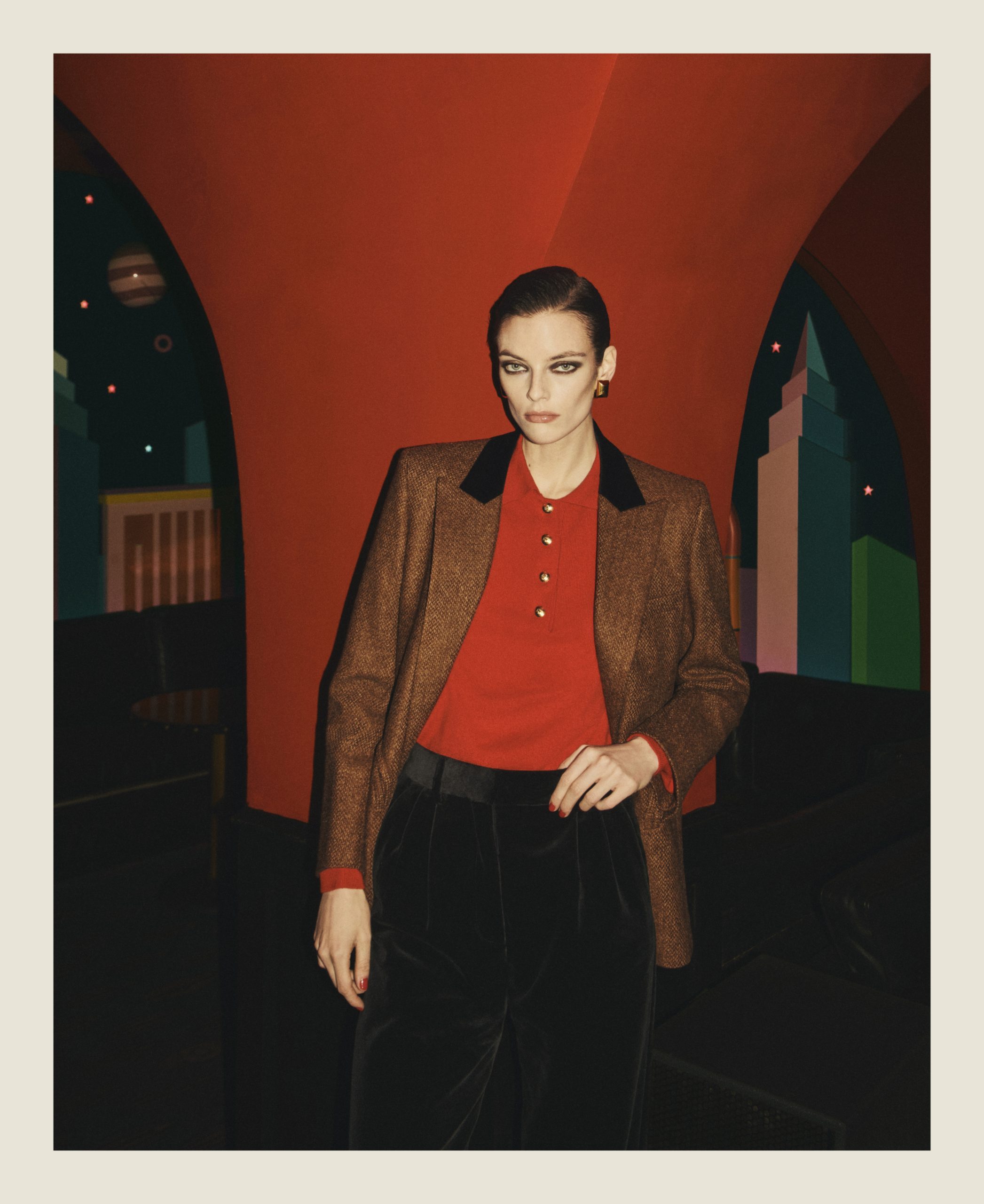 collezione BLAZÉ Autunno/Inverno 2023, che pur sofisticata e borghese, si colora di una nuova sensuale femminilità, perfettamente controbilanciata da tocchi maschili. Con una certa nostalgia vengono rievocate le atmosfere degli anni Ottanta nelle decorazioni scintillanti e nei dettagli preziosi, sottolineando l’appeal notturno della collezione. Il nuovo simbolo del marchio, il cavalluccio marino, fa capolino qua e là – su bottoni metallici, ma anche come piccoli ricami – segnando il nuovo corso del brand. Ruba la scena il modello Heart, che nasce da un classico blazer dall’ampio revers che si trasforma in un abito seducente, arricchito da bottoni metallici. Un pattern di fuochi d’artificio è ricreato con strass sul Chiller blazer in velluto nero abbinato agli ampi pantaloni pantaloni Fox, mentre un ricamo di paillettes dona un effetto materico e sfavillante al Chiller blazer indossato con il top Clyde, ma anche al femminile abito Konik. Il party mood continua con un completo in cui il bolero Gliss bordato di velluto e la minigonna Coci sono proposti in un bouclé multicolore realizzato con fili metallici. Lucide paillettes dalla forma squadrata decorano il top Clyde abbinato alla gonna midi Sussex coordinata, ma anche l’abito monospalla Manipur indossato sotto il nuovo bomber Serama, a ricreare uno dei look più iconici di Jane Birkin. Pensata per danzare tutta la notte, la gonna Appaloosa è ricoperta da una cascata di frange dall’effetto seta, così come la giacca abbinata. Aggiunge un tocco floreale la stampa anni Settanta di Mantero, riproposta su seta per la tuta Clyde indossata con il blazer Everynight coordinato. Per una femminilità più sfrontata, il nuovo cappotto doppiopetto Moroseta e il Gliss bolero in bouclé, abbinato alla minigonna Coci e alla camicia Berber di seta, sono proposti in un’accesa sfumatura rosso fuoco. Al contempo, tonalità anni Settanta di blu oltremare e rame caratterizzano rispettivamente la morbida e avvolgente giacca in faux fur Hunny e il completo con pantaloncini indossato con il blazer Everynight. Lo spirito senza tempo del marchio viene sottolineato dalle polo Highland in maglia, abbinate agli iconici blazer con motivi sartoriali manish, mentre i maglioni Highland – dalle spalle accentuate, scolli a V profondi e piccoli ricami di cavallucci marini – sono intrisi di raffinata sensualità.