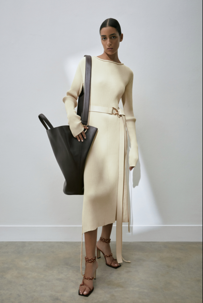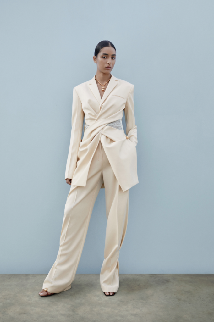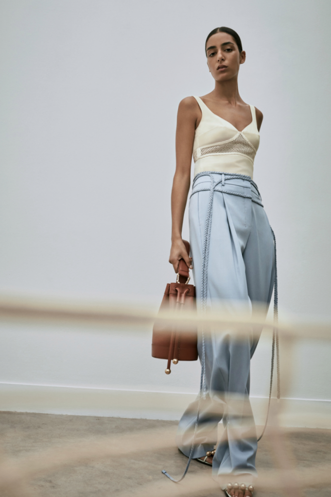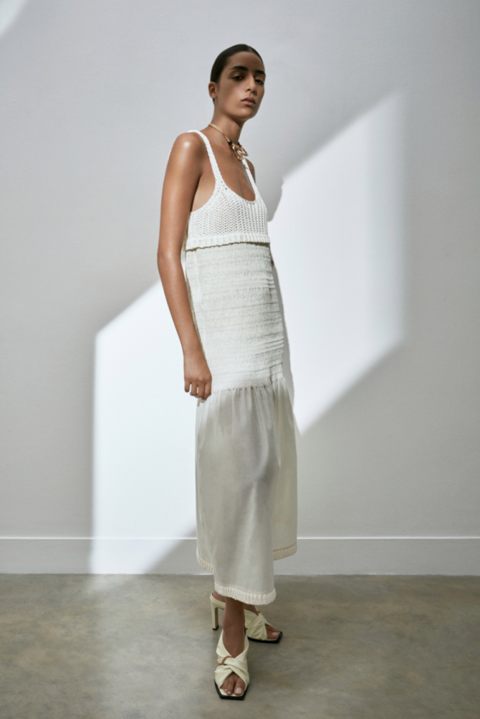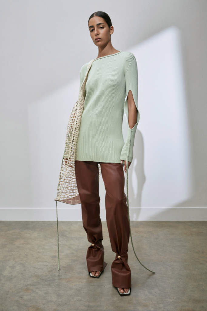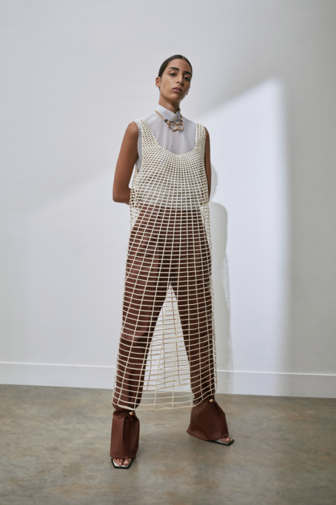Canestri in fili ritorti di cotone diventano pannelli sotto la maglia a coste, ‘twistata’ in vita, o inserti con effetto see-through del corpino e plastron rettangolari della camicia in twill di viscosa pesante.