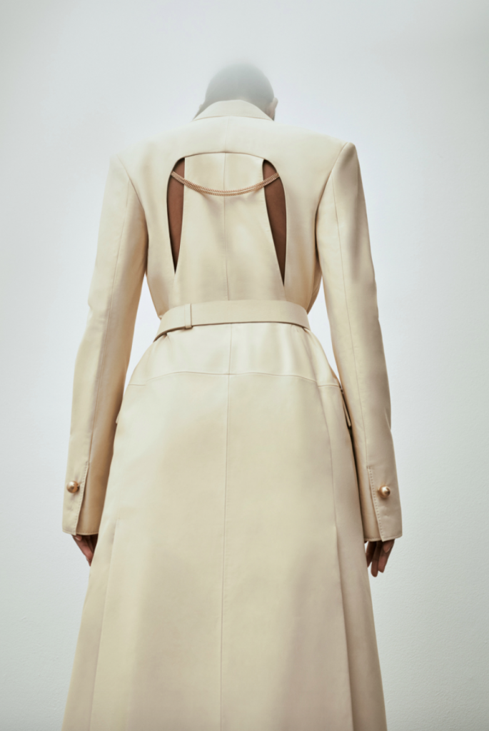 I davanti della giacca si incrociano, lasciando scoperti i fianchi, come tagli cutout mostrano il corpo sulla schiena di abiti, in maglia davanti e tessuto dietro, o di trench con fenditure, sottolineate da martingala di catena sottile.