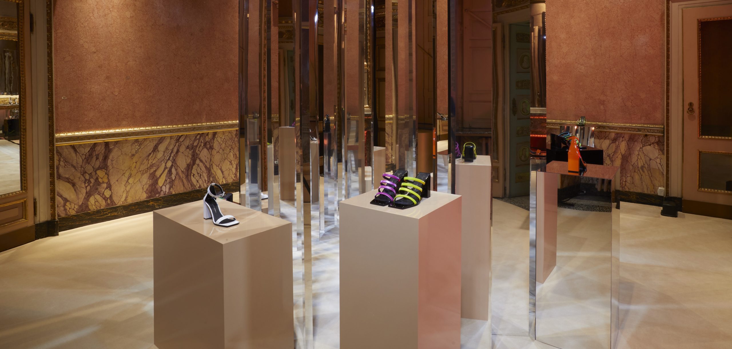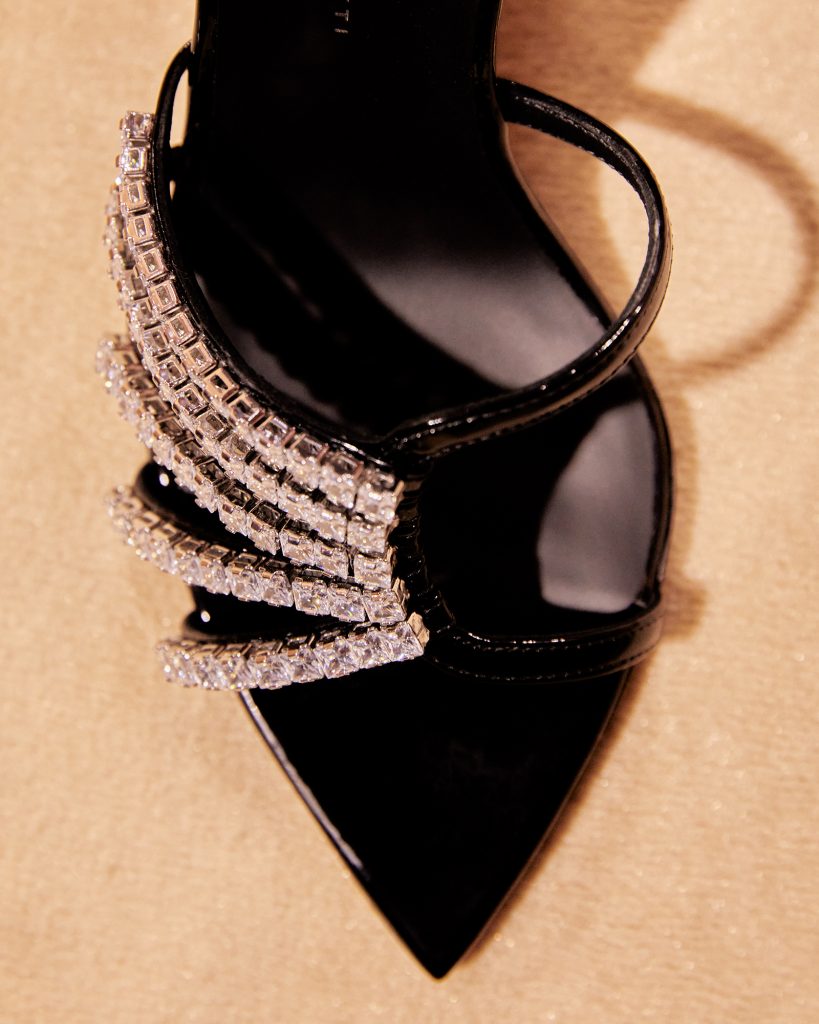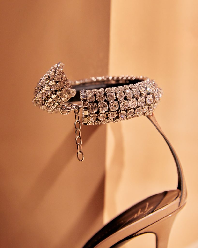 O ancora cavigliere estreme composte da piogge di cristalli multi size che bilanciano modellerie di ispirazione classica, rinnovate dall’audacia delle suole sfilate.
