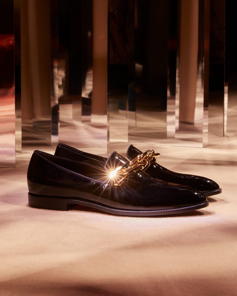 La sera, l’ormai classica tuxedo-loafer in vernice nero viene dissacrata da una maxi chain in oro che la trasforma in una calzatura innovativa ed esclusiva.
