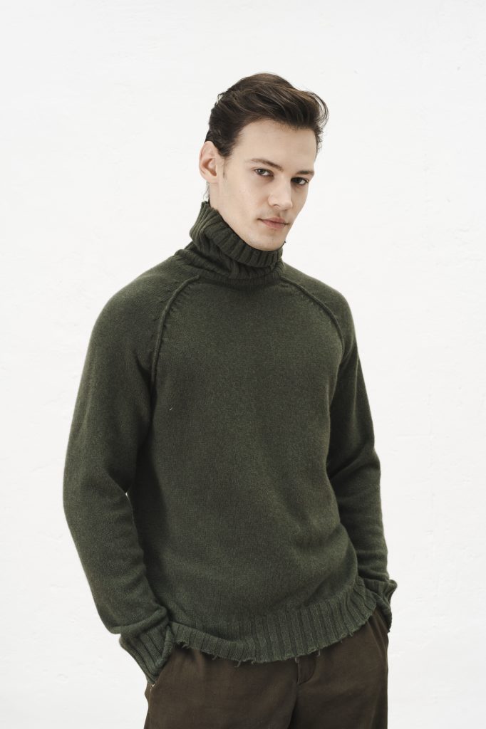 Maglione verdone con collo alto in cashmere rigenerato e lana.