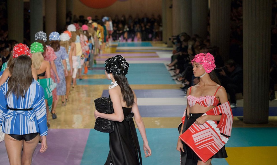 Sfilano prendisole, sottane, ciabattine e completi in spugna, per un’estetica candy, a metà tra Mad Men e The Stepford Wives: largo a bluse, trench e zeppe intagliate, tra fiori e rouches. Un’eleganza raffinata ma anche ricca di sfumature funny, per un’estate da vivere intensamente. E Miuccia Prada riesce a trasportare l’atmosfera estiva sulla passerella, intento dichiarato dalla stessa stilista. Tra le modelle che calcano il catwalk la splendida Gigi Hadid.
