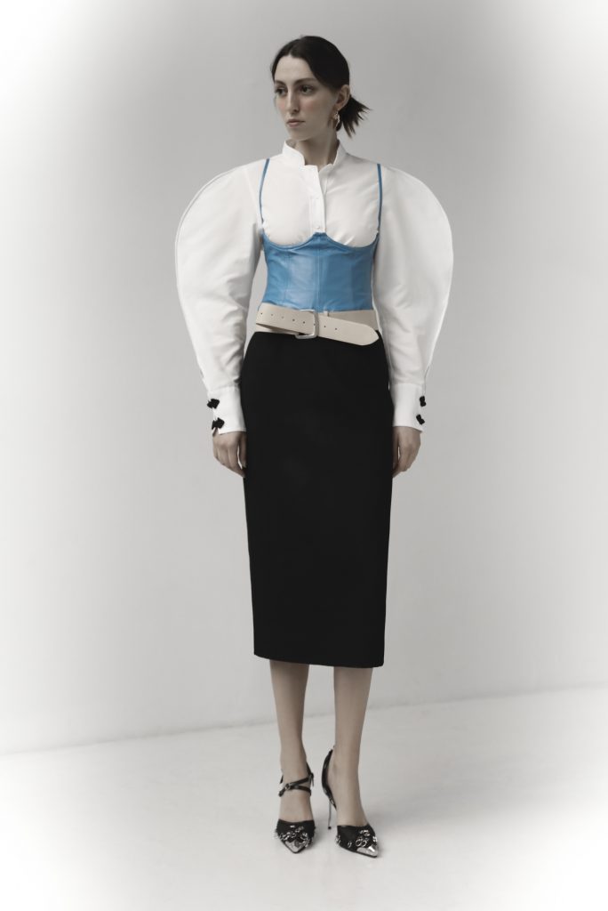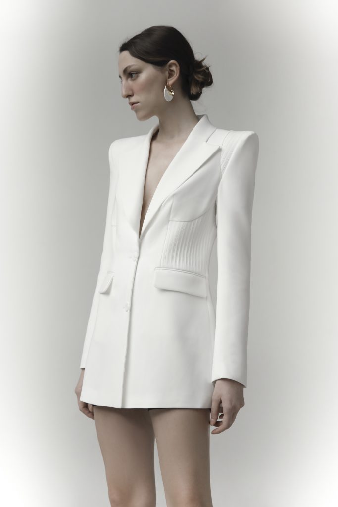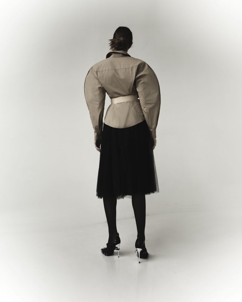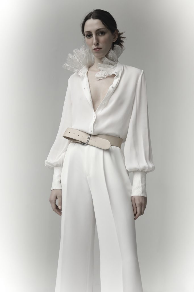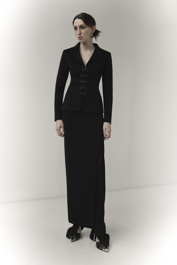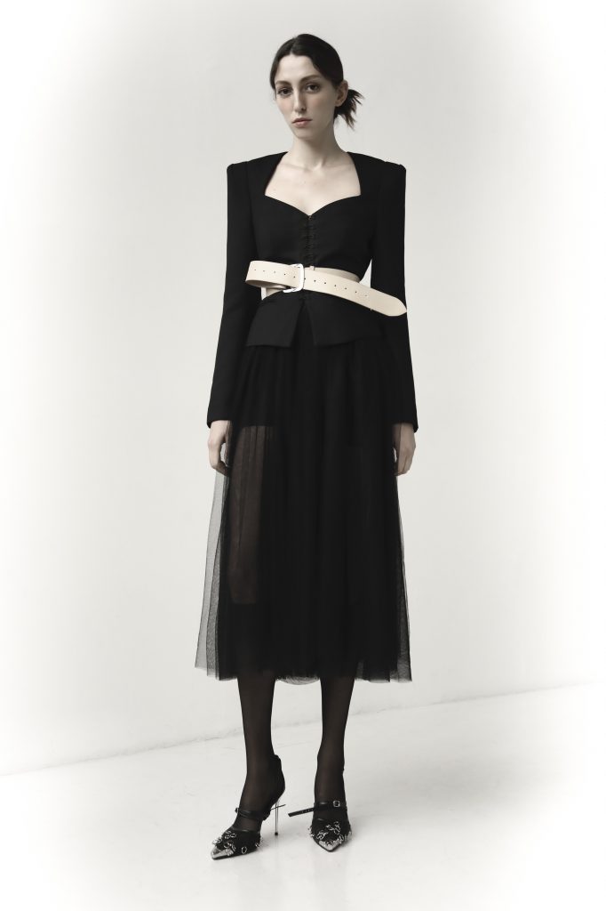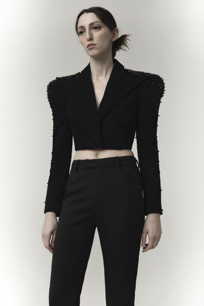 L’importante struttura delle spalle delle giacche e delle camicie, realizzate con una particolare tecnica, i completi attillati e la minigonna con le perline raccontano il carattere della donna di Judy Zhang che si contraddistingue per il coraggio, l’indipendenza e la ricercata sensualità, sempre pronta a lottare per le cose in cui crede anche contro ogni convenzione.