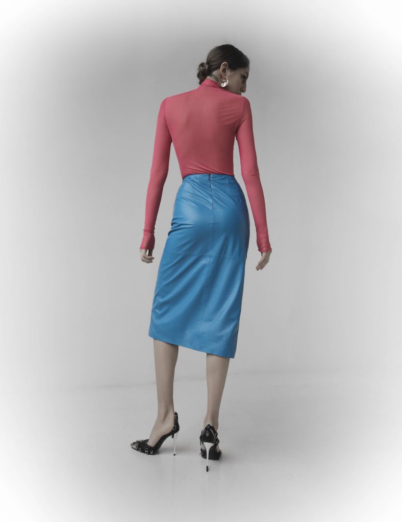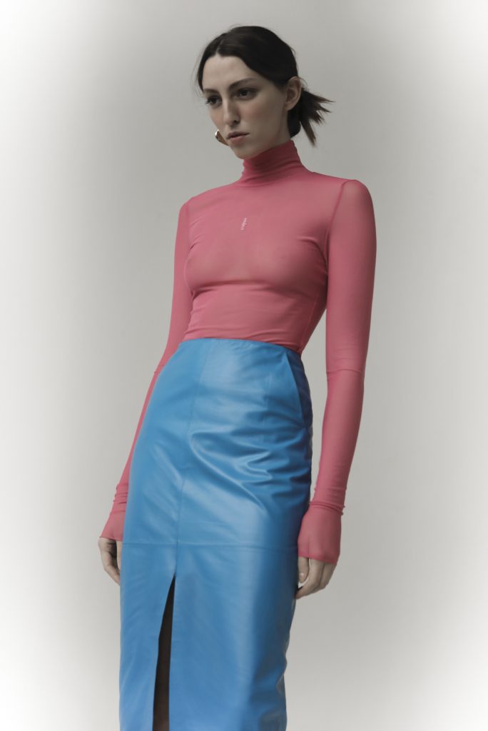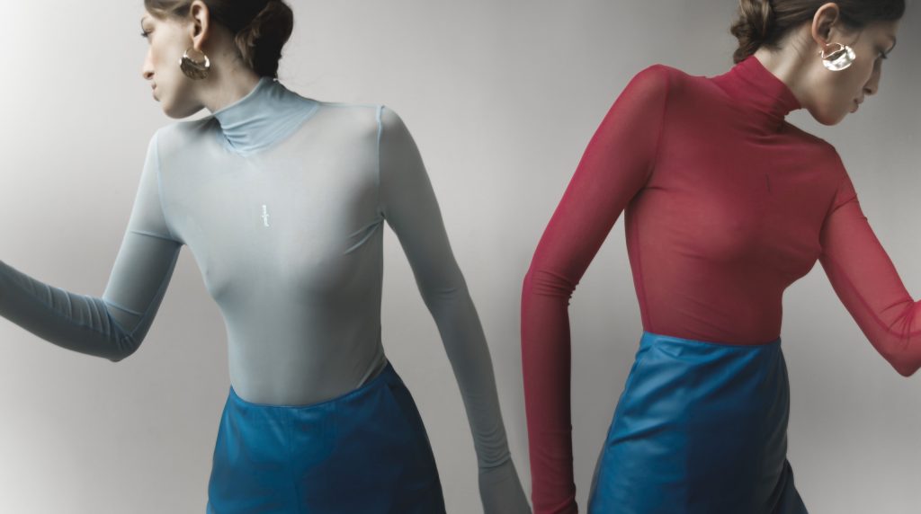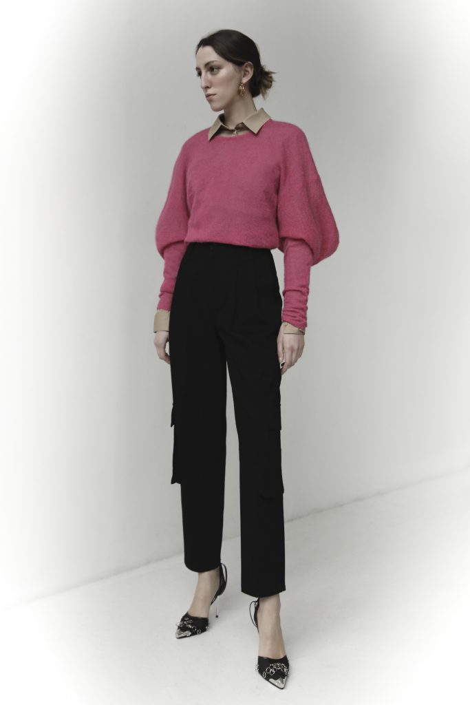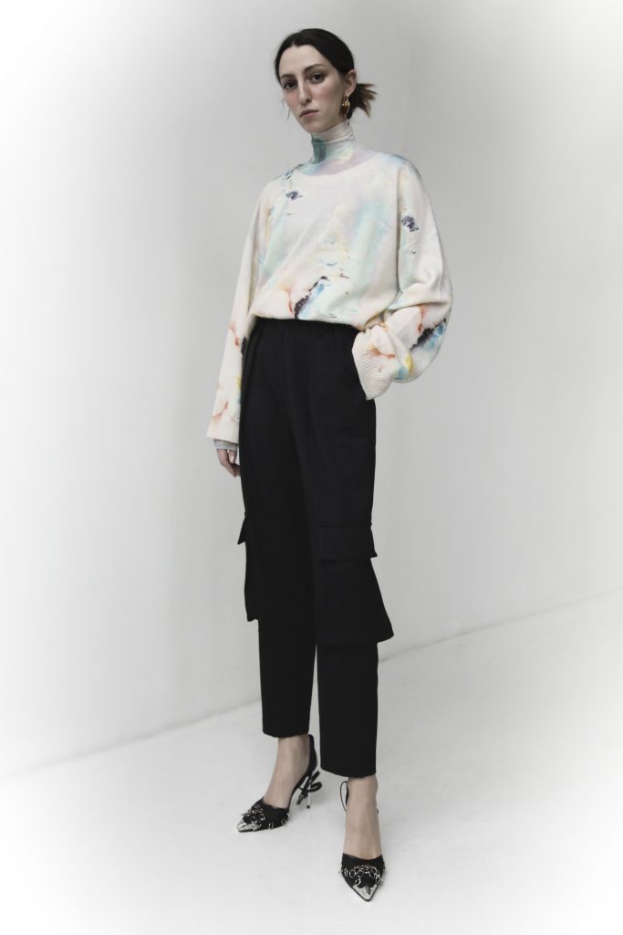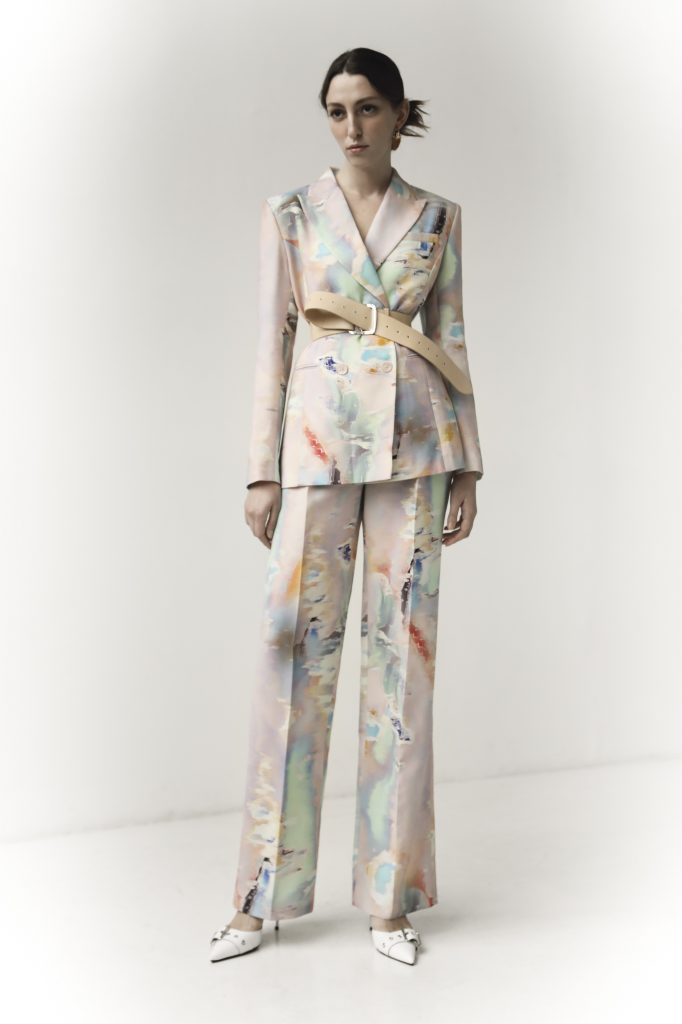 La grafica visiva della collezione è proprio questa macchia cromatica tinta di rosa, verde, azzurro e un pizzico di rosso, e viene scelta per i “suit” dalle silhouette femminili per la sciancratura dei blazer, abbinati con i pantaloni dal taglio maschile e i lupetti super attillati.