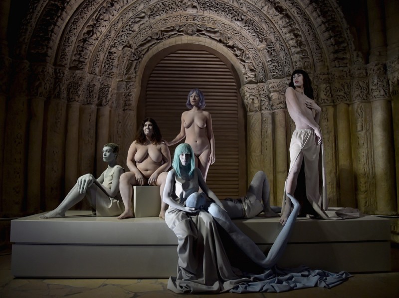 Ad accogliere il defilé è una vera e propria scultura umana composta da performer di ogni tipo: una donna rivestita delle sue grandi curve, un uomo altissimo, un uomo al quale manca un braccio, corpi sproporzionati e truccati ad arte.