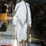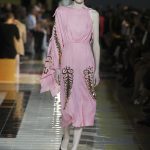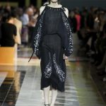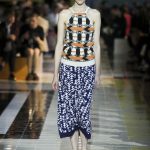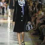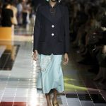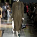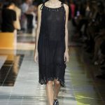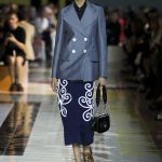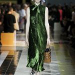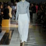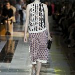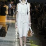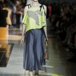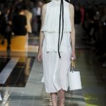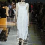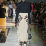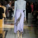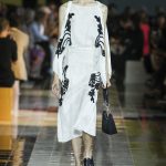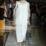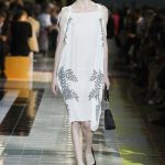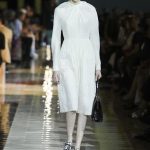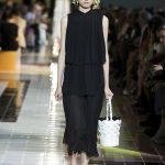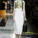 L’impressione è quella di una riduzione all’essenza come antidoto al caos dilagante e ipertrofico che ci attanaglia, alla ricerca di un nuovo classico che si sottragga agli estetismi posticci e che bandisca gli eccessi di un compiacimento retrospettivo e anodino, in nome dello stile che nell’intento della fashion designer deve prevalere sulla volatilità della moda. Il flair che percorre la collezione, non a caso presentata quasi en plein air, con la luce del giorno che sembra inondare la scenografia della grande sala di via Lorenzini, è un nuovo naturalismo frutto di un elaborato processo di realizzazione artigianale. Un processo che affida il compito di definire una nuova accezione del lusso ‘quotidiano’ al carattere apparentemente rustico e naif di certi materiali e lavorazioni. Facciano alcuni esempi: la rafia intrecciata, le conchiglie utilizzate per divertenti collane, le borse shopping fatte di una ‘cage’ di perline di legno, o la nappa che per le gonne a portafoglio asimmetriche è stata tagliata a vivo, trattata come seta e cosparsa di piume stilizzate come in un’illustrazione di Erté (ma riprodotte con un ricamo certosino di microperline).