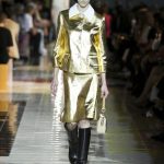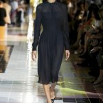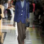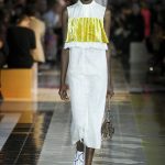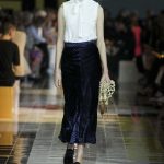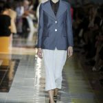 Non mancano, per assemblare un guardaroba oculato ma sempre elegante, i tailleur da mattino dalle nuove calibrate proporzioni virati in antracite o fumo di Londra con la giacca dagli ampi revers sagomati; una mise perfetta per un consiglio di amministrazione come anche per un appuntamento galante. Le borse hanno forme tondeggianti e diventano secchielli oppure si tingono di un rosa acceso quasi pop, e un filo civettuolo, o sono perforate. I sandali sono in pelle intrecciata in turchese, bianco e nero, il tacco è abolito salvo poi a fare capolino (ma si tratta di una struttura decisamente più funzionale) come base solida su cui poggiare i mocassini in spazzolato fumé. E’ già un must il verde lime della tunica sharp longuette di velluto di cotone a coste.