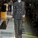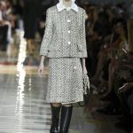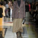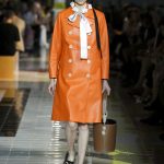 Ogni dettaglio è studiato con meticolosità: dai cappelli di morbida pelle che simulano una cloche e sono chiusi da nastri, ai bavaglini di velluto sfumato che completano gli abiti lineari dalla silhouette geometrica, fino alla modulazione sartoriale dei completi animati da stampe foulard, dei soprabiti in punto stoffa caratterizzati da tessuti compatti jacquard a disegni stilizzati o monocromatici e in tinte squillanti come l’arancio e il verde petrolio.