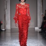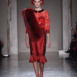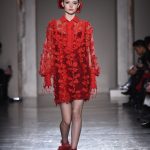 Un lungo abito rosso che poggia su un prato di papaveri, così come i lunghi capelli ramati della protagonista, il fascino di chi domina la scena senza richiederne l’attenzione, la dama non ci guarda, ma siamo noi ad esserne catturati, il grazioso gesto di acconciarsi i capelli, l’incavo delle braccia tese, la nuca verso il basso di chi ammette la propria “innocenza”. Colori e atmosfere che vanno in scena alla sfilata Piccione Piccione per la collezione Autunno Inverno 2018/19.