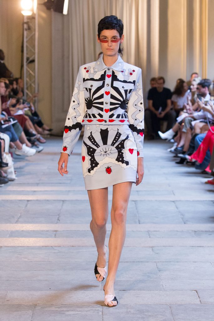Come Peter Max, le tinte di Vivetta sono forti, le figure fiabesche, vediamo nella collezione Primavera Estate 2019 un mondo incantato, fatto di cigni che primeggiano, farfalle, fiori e bocche che aleggiano.