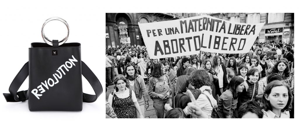 Le forme sono inedite, le linee definite, sono modelli destinati a diventare iconici perché di personalità forte; REVOLUTION compare come un promemoria sulle borse in pelle, le chiusure diventano cinture vere e proprie, alte e spesse come quelle indossate dalle donne nei primi ’70, assieme al pantalone a zampa.
