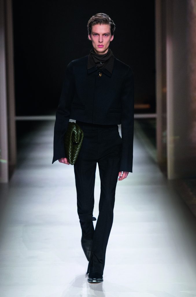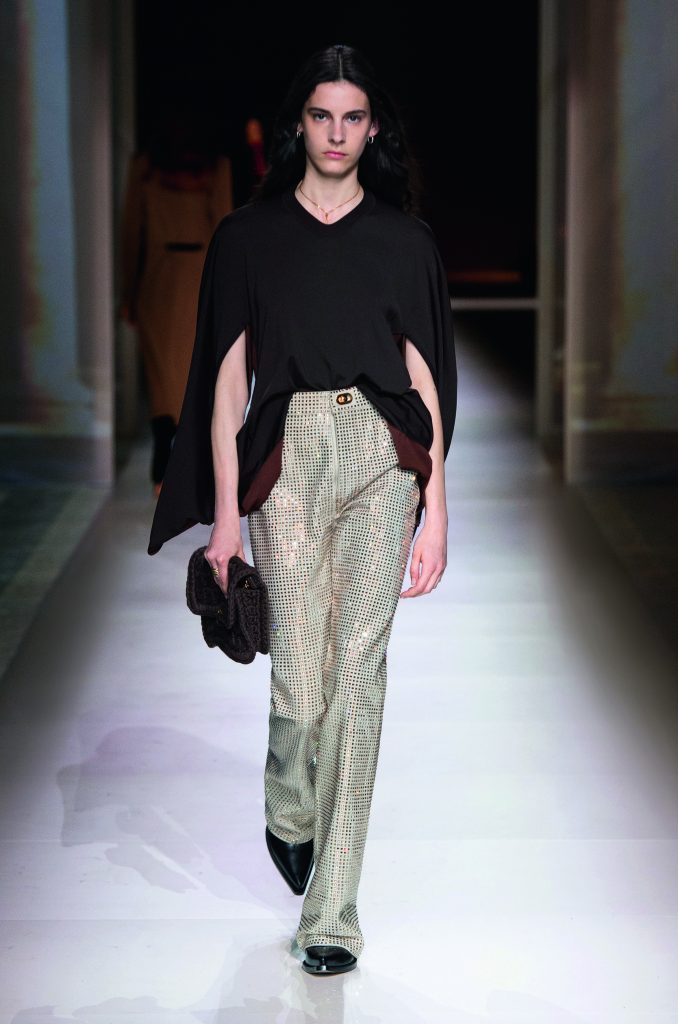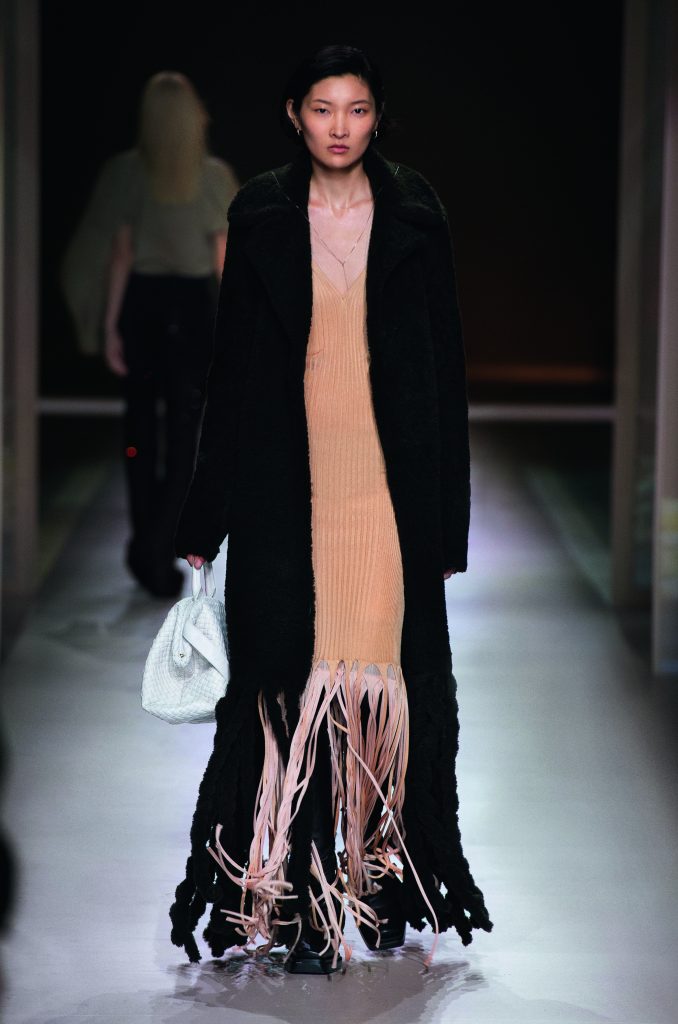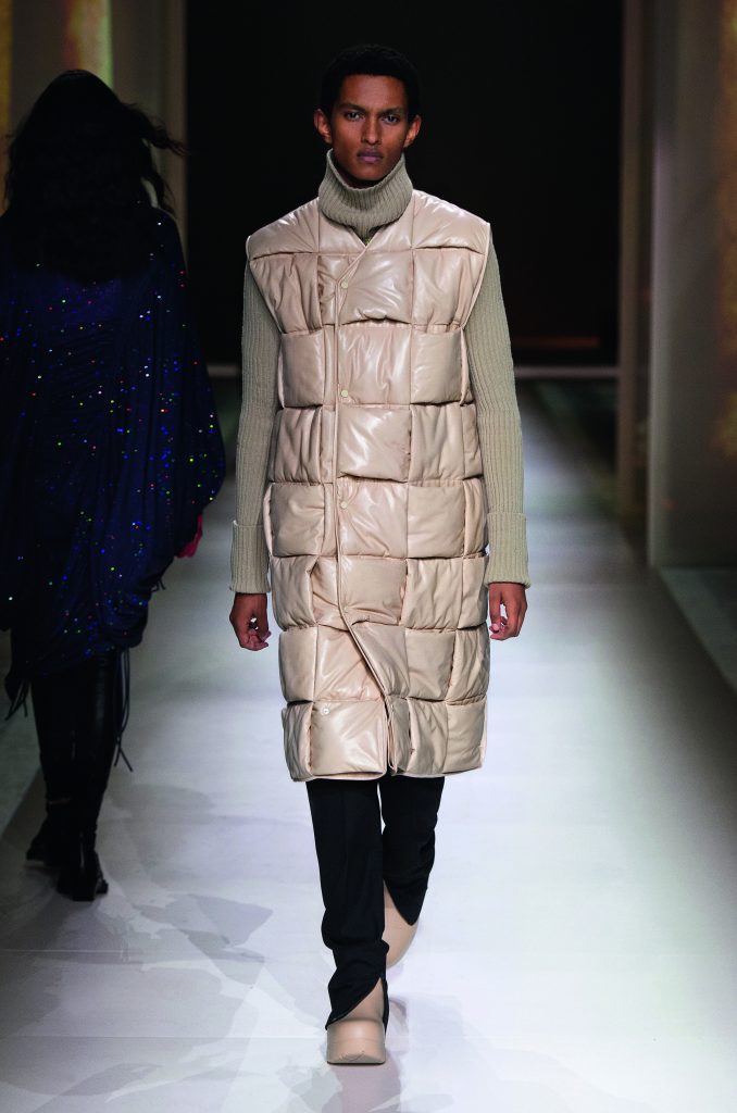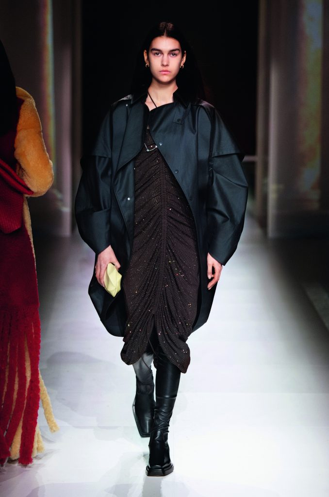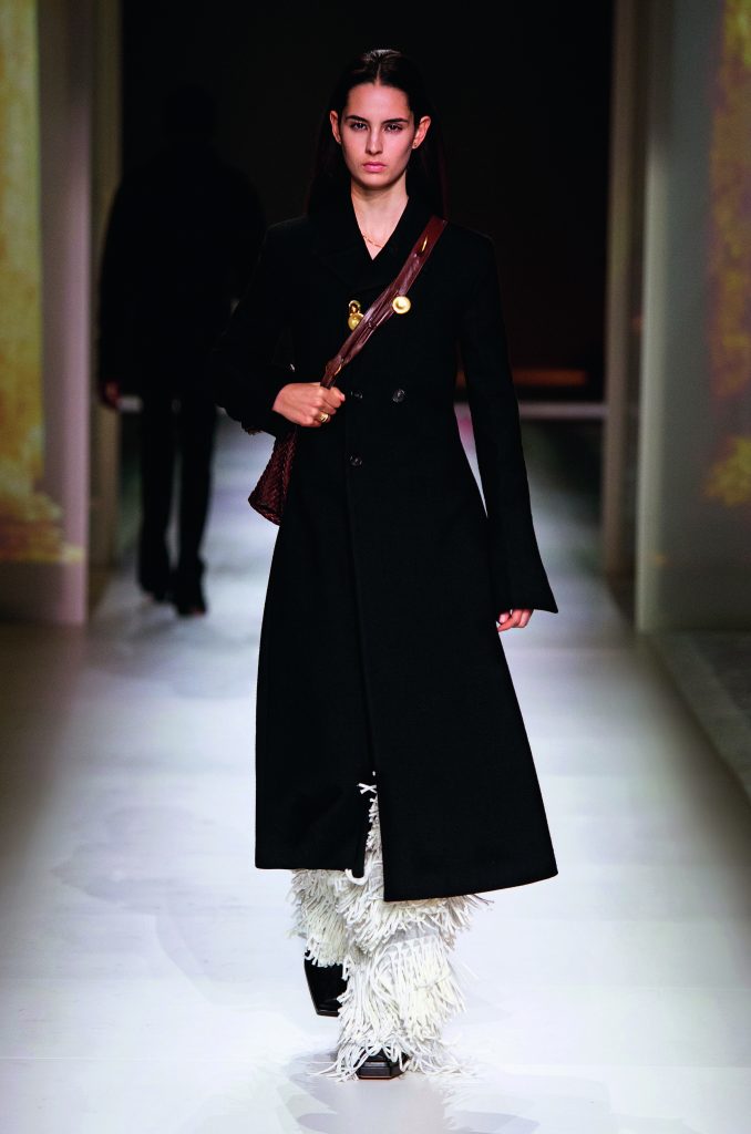 Tutto è solenne ma anche no, pronto a sdrammatizzarsi. Frange anche sui lunghi cappotti di ecofur bicolori mentre le borse lievitano sui fianchi: ampie, capienti come bisacce, voluminose e ludiche, nota ironica e sferzante nei look austeri, ascetici, della sfilata che piacerebbero a un monaco stilita in odore di beatificazione. Si comprende subito che molti capi servono essenzialmente per enfatizzare gli accessori, forza trainante del marchio: ne è passato di tempo da quando la bellissima Lauren Hutton incontrava Richard Gere in ‘American gigolò’ portando la sua inseparabile borsa dalla texture intrecciata firmata Bottega Veneta. Un motivo decorativo che oggi rivive ingigantito in versione 3D, formula insolita a cui dovremo, volenti o nolenti, fare l’abitudine. Un frisson erotico trapela dalla camicia nera per lui ma molto agender completamente see-through secondo un effetto ragnatela disegnato dal crochet.