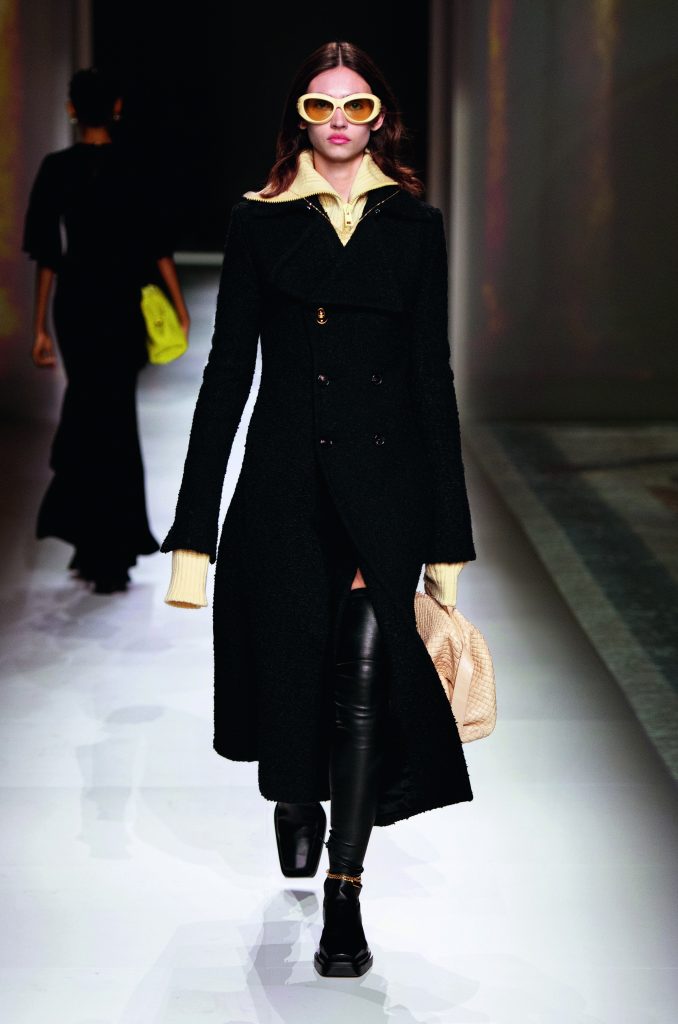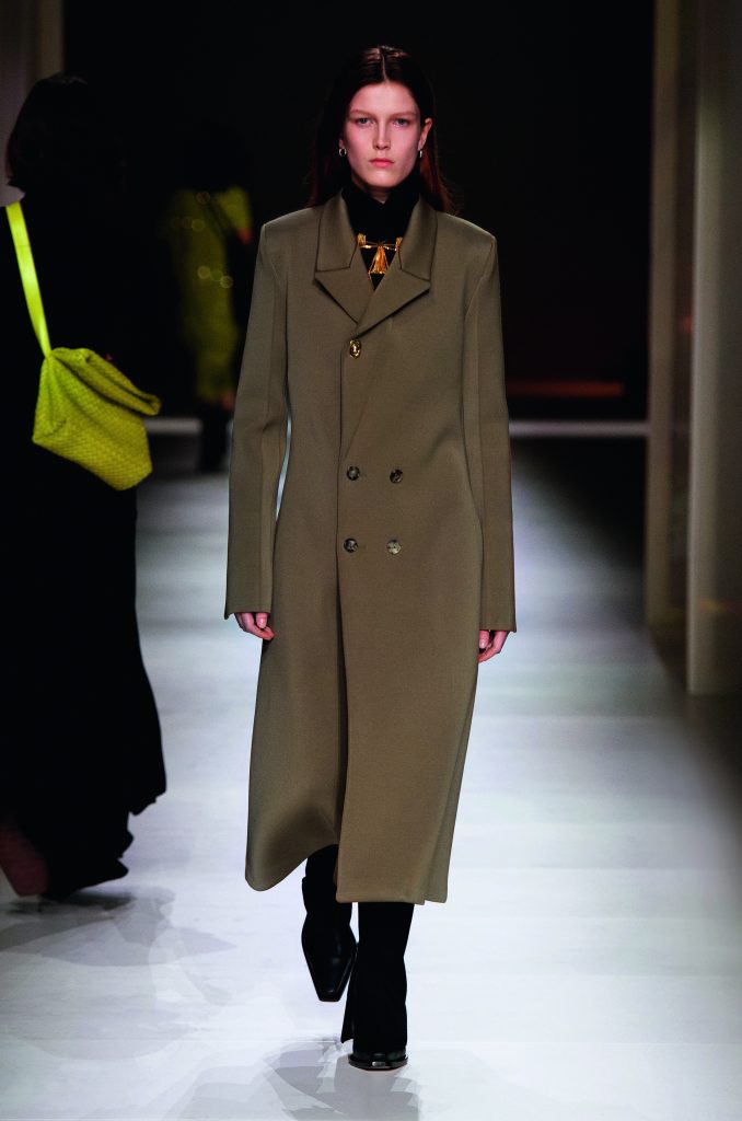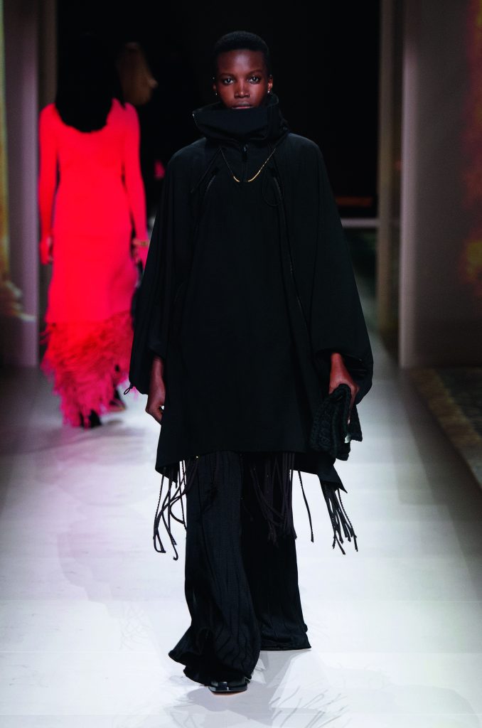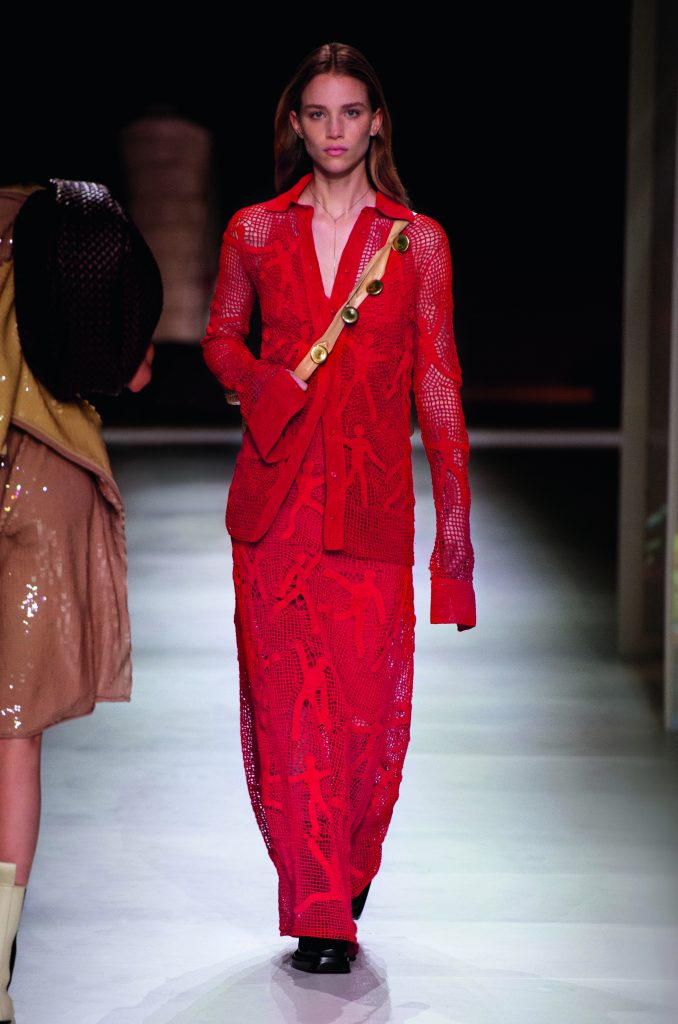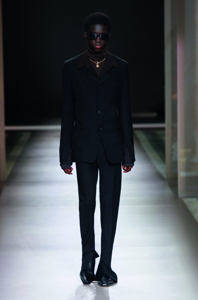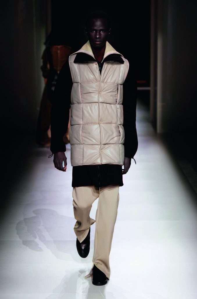 Tutto è solenne ma anche no, pronto a sdrammatizzarsi. Frange anche sui lunghi cappotti di ecofur bicolori mentre le borse lievitano sui fianchi: ampie, capienti come bisacce, voluminose e ludiche, nota ironica e sferzante nei look austeri, ascetici, della sfilata che piacerebbero a un monaco stilita in odore di beatificazione. Si comprende subito che molti capi servono essenzialmente per enfatizzare gli accessori, forza trainante del marchio: ne è passato di tempo da quando la bellissima Lauren Hutton incontrava Richard Gere in ‘American gigolò’ portando la sua inseparabile borsa dalla texture intrecciata firmata Bottega Veneta. Un motivo decorativo che oggi rivive ingigantito in versione 3D, formula insolita a cui dovremo, volenti o nolenti, fare l’abitudine. Un frisson erotico trapela dalla camicia nera per lui ma molto agender completamente see-through secondo un effetto ragnatela disegnato dal crochet.