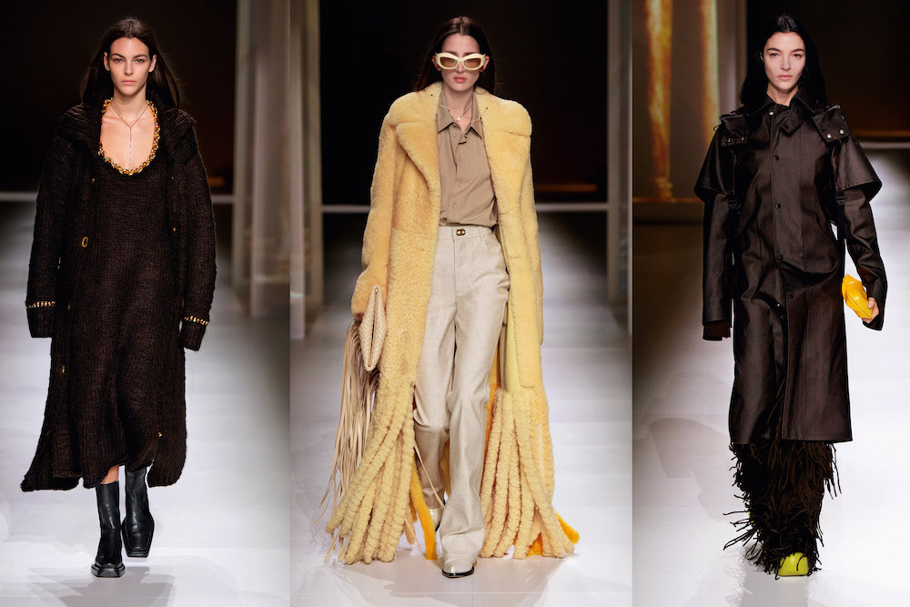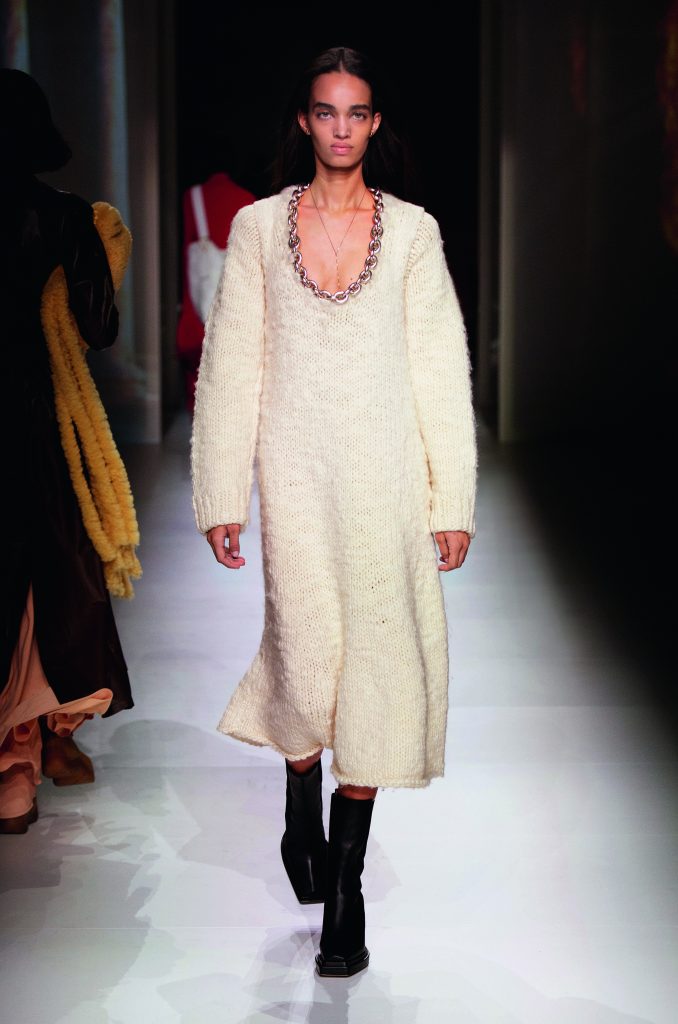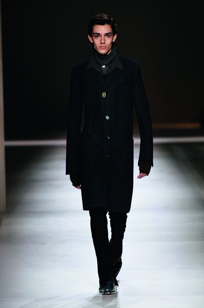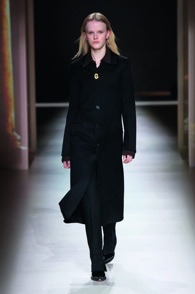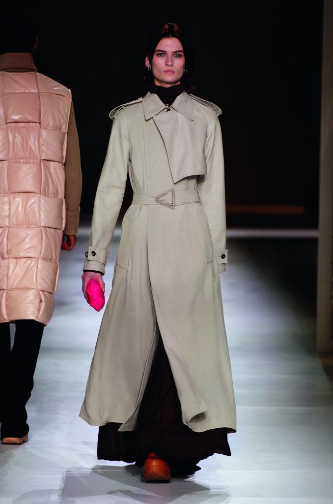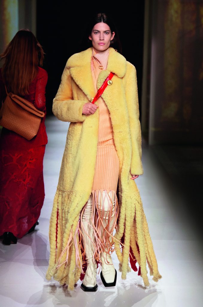 Tutto è solenne ma anche no, pronto a sdrammatizzarsi. Frange anche sui lunghi cappotti di ecofur bicolori mentre le borse lievitano sui fianchi: ampie, capienti come bisacce, voluminose e ludiche, nota ironica e sferzante nei look austeri, ascetici, della sfilata che piacerebbero a un monaco stilita in odore di beatificazione. Si comprende subito che molti capi servono essenzialmente per enfatizzare gli accessori, forza trainante del marchio: ne è passato di tempo da quando la bellissima Lauren Hutton incontrava Richard Gere in ‘American gigolò’ portando la sua inseparabile borsa dalla texture intrecciata firmata Bottega Veneta. Un motivo decorativo che oggi rivive ingigantito in versione 3D, formula insolita a cui dovremo, volenti o nolenti, fare l’abitudine. Un frisson erotico trapela dalla camicia nera per lui ma molto agender completamente see-through secondo un effetto ragnatela disegnato dal crochet.