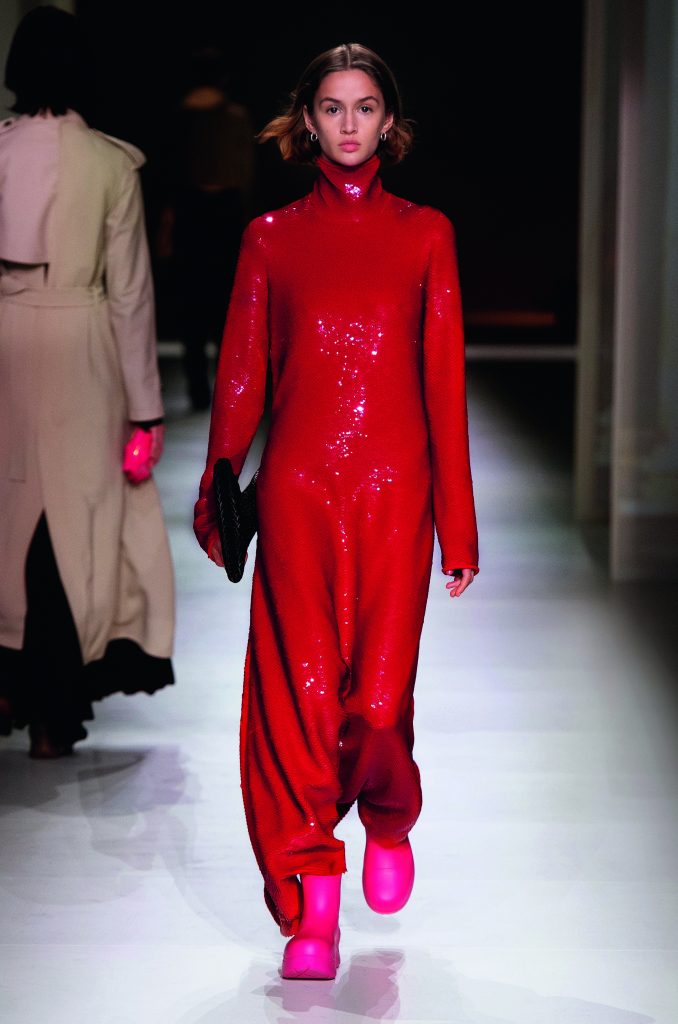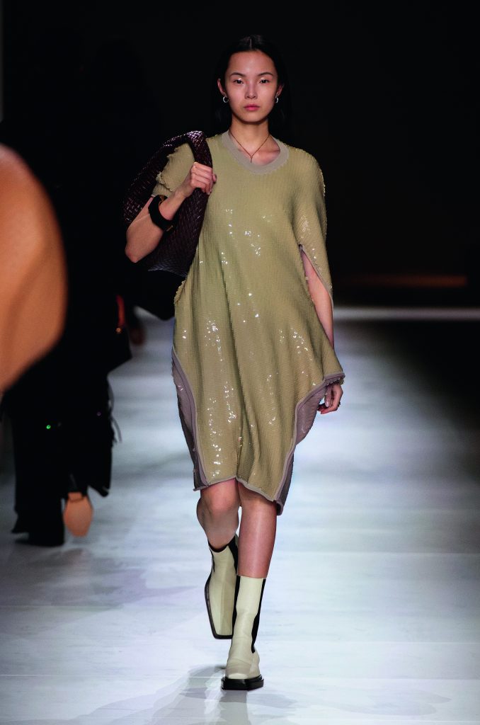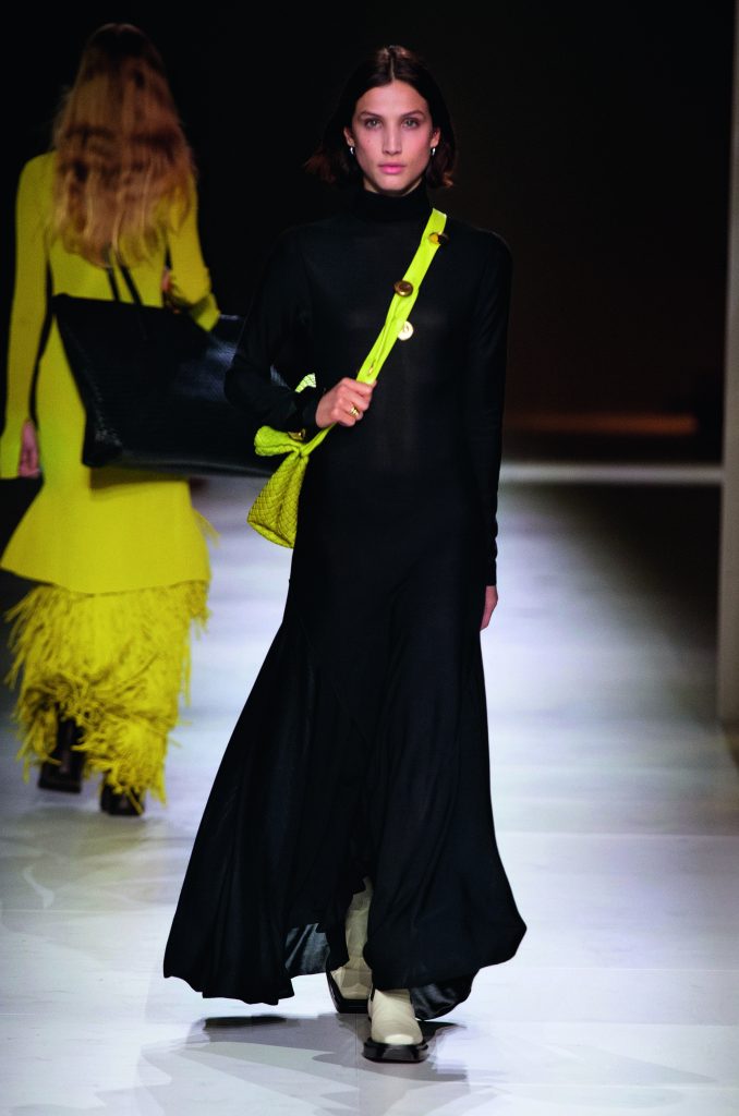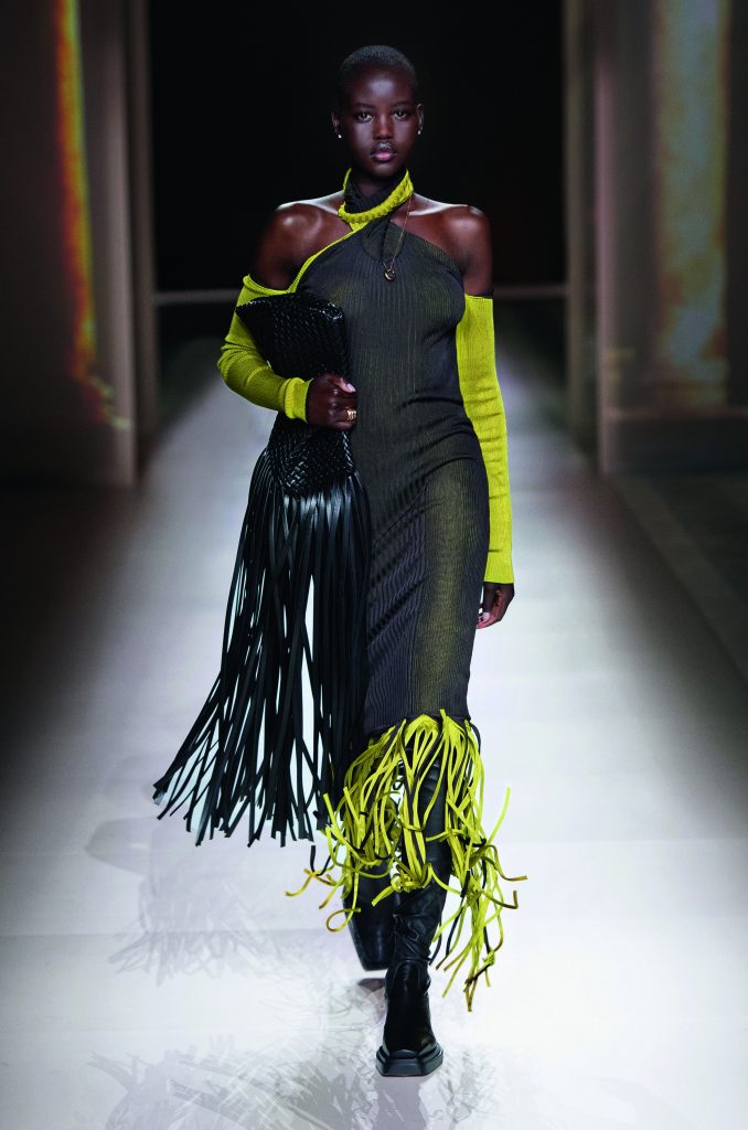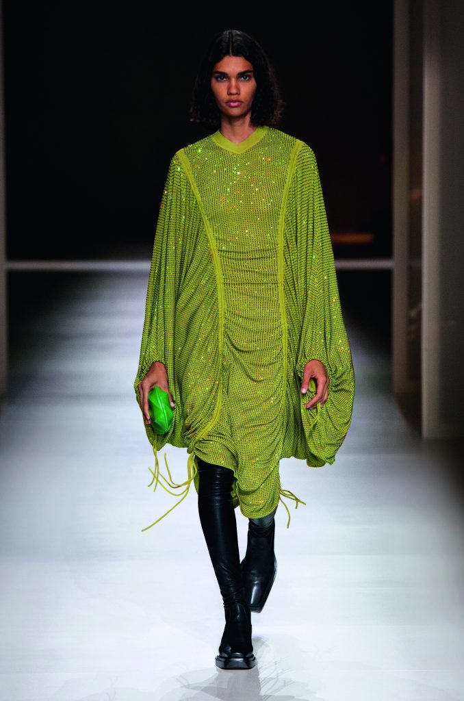 I pantaloni sono per lo più dritti e a vita altissima e qualche giacca succinta assume un taglio volitivo ma civettuolo ‘à la Robespierre’ alternandosi a giacconi di pelo. Interessante questa operazione di restyling chirurgico e a tutto tondo ordita dall’enfant gaté di Bottega Veneta: il glamour asciutto delle sue collezioni è sprigionato perfino dalle campagne pubblicitarie di Tyrone Lebon dove le allusioni a una carnalità tutt’altro che algida risultano palesi, quasi occhieggiando a un mood fetish sulla falsariga di Helmut Newton. Perché come si dice: ‘sex sells’. La sensualità si stempera nel rigore, il vitalismo cromatico nel design più epurato: tutto è molto incisivo e pregnante, poche parole, lasciamo parlare i fatti. E allora via libera alle micro purse verde prato da portare con la tunica ampia da vestale discoglam 4.0 scintillante di cristalli all over, alla enorme borsa oversize da portare a spalla in nappa bianco ottico con macro intreccio, alle scarpe dalla punta quadrata (grande ritorno nineties) e ai tocchi di eleganza sporty ma anche un po’ gipsy come la borsa fluffy in pelle intrecciata tutta ondeggiante di frange, ai piedi stivali marziali o babbucce fluo. Una collezione coraggiosa e assertiva che sembra un drink galvanizzante ad alto tasso etilico: è inebriante per i sensi e la sorbisci tutta d’un fiato.