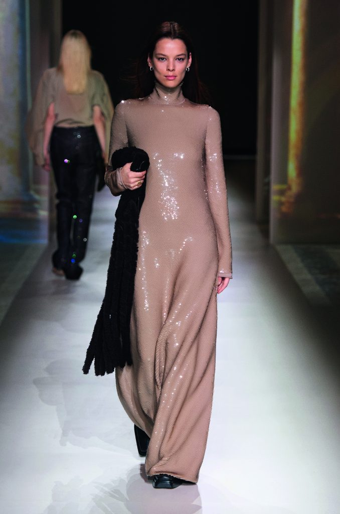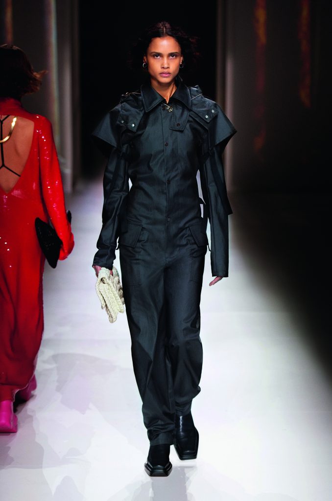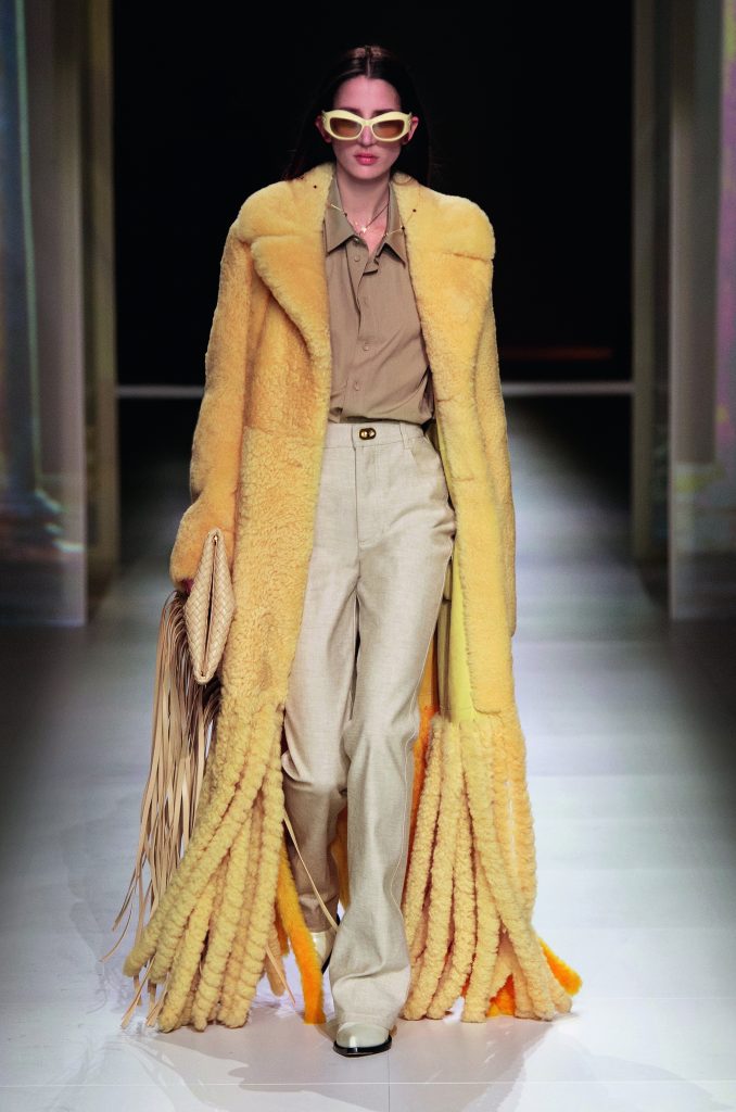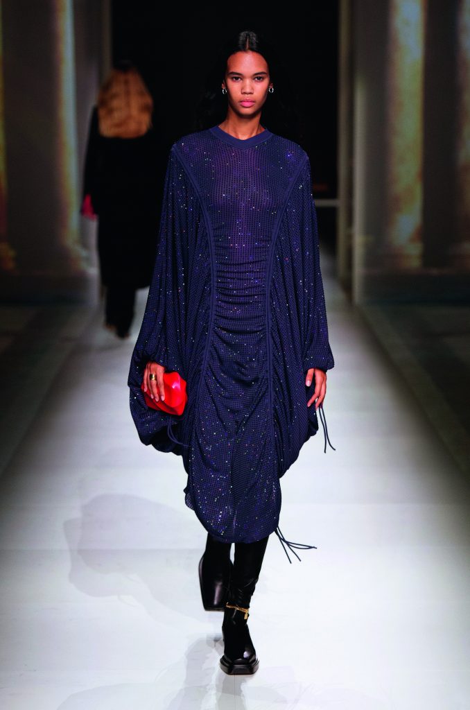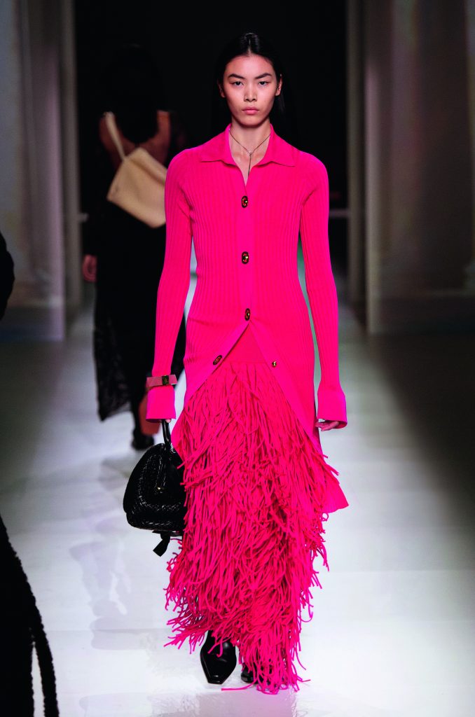 I pantaloni sono per lo più dritti e a vita altissima e qualche giacca succinta assume un taglio volitivo ma civettuolo ‘à la Robespierre’ alternandosi a giacconi di pelo. Interessante questa operazione di restyling chirurgico e a tutto tondo ordita dall’enfant gaté di Bottega Veneta: il glamour asciutto delle sue collezioni è sprigionato perfino dalle campagne pubblicitarie di Tyrone Lebon dove le allusioni a una carnalità tutt’altro che algida risultano palesi, quasi occhieggiando a un mood fetish sulla falsariga di Helmut Newton. Perché come si dice: ‘sex sells’. La sensualità si stempera nel rigore, il vitalismo cromatico nel design più epurato: tutto è molto incisivo e pregnante, poche parole, lasciamo parlare i fatti. E allora via libera alle micro purse verde prato da portare con la tunica ampia da vestale discoglam 4.0 scintillante di cristalli all over, alla enorme borsa oversize da portare a spalla in nappa bianco ottico con macro intreccio, alle scarpe dalla punta quadrata (grande ritorno nineties) e ai tocchi di eleganza sporty ma anche un po’ gipsy come la borsa fluffy in pelle intrecciata tutta ondeggiante di frange, ai piedi stivali marziali o babbucce fluo. Una collezione coraggiosa e assertiva che sembra un drink galvanizzante ad alto tasso etilico: è inebriante per i sensi e la sorbisci tutta d’un fiato.