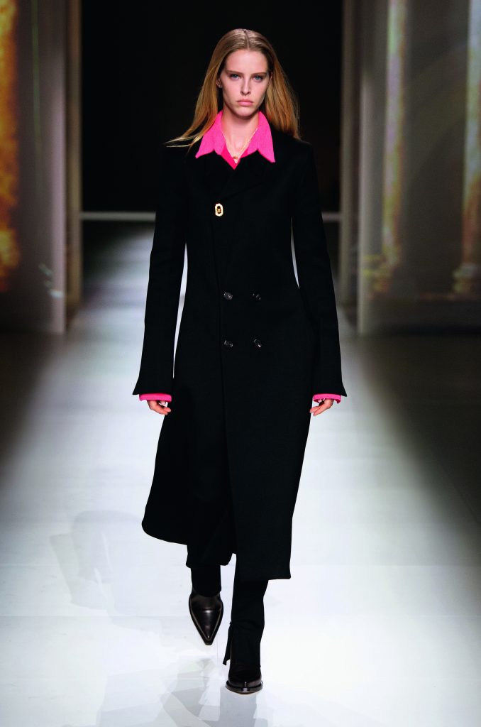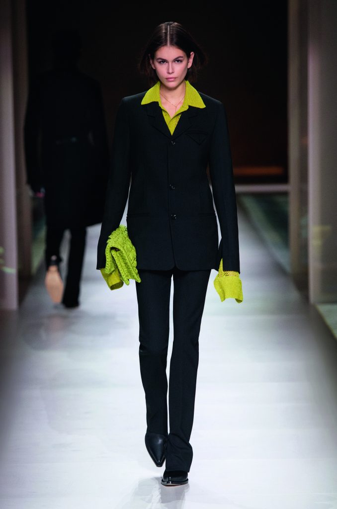 Daniel Lee, nuovo golden boy del gruppo Kering, non ha mezzi termini, sa quello che vuole ed è straight to the point: qualche critico per definire il suo stile ha usato il pomposo termine ‘brutalismo’. Non sappiamo sinceramente se questa definizione possa attagliarsi alle sue proposte ma di sicuro la sua filosofia così nitida e senza fronzoli fa pensare a una rimonta di quel minimalismo anni’90 che ha segnato un intero decennio. I colori sono fluo, accesi, vividi, quasi accecanti: rosso carminio, giallo lime, verde fluo, viola ametista. Gli abiti a volte sembrano paracadute tanto sono drappeggiati e arricciati, altre volte si portano lunghi fino ai piedi seguendo verticalismi briosi. I suit evocano lo stile degli anni’90: Kaia Gerber spunta in pedana con un severo outfit da manager amburghese ma illuminato da colli verde kiwi che sarebbe piaciuto alla Sharon Stone di ‘Sliver’. Il casting maschile è spiazzante: ragazzi efebici, giovanissimi e assolutamente glabri ma con personalità, in linea con il rigore asburgico di certi cappotti a ricordare quasi Helmut Berger in ‘La caduta degli dei’ di Luchino Visconti ma senza indulgere troppo nel dandismo d’antan.