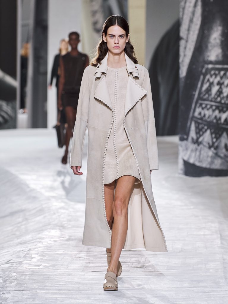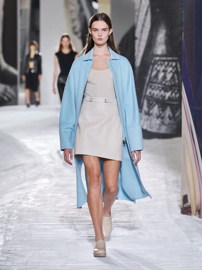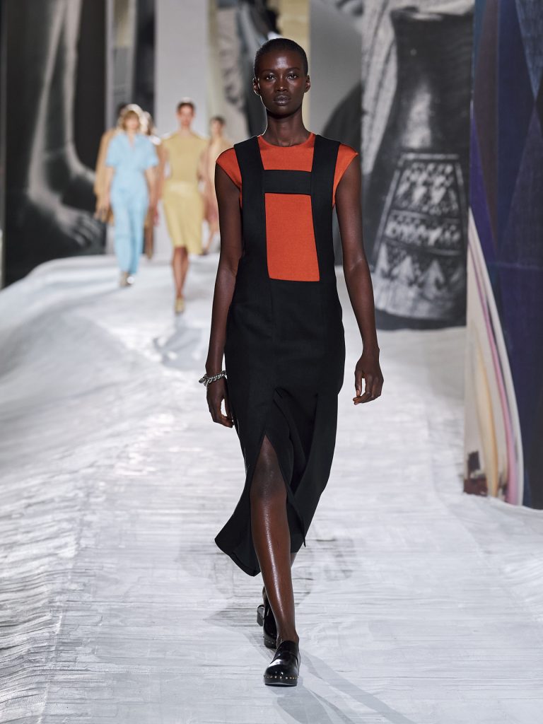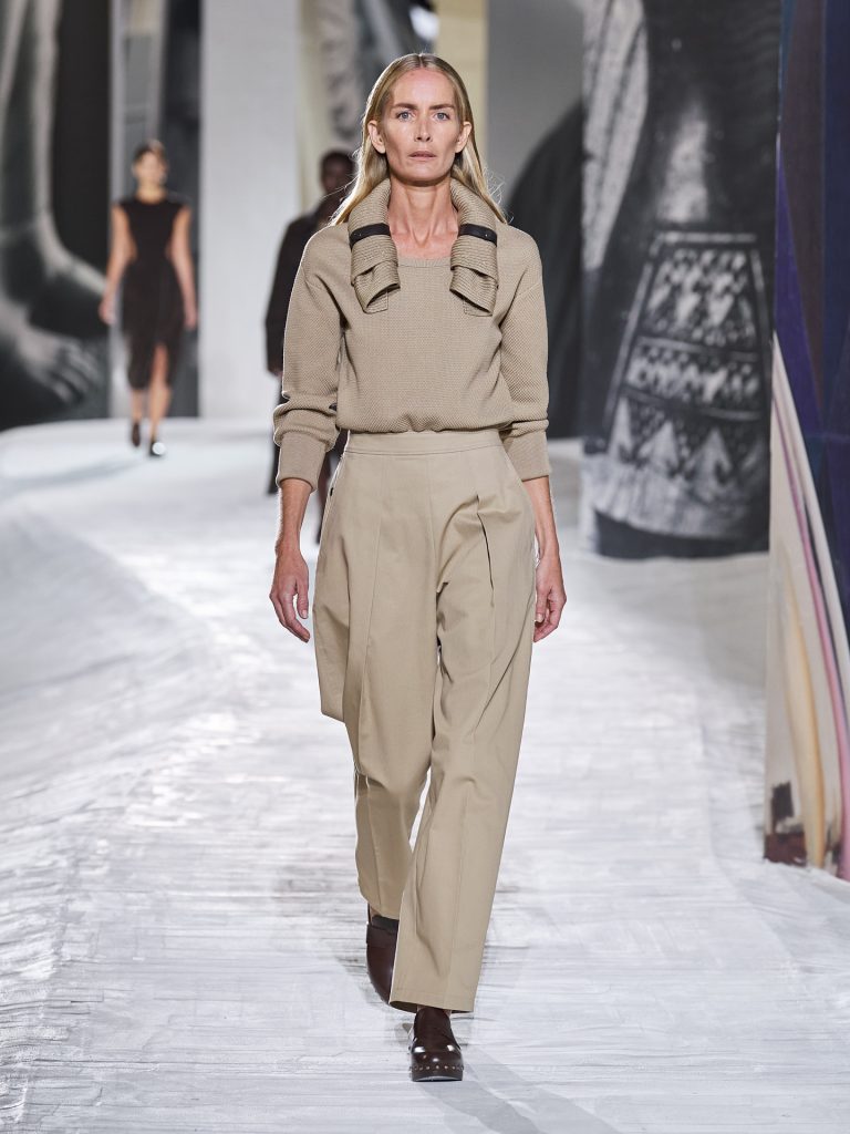 Così in omaggio al suo credo la stilista si rivela un’amante delle emozioni autentiche derivanti da pellami pregiati declinati in linee severe ma anche estremamente sensuali per abiti desiderabili e molto ‘wearable’, elaborati nella lavorazione ma elementari nelle forme e nei tagli. I nuovi accessori must della maison, le clogs ( i confortevoli zoccoli originariamente in legno e con tallone nudo) in pelle lucida come pure le tote e le tracolle dalle forme squadrate, accompagnano i look calibrati dal giorno alla sera. Il fattore più camaleontico del guardaroba primaverile made in Hermès è indubbiamente il grembiule o ‘tablier’, che evoca un clima familiare e domestico molto ‘smartworking’ e che nel corso del défilé si converte prima in top e poi in sensuale pantalone per poi tradursi in morbido coat. La stilista ha inoltre commissionato ad alcuni artisti delle interpretazioni interessanti dei codici iconografici dell’antica Grecia: così le colonne vengono digitalizzate e i soggetti della ceramica ellenica compaiono sui body lavorati a maglia. La stilista ha dovuto annullare la sfilata resort che era stata programmata ad aprile a Londra ma non ha gettato la spugna. La sua è una collezione resiliente e adatta ai tempi correnti in cui non manca però il fashion touch.