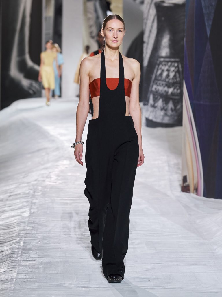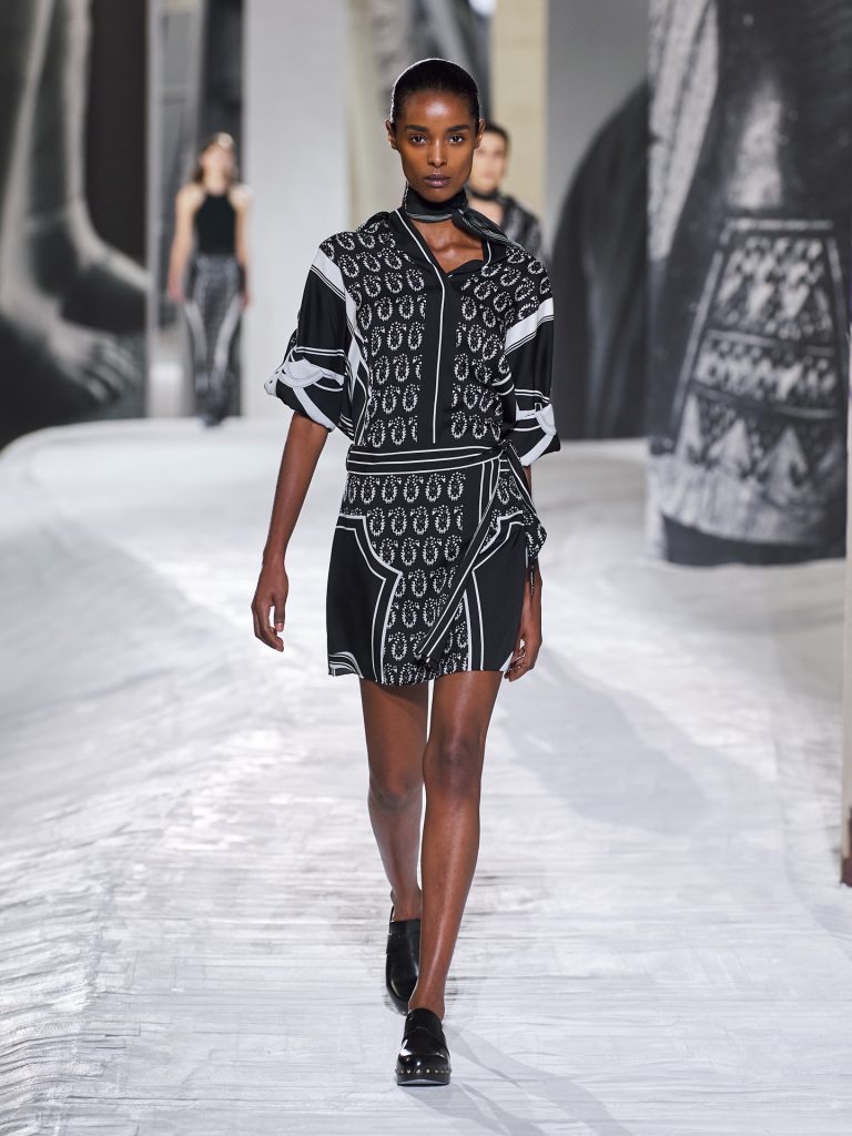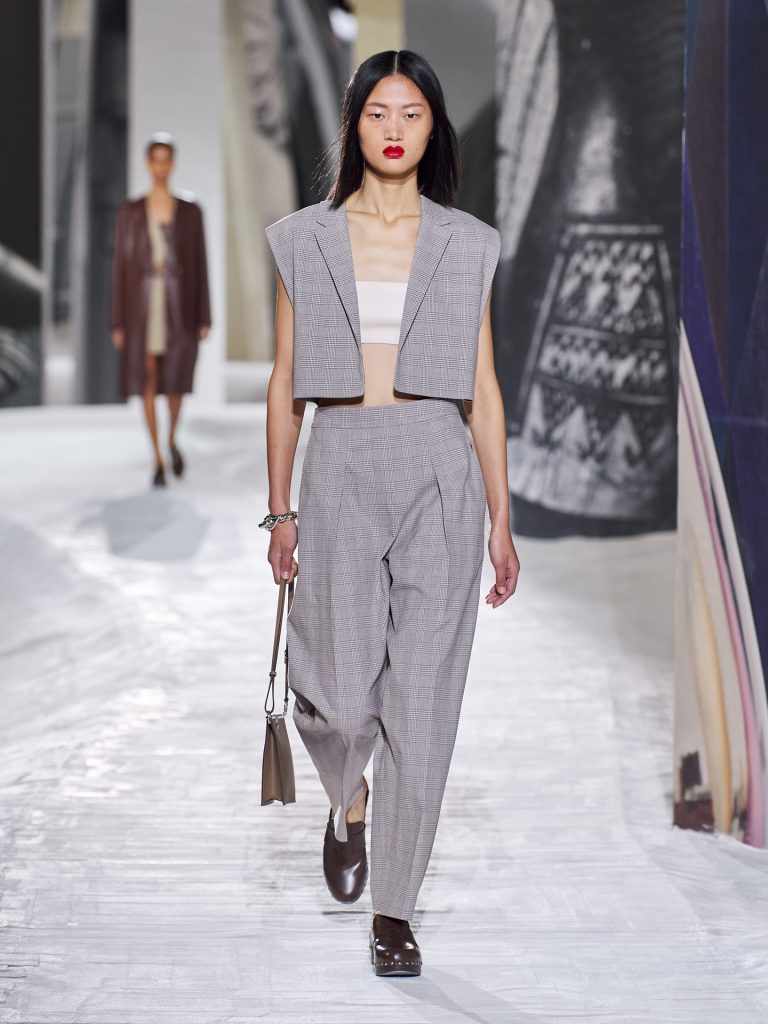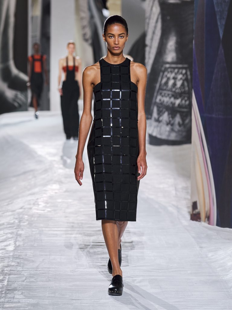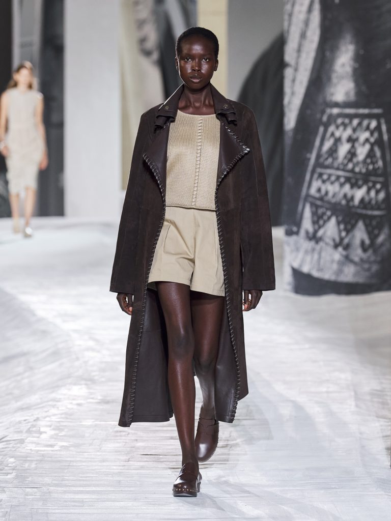Così in omaggio al suo credo la stilista si rivela un’amante delle emozioni autentiche derivanti da pellami pregiati declinati in linee severe ma anche estremamente sensuali per abiti desiderabili e molto ‘wearable’, elaborati nella lavorazione ma elementari nelle forme e nei tagli. I nuovi accessori must della maison, le clogs ( i confortevoli zoccoli originariamente in legno e con tallone nudo) in pelle lucida come pure le tote e le tracolle dalle forme squadrate, accompagnano i look calibrati dal giorno alla sera. Il fattore più camaleontico del guardaroba primaverile made in Hermès è indubbiamente il grembiule o ‘tablier’, che evoca un clima familiare e domestico molto ‘smartworking’ e che nel corso del défilé si converte prima in top e poi in sensuale pantalone per poi tradursi in morbido coat. La stilista ha inoltre commissionato ad alcuni artisti delle interpretazioni interessanti dei codici iconografici dell’antica Grecia: così le colonne vengono digitalizzate e i soggetti della ceramica ellenica compaiono sui body lavorati a maglia. La stilista ha dovuto annullare la sfilata resort che era stata programmata ad aprile a Londra ma non ha gettato la spugna. La sua è una collezione resiliente e adatta ai tempi correnti in cui non manca però il fashion touch.