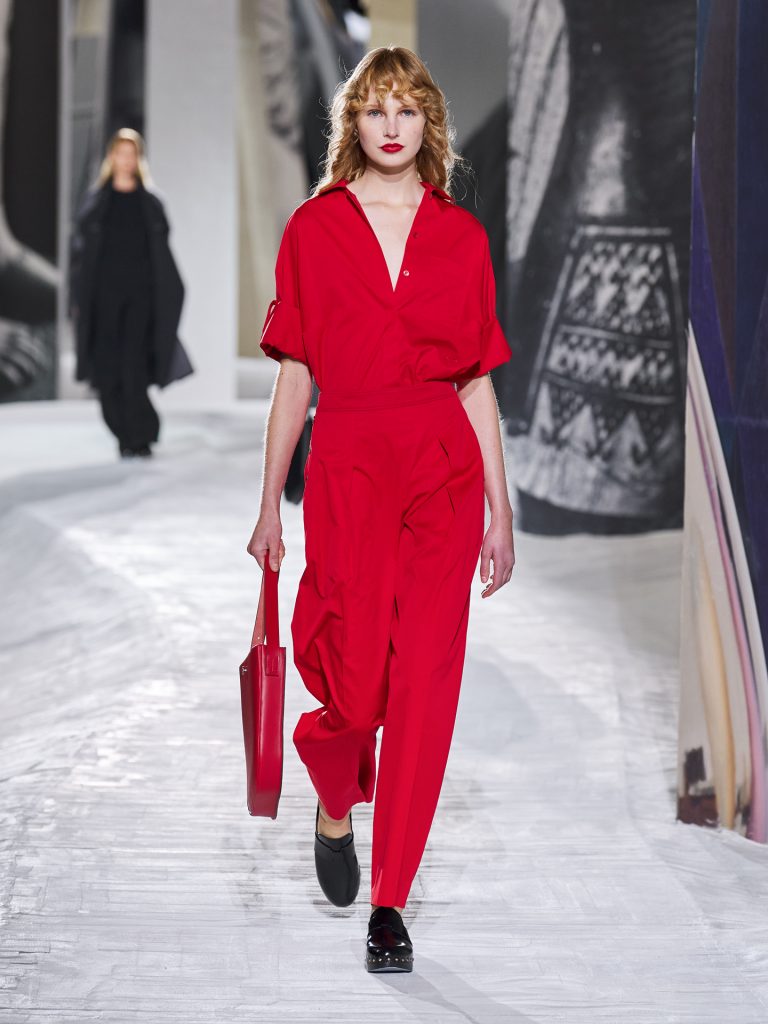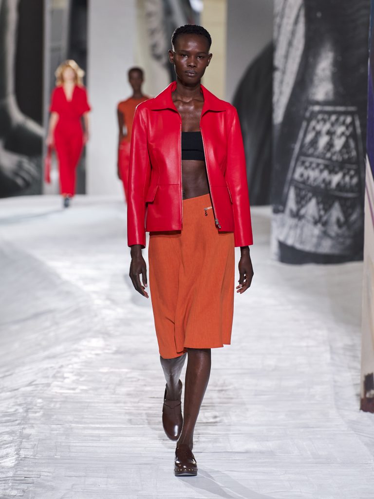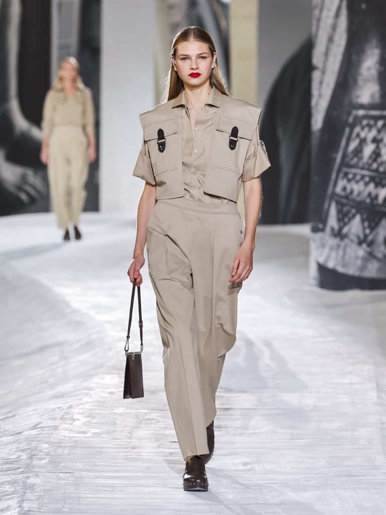 Così le giacche si abbreviano mostrando una vocazione alla costruzione cropped (adoriamo) mentre il gilet adotta una forma singolare mutuando dal look safari il suo stile chic ma funzionale al tempo stesso molto Nicole Kidman in ‘Australia’. Divertente la cage di pelle a quadri da portare secondo la stilista su un minidress di maglia in tinta, un’idea che sembra strizzare l’occhio al concetto moderno di armatura urbana e che si porta da mane a sera. Al crepuscolo la tuta in nero di cadì si apre a sorpresa su body in raso scarlatto. La palette sobria e morigerata, talora illuminata da sprazzi di colori strong come il rosso lacca, riflette lo spirito della collezione rassicurante e pragmatica. Hermès si conferma, anche grazie a quest’ultimo statement di stile, un marchio che a differenza di tanti altri, non punta affatto sulla comunicazione fine a sé stessa e su un deplorevole storytelling arcitrito e molto ‘social’, bensì su contenuti solidi e perennial e su un heritage importante che ne definisce l’incommensurabile valore. Zero fuffa quindi e tanti fatti e bellissimo prodotto di cui abbiamo davvero bisogno, una ricetta che non può che convincere. I tempi di Gaultier, ohimé, sono ormai archiviati perché forse quella grandeur sartoriale e quella eclatante inventiva in un momento come questo non hanno più ragion d’essere, anche se la creatività è sempre stata un potente paracadute in tutte le crisi. Ma tant’é. Per noi avanti tutta anche così.