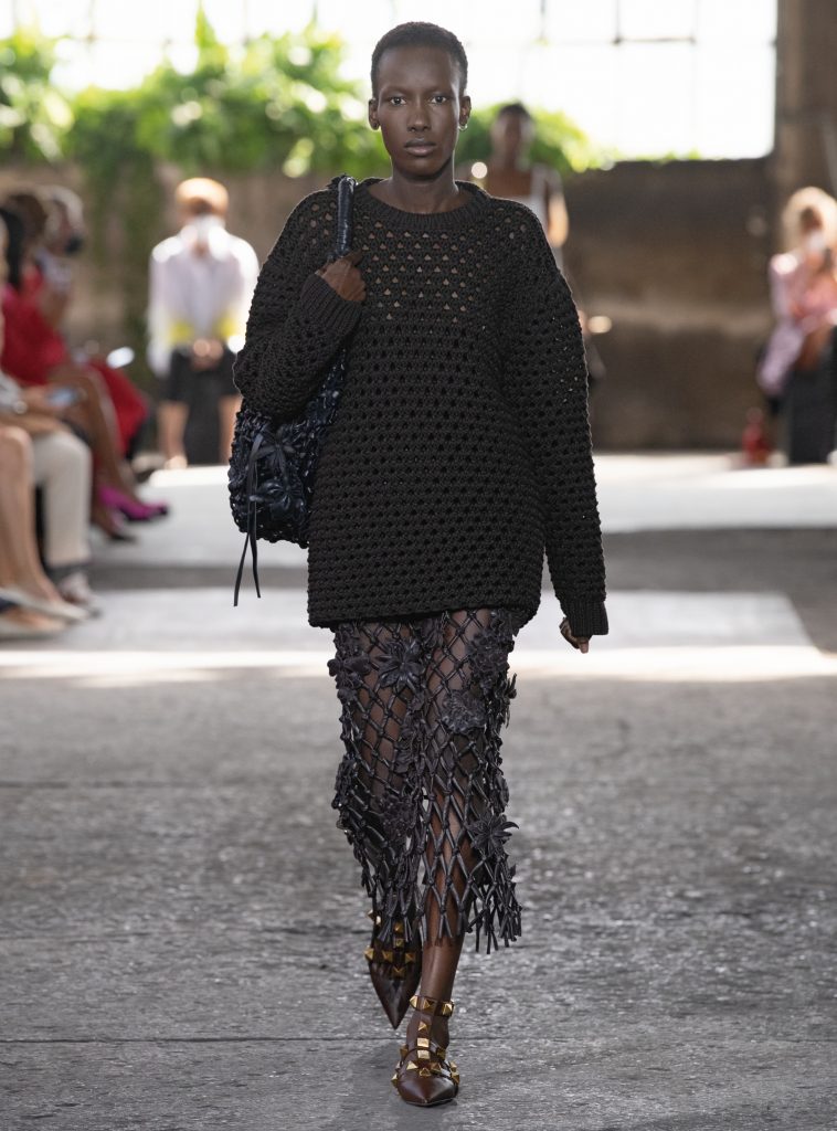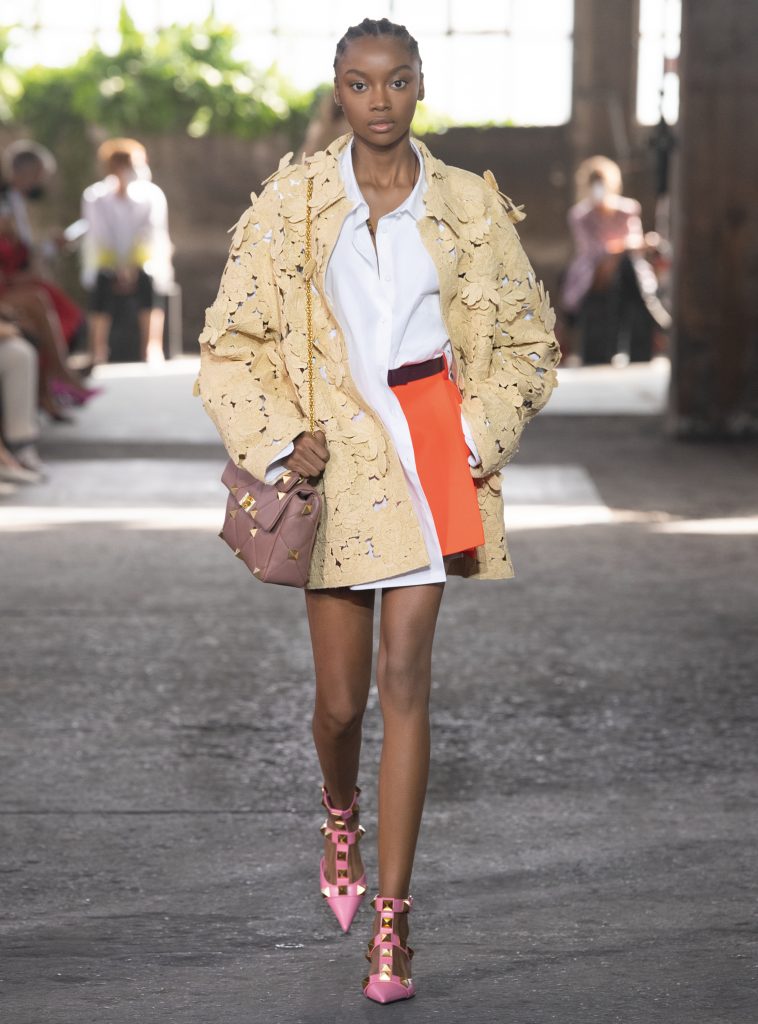 Anche le bluse maschili sono declinate in aereo chiffon. E la couture diventa craft, artigianalità da vivere nel quotidiano. Gli accessori di punta del brand capitolino soffrono di gigantismo: la rose bag, che ha esordito nel défilé autunno-inverno 2020-21, assume dimensioni maxi, le bags di collezione hanno una allure materica, grandi fiori sbocciano sui sandali, le ormai iconiche rockstud, assurte a talismani di eleganza moderna, si alternano ai boots dalla presenza assertiva. La sera si accende di una luce che fende le tenebre.