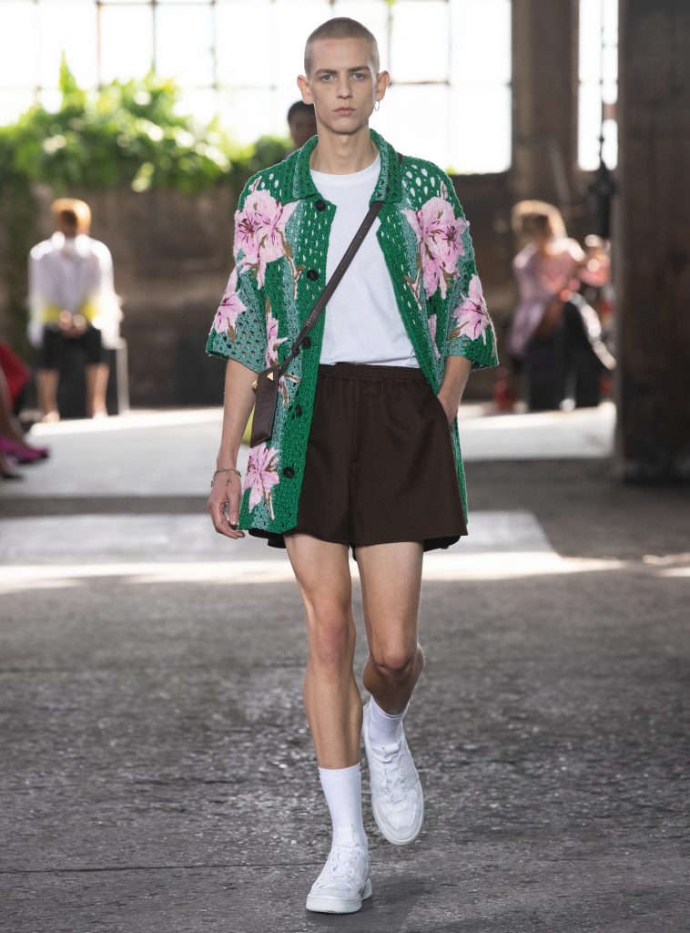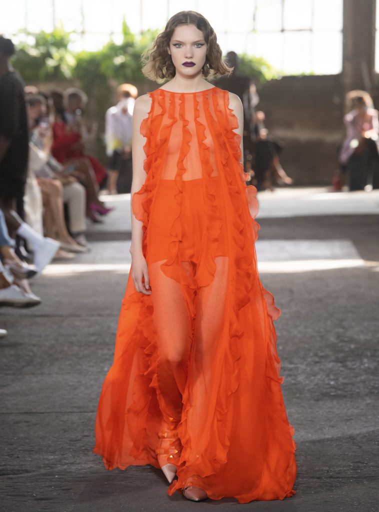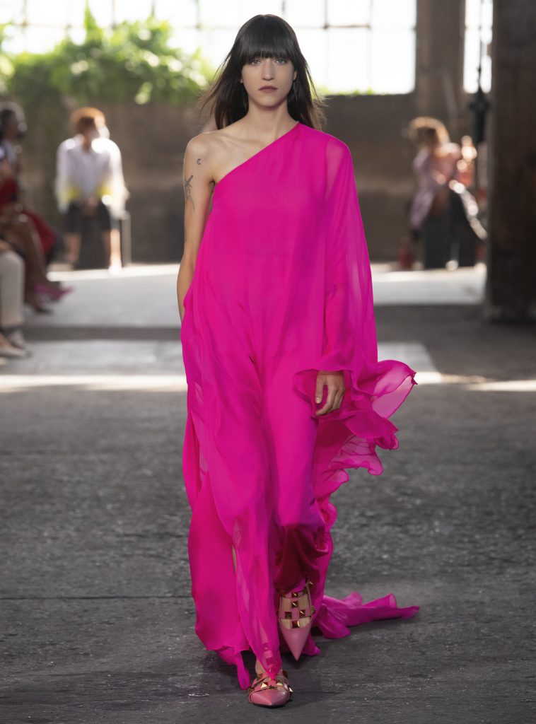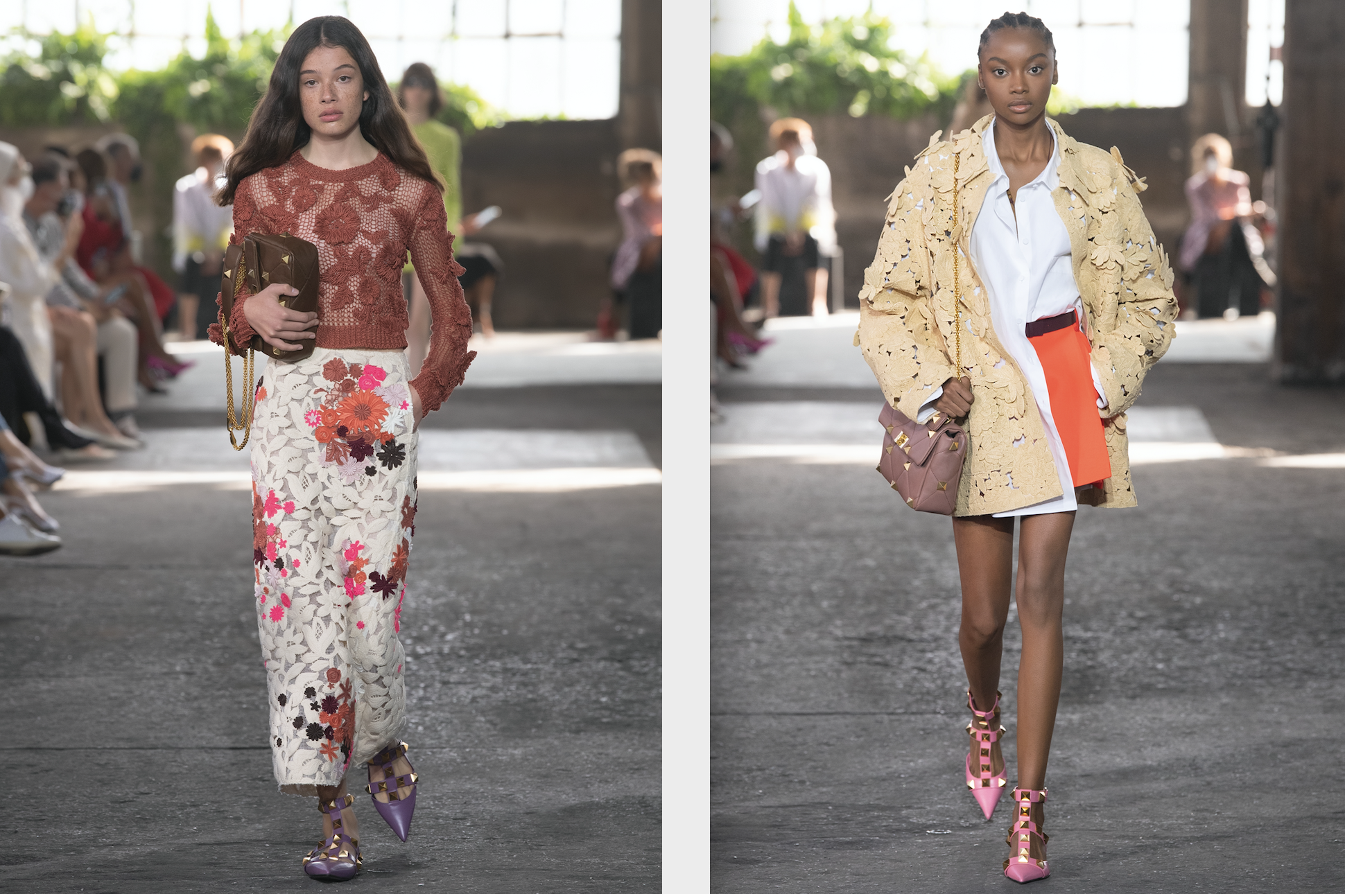 Una grazia leggiadra volteggia in passerella. Lo spirito di Valentino rivive in creazioni palpitanti e romantiche fatte di pizzo e chiffon, di seta e di pelle in una sinfonia di stile che evoca in parte la dolce giovinezza di Brooke Shields, icona di Valentino nei primi anni’80. Per l’estate 2021 Pierpaolo Piccioli, direttore creativo della maison fondata nel 1959 da Valentino Garavani, e oggi consigliere di stile di Jennifer Lopez, Lady Gaga, e Mika, riformula il lessico del marchio con la prima sfilata offline a Milano dopo anni di assenza della maison dall’Italia. Era il 1989 quando Valentino decise di lasciare la passerella di Roma per presentare la sua couture a Parigi, mentre dagli anni’70 la ville lumière è la cornice d’eccezione del ready to wear femminile; solo il menswear, insieme alla linea valentino Night, invece veniva svelato a Milano soprattutto negli anni’90. Il ritorno di Valentino, oltretutto con una sfilata in presenza, è un segnale: “Credo che, in questo periodo storico, sia di fondamentale importanza rimanere concentrati sul lavoro da compiere. È stimolante poter pensare a nuove idee, e questo è il tempo, in cui le idee possono crescere e diffondersi. Milano è una nuova opportunità, un grande progetto che sto sviluppando con i miei team, sul concetto di identity”, parola di Piccioli. E la sfilata coed, che è stata ospitata negli spazi post-industriali di un’acciaieria meneghina trasformata in un grande open space fiorito allietato da una performance musicale live, è un esempio di come questa nuova identità, egualitaria e plurima, ibrida ma decisa, possa moltiplicarsi in passerella attraverso un casting fatto di individui visti attraverso un prisma di forme e colori.