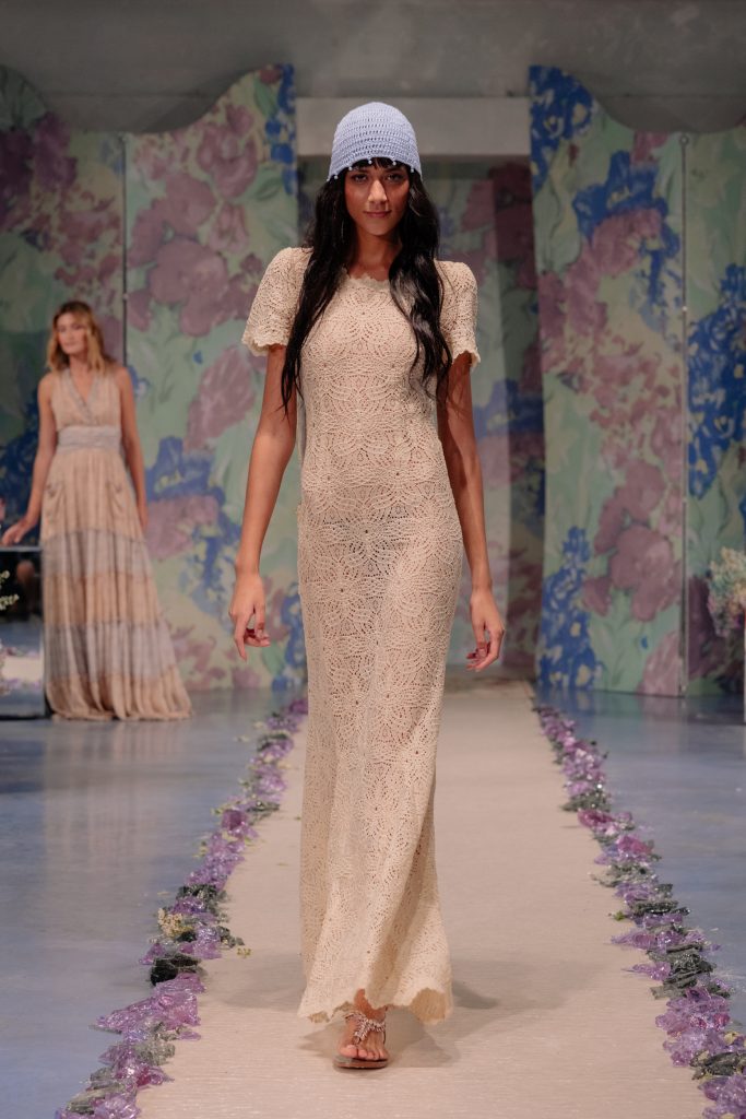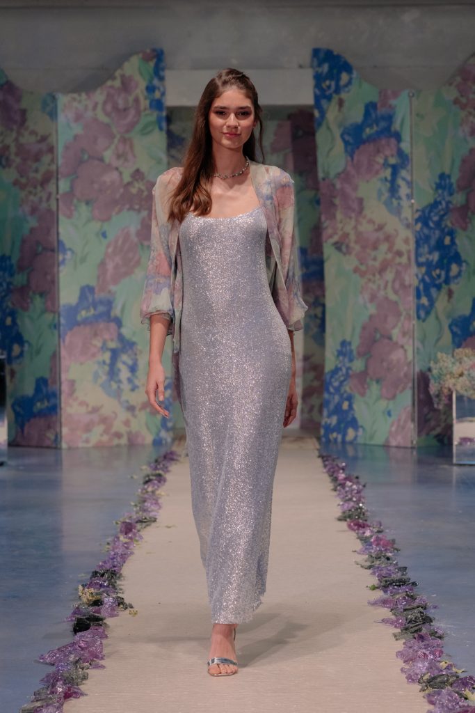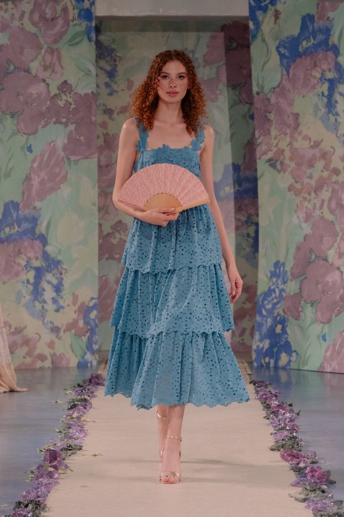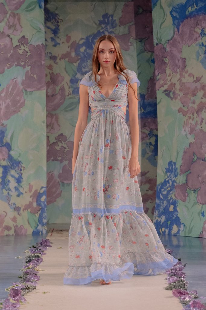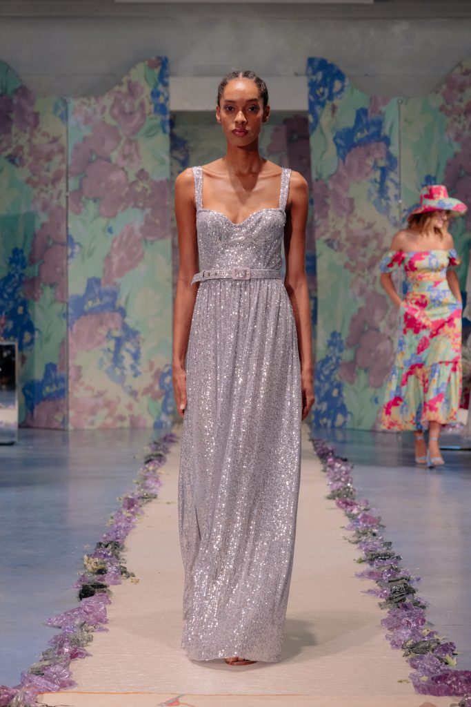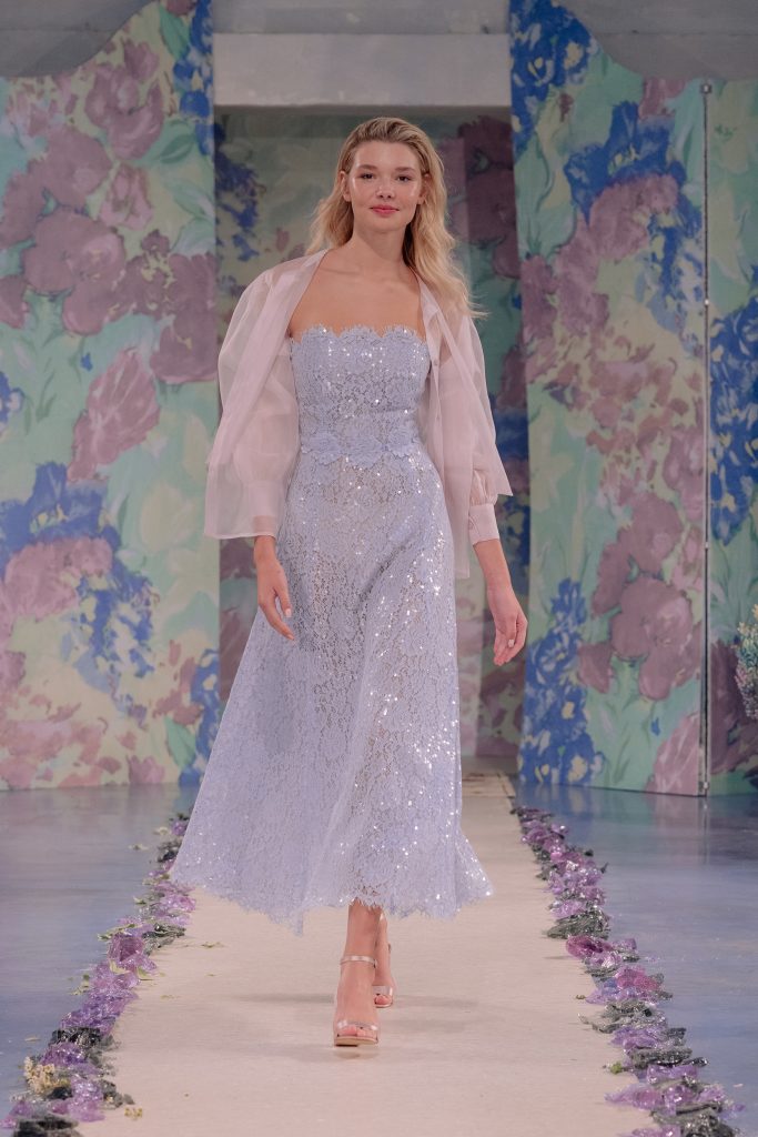 Le silhouette alternano forme più donanti e avvitate — talvolta sottolineate anche da profonde scollature — a volumi ad A, leggeri e sbarazzini. Le lunghezze vanno dal mini al maxi, con giochi di tagli orizzontali. Tessuti e textures sono un inno all’impalpabilità: cotoni delicati, tulle, chiffon, organza, broccato stretch, pizzi e paillettes.