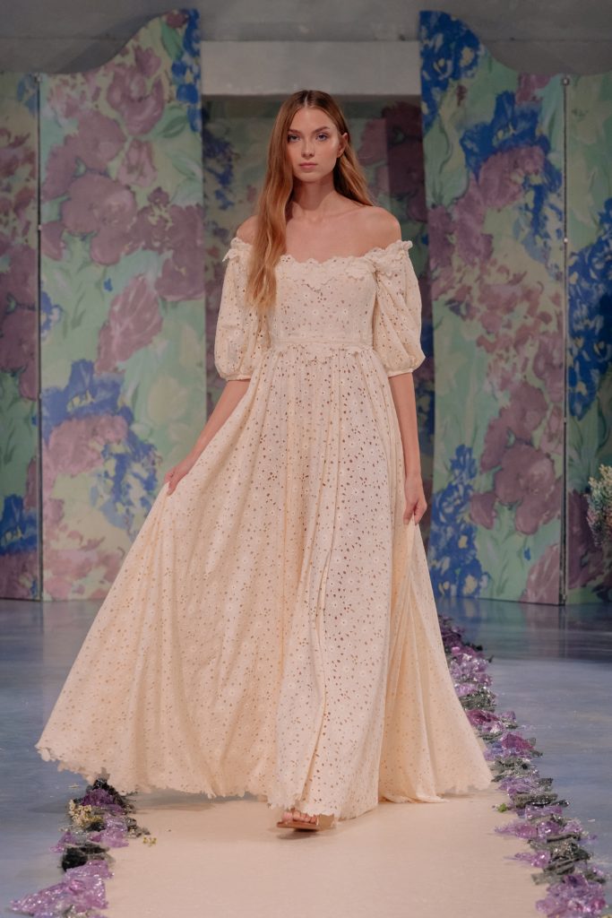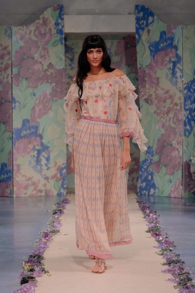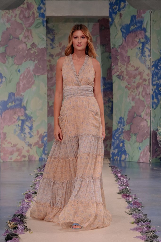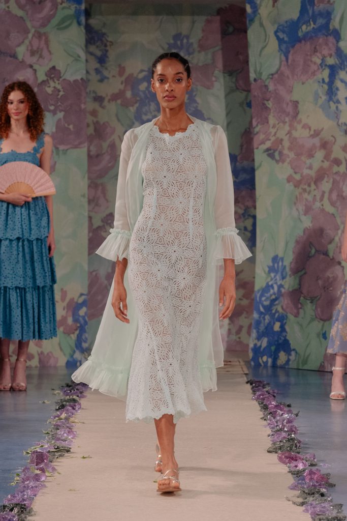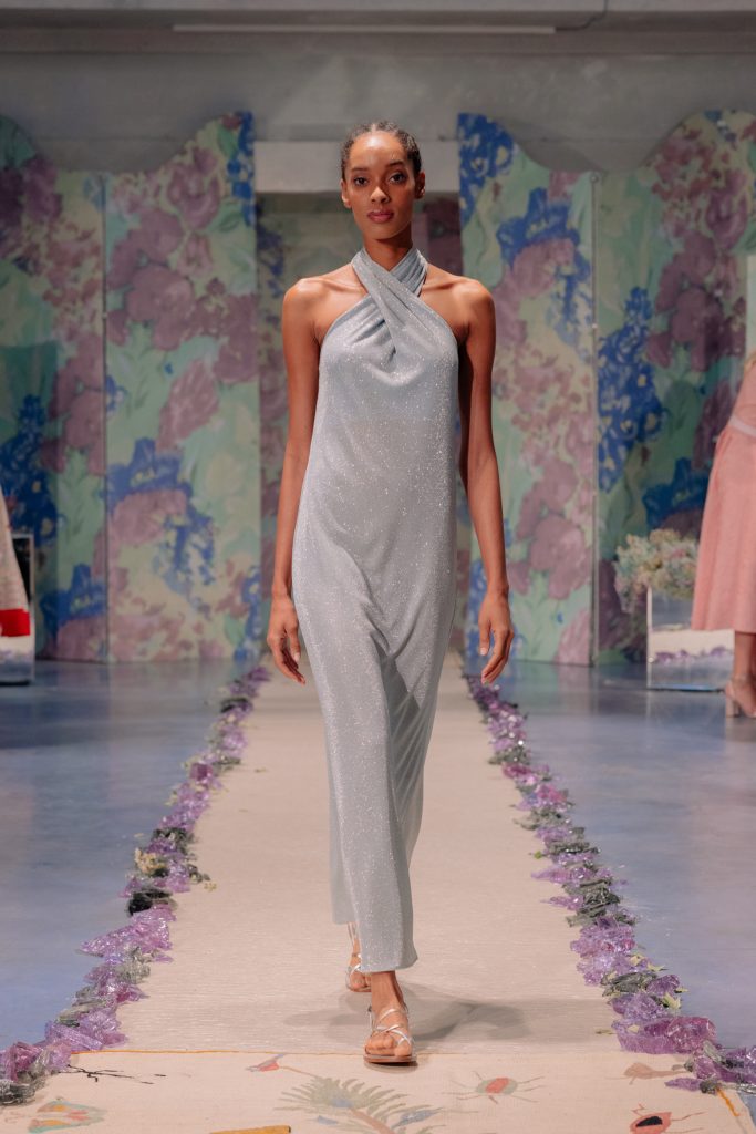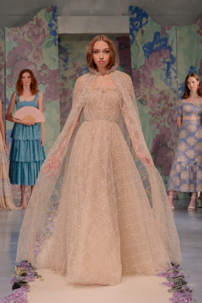 Le silhouette alternano forme più donanti e avvitate — talvolta sottolineate anche da profonde scollature — a volumi ad A, leggeri e sbarazzini. Le lunghezze vanno dal mini al maxi, con giochi di tagli orizzontali. Tessuti e textures sono un inno all’impalpabilità: cotoni delicati, tulle, chiffon, organza, broccato stretch, pizzi e paillettes.