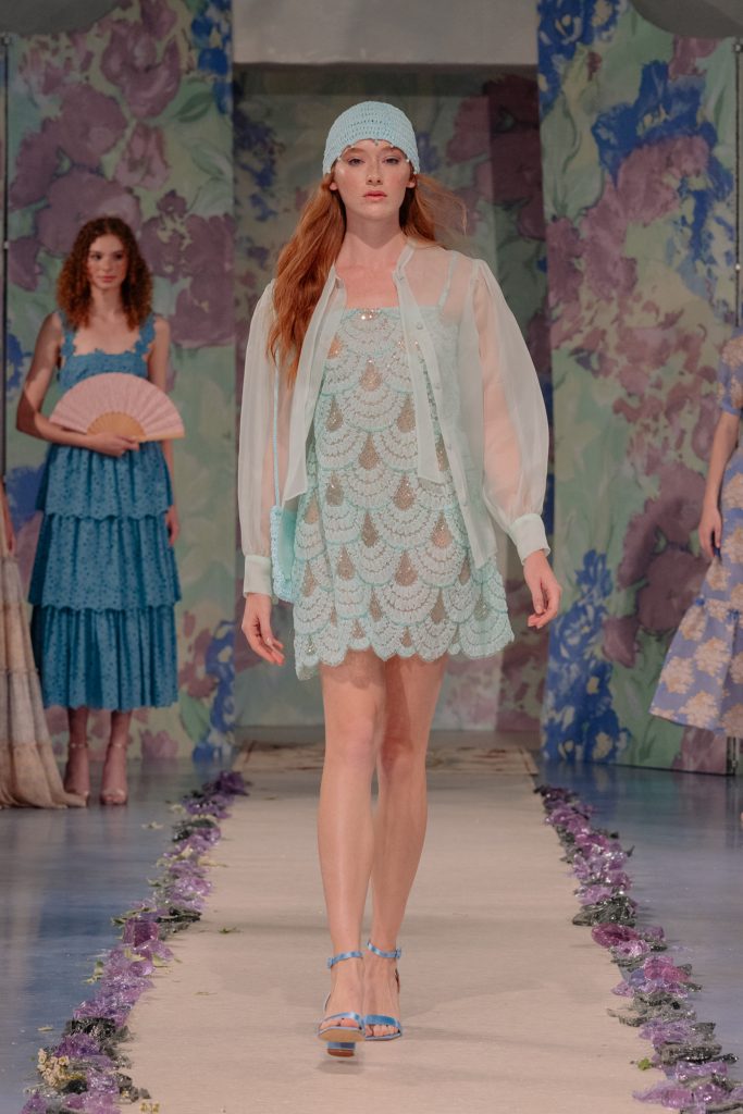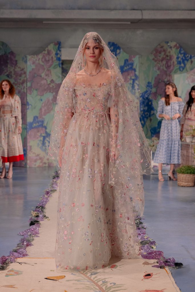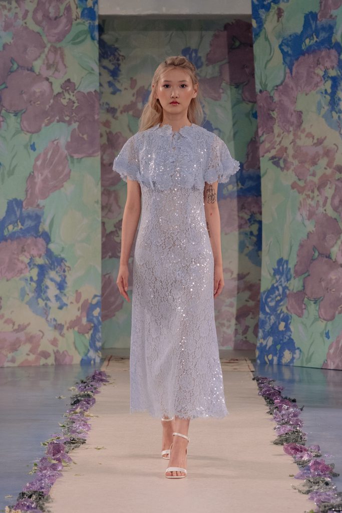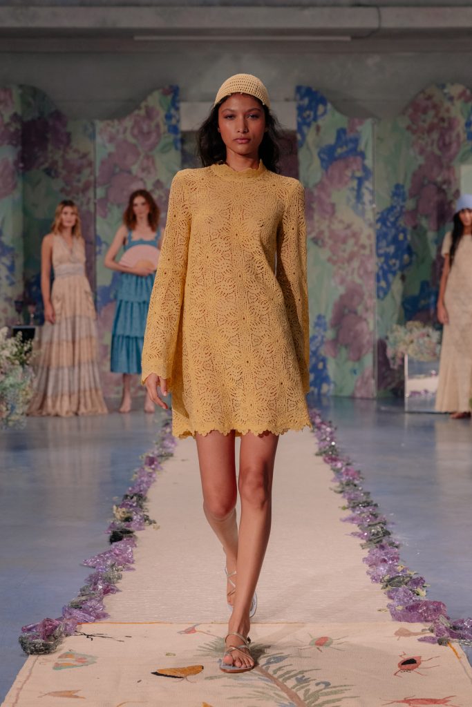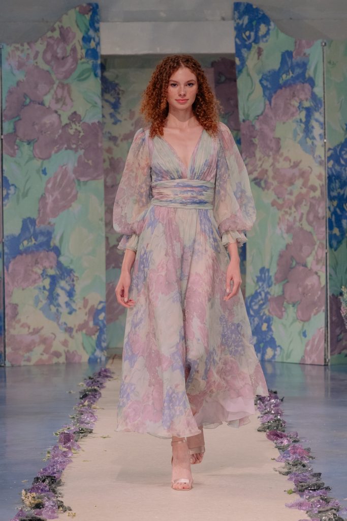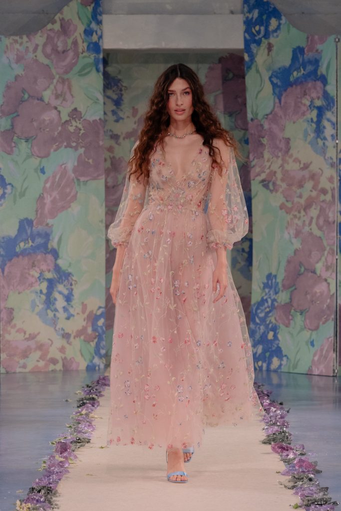 Le silhouette alternano forme più donanti e avvitate — talvolta sottolineate anche da profonde scollature — a volumi ad A, leggeri e sbarazzini. Le lunghezze vanno dal mini al maxi, con giochi di tagli orizzontali. Tessuti e textures sono un inno all’impalpabilità: cotoni delicati, tulle, chiffon, organza, broccato stretch, pizzi e paillettes.