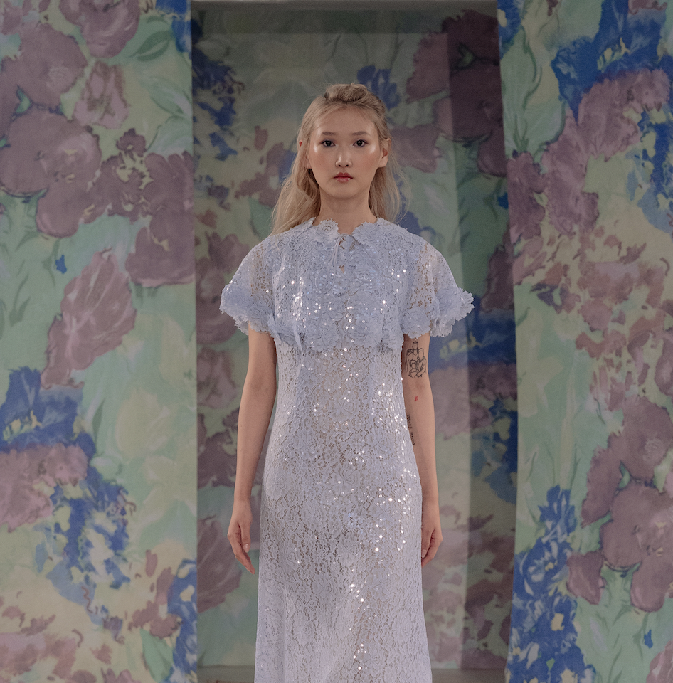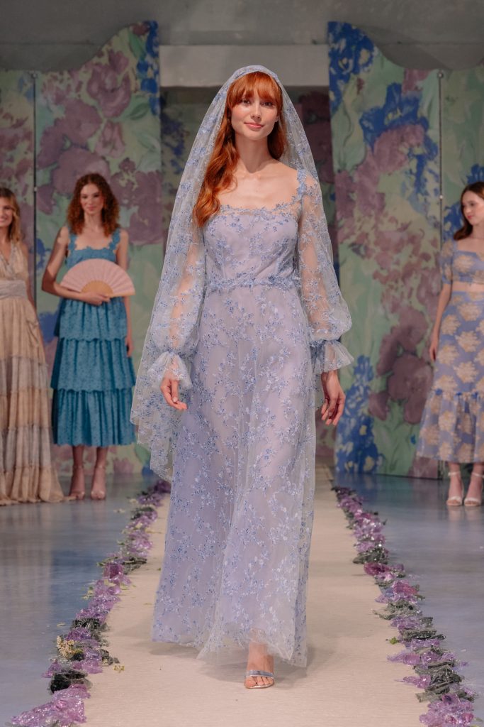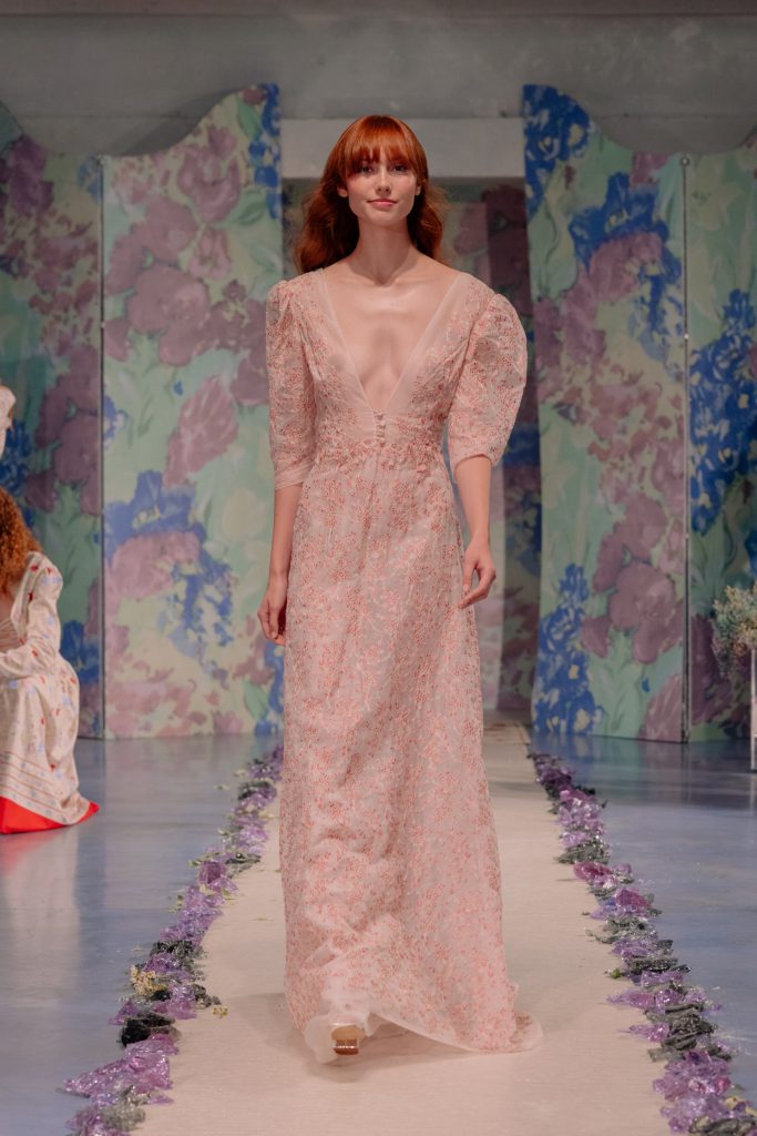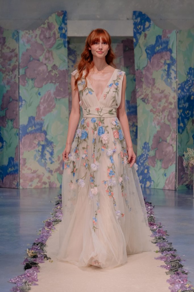 Cerimonia e sera lasciano spazio a riflessi metallici su onde di paillettes full-on o come dettaglio su pizzi che ricordano l’artigianalità del tombolo; il tulle diventa rete che intrappola mille fiori ricamati e suggerisce un matrimonio carico dei colori e della grazia della natura.