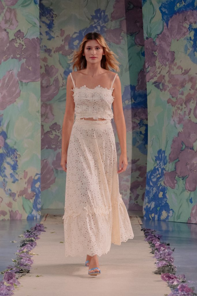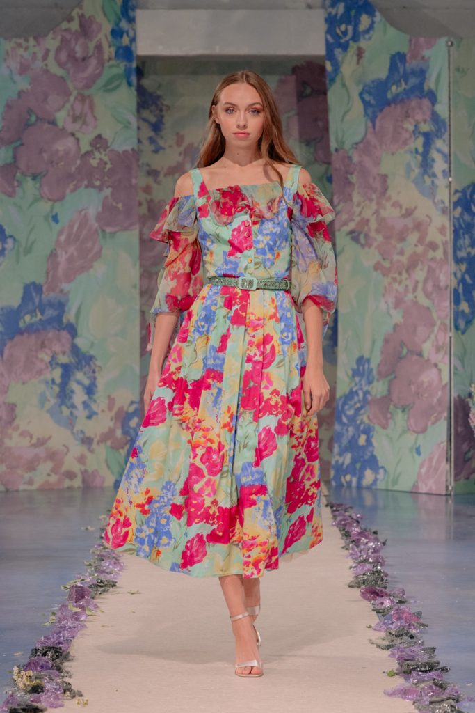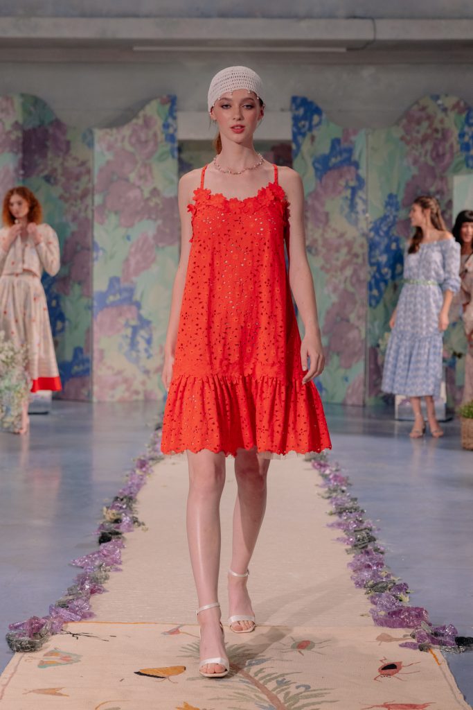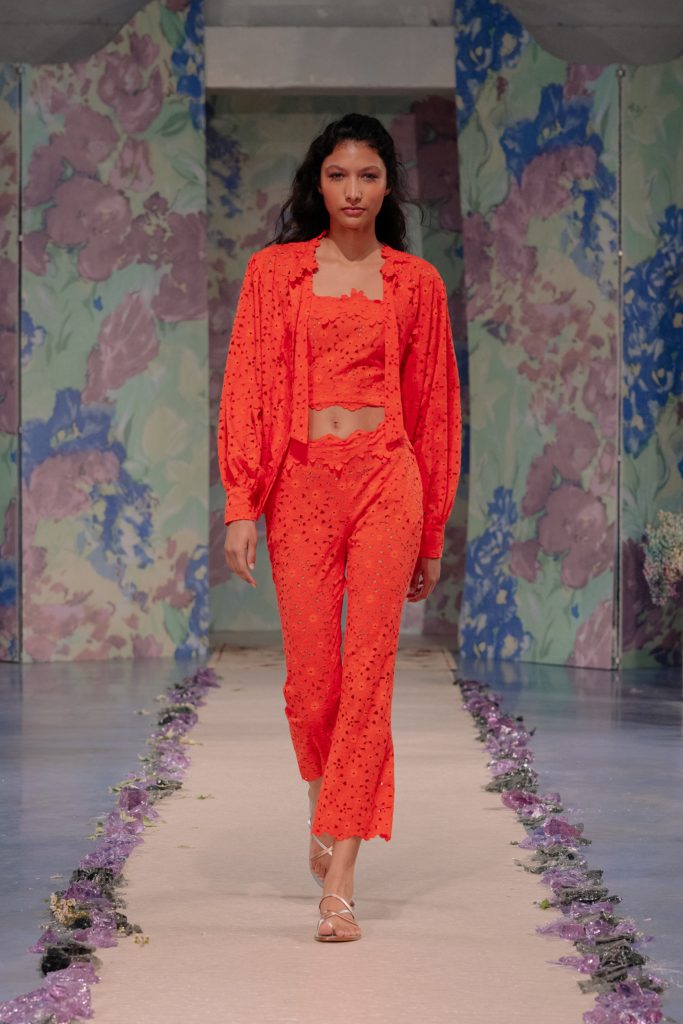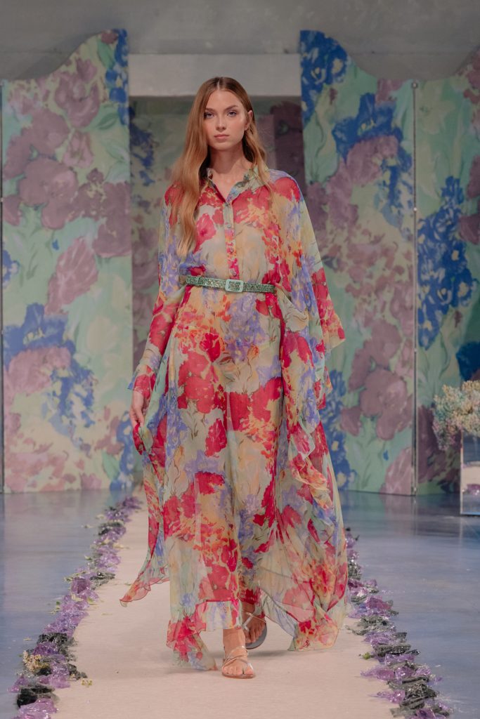 Il maxi flower quasi astratto crea effetti color-shock su abiti alla caviglia con balze discrete o per completi croptop-midiskirt informali, mentre le mille sfumature del cielo al tramonto diventano lunghi abiti che assecondano la figura. Il due pezzi giacca-pantalone si intaglia con il sangallo per un completo arancio vitaminico; il motivo a righe abbina le scintillanti paillettes ai volumi generosi dello scollo a barca di bluse strette da fusciacche a contrasto. Il fil coupé su organza goffrata disegna fiori minuti in cluster geometrici e introduce il ricamo su cotoni leggerissimi o tulle.