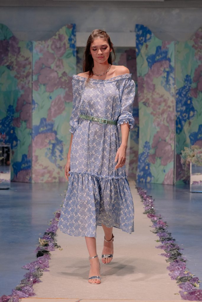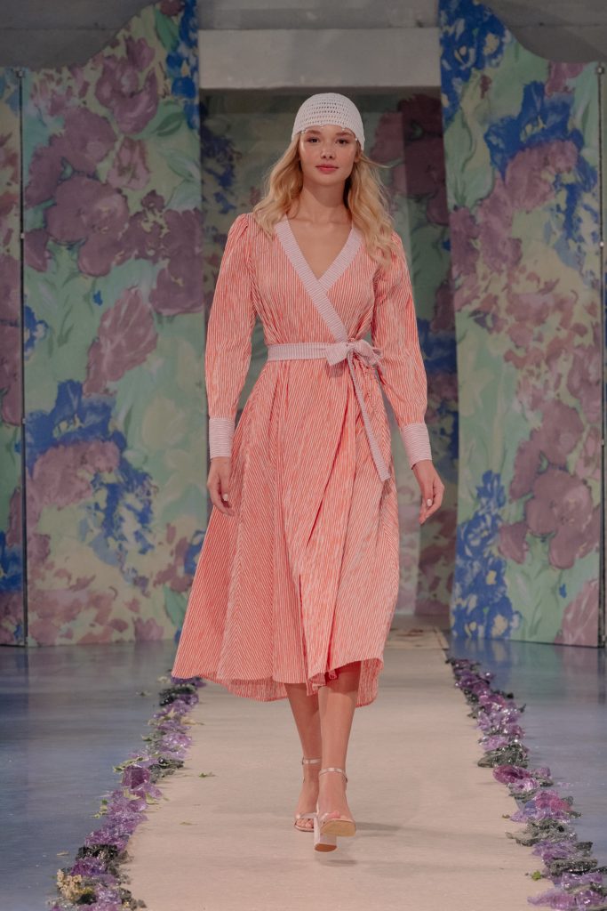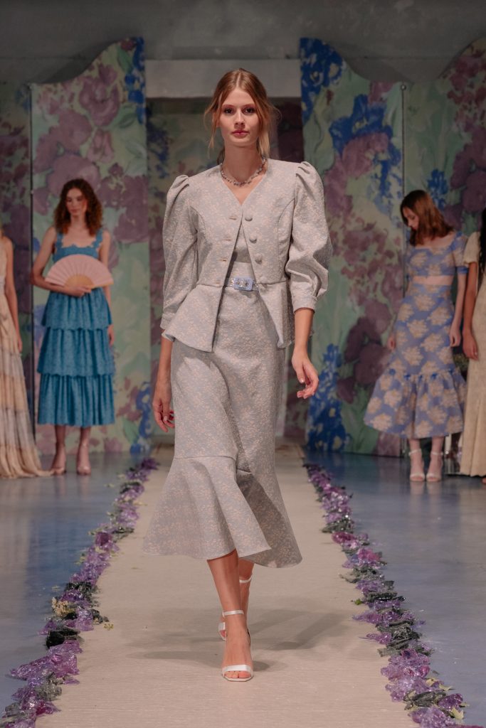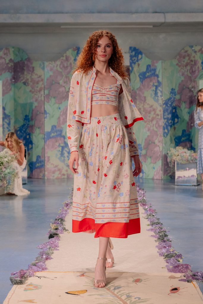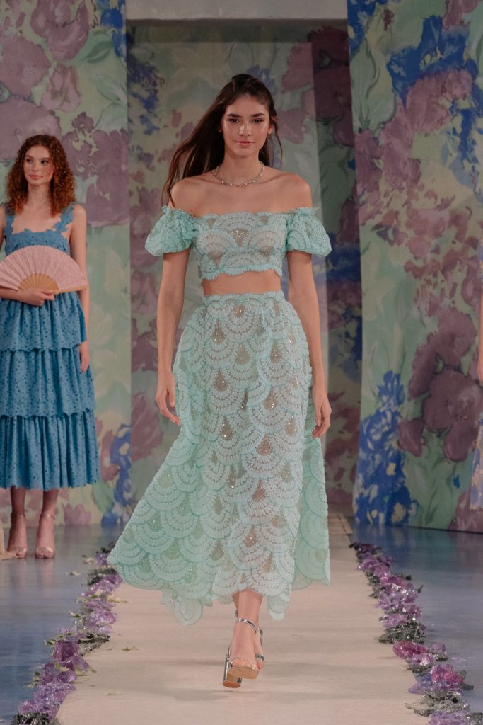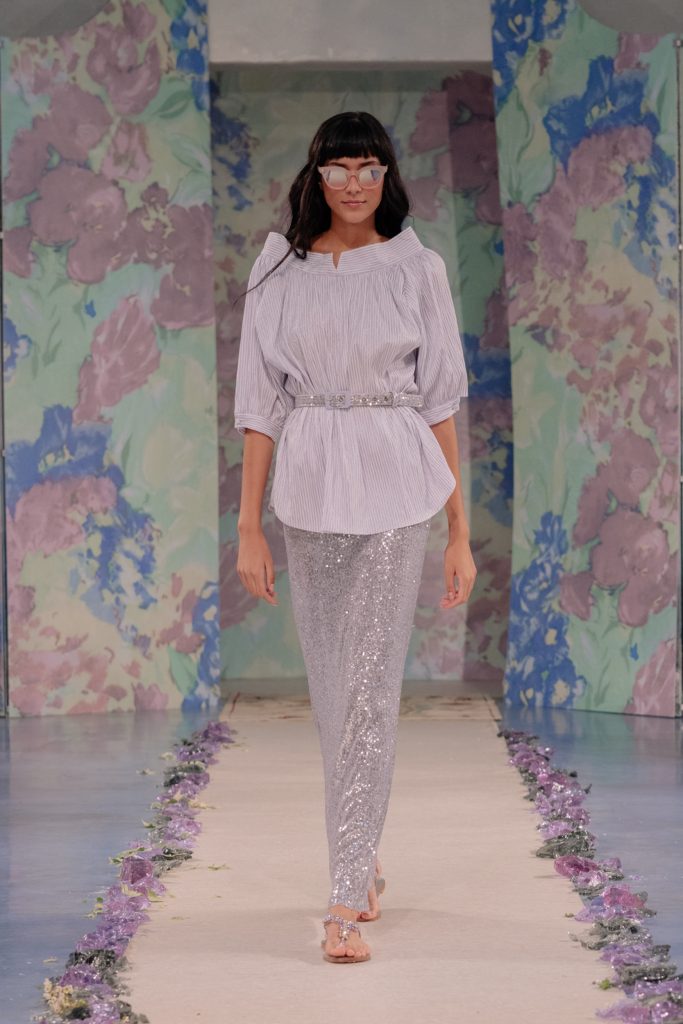 Il maxi flower quasi astratto crea effetti color-shock su abiti alla caviglia con balze discrete o per completi croptop-midiskirt informali, mentre le mille sfumature del cielo al tramonto diventano lunghi abiti che assecondano la figura. Il due pezzi giacca-pantalone si intaglia con il sangallo per un completo arancio vitaminico; il motivo a righe abbina le scintillanti paillettes ai volumi generosi dello scollo a barca di bluse strette da fusciacche a contrasto. Il fil coupé su organza goffrata disegna fiori minuti in cluster geometrici e introduce il ricamo su cotoni leggerissimi o tulle.