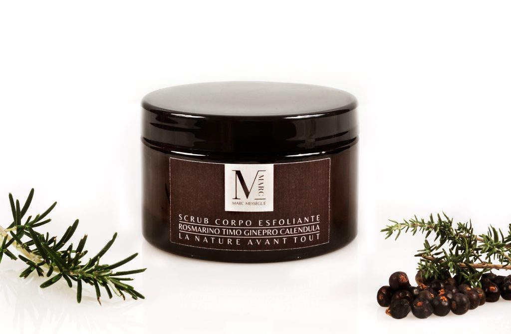 Lo scrub salino ha un’azione delicatamente esfoliante che libera la pelle dalle impurità. Un battuto di foglie di Rosmarino, Timo e Bacche di Ginepro affina lo strato superficiale della pelle, eliminando cellule morte e donando una piacevole sensazione di morbidezza.
