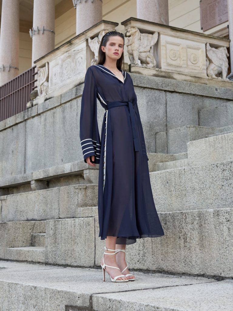 Una collezione illuminata da una palette di colori decisi che, dal rosso Cina, arriva al peonia, passando per l’energia dell’arancio abbinato al blu navy e all’azzurro polveroso, senza dimenticare il bianco gesso, in una scala di cromatismi che ne enfatizzano il carattere romantico e poetico.