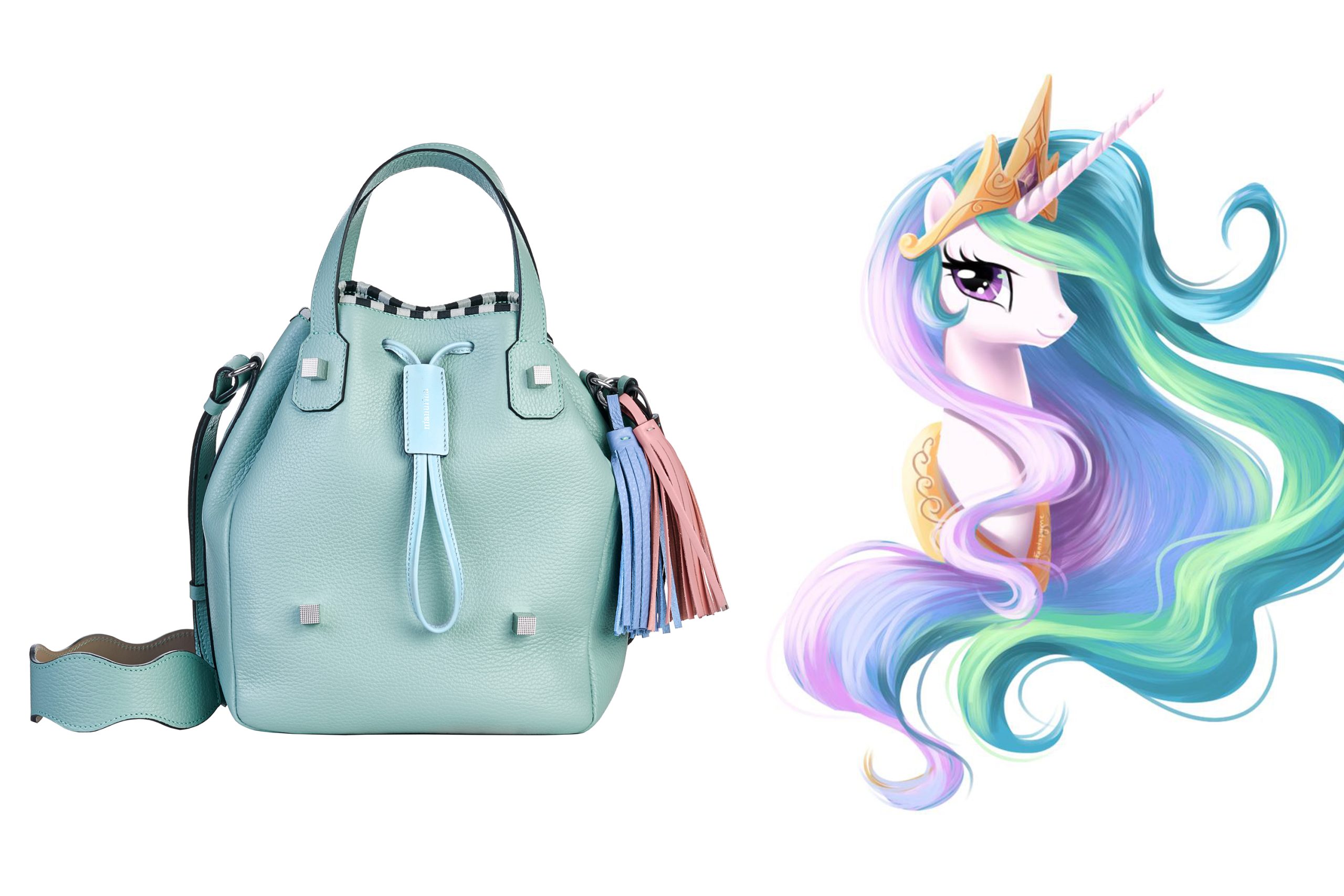 La stampa dell’unicorno è presente anche sui foulard di seta uniti alle borse, dalle combinazioni cromatiche fresche e che ricordano il mondo cartoon.
