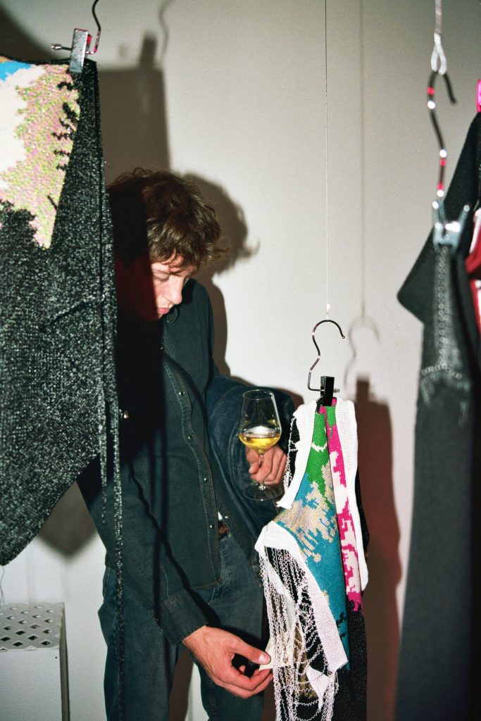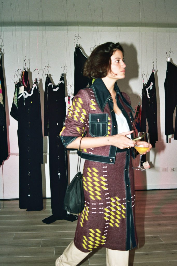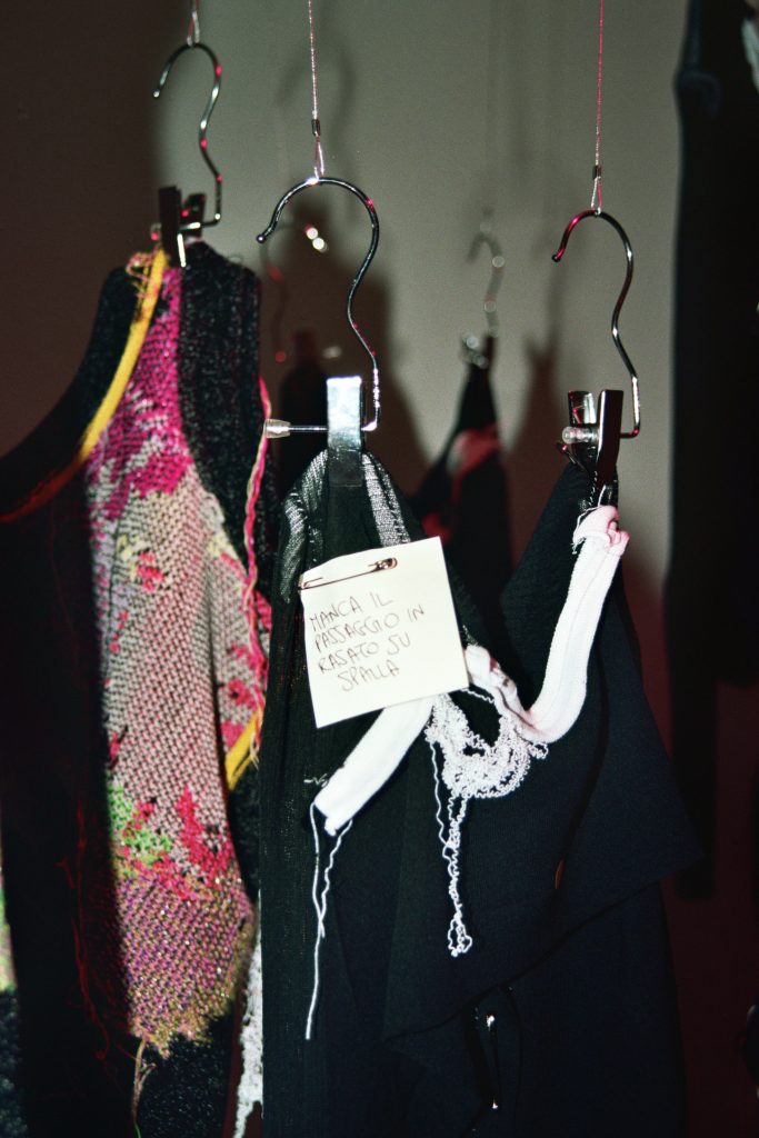 Due le installazioni concepite dal team del brand per raccontarsi: la prima consiste nei tre Organicostruiti assemblando picchi e montagne di rocche di filati, a rappresentare il cuore pulsante del brand e la ricerca minuziosa con cui vengono selezionati i filati tra la grande quantità di quelli di scarto e come vengono trasformati nelle collezioni del brand. La seconda è una serie di prototipi e prove appartenenti appartenenti alla S/S23 “Estasi momentanea”, volutamente scelti per rappresentare non il processo creativo concluso, ma la costante apertura e l’estrema cura al dettaglio con cui il brand si rapporta al progetto.