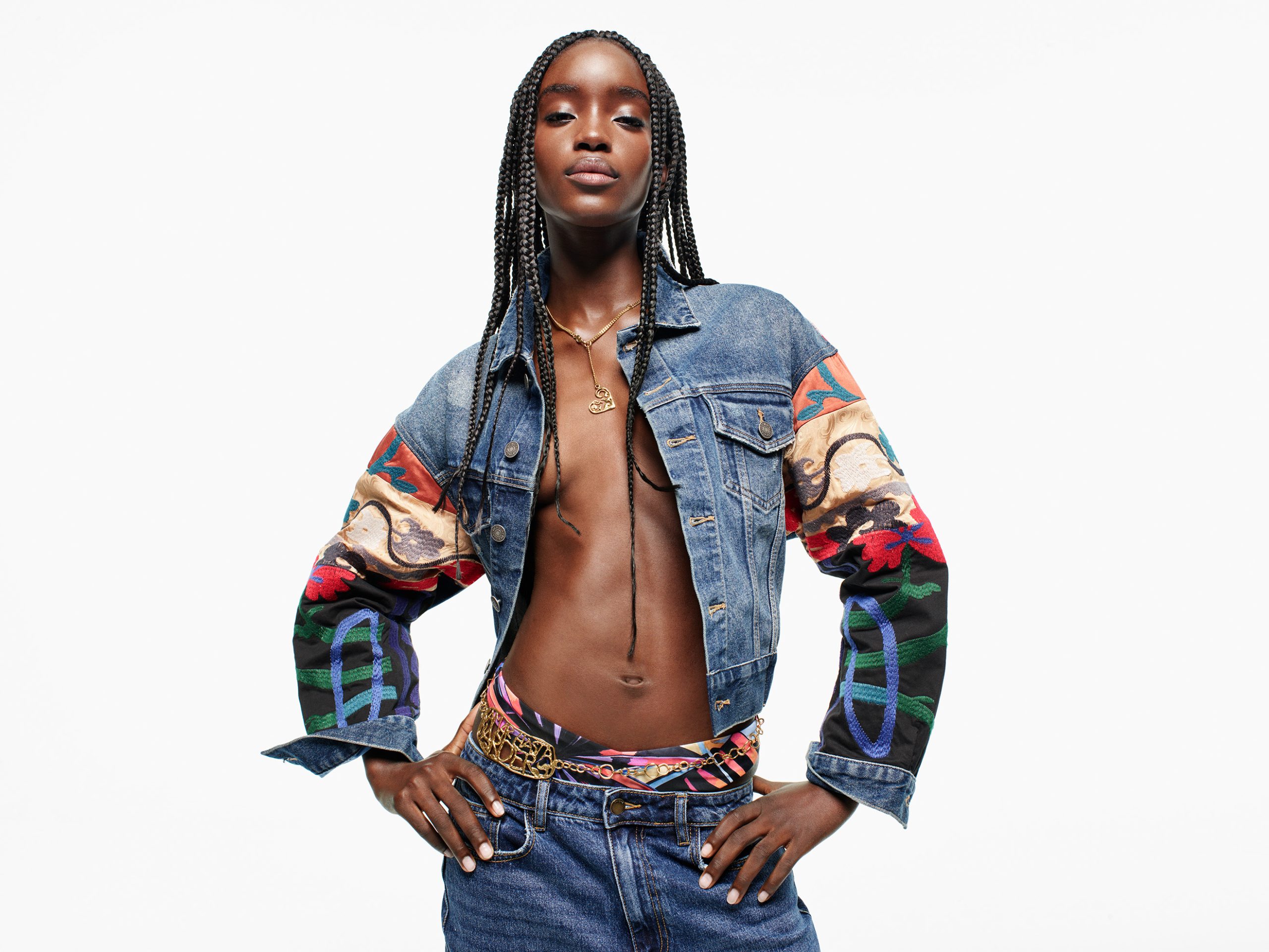 Un nuovo guardaroba composto da capi essenziali come i jeans loose fit d’ispirazione anni ‘90 con strappi e strass o le giacche trucker in una nuova gamma di tinte unite.