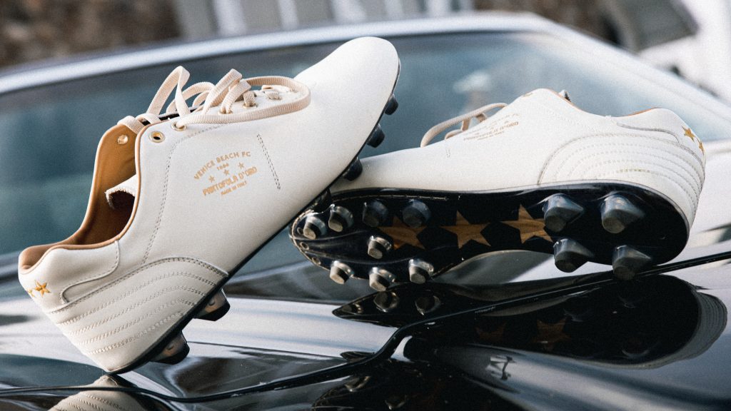 sulla tomaia i loghi di Pantofola d’Oro e del Venice Beach FC. La capsule comprende anche una sneaker in pelle