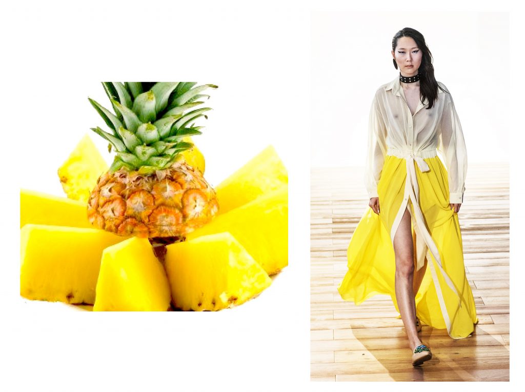Nasce dai paradisi esotici la donna Delfrance, che indossa i colori vitaminici sfumati di arancio, giallo, verde e fucsia.