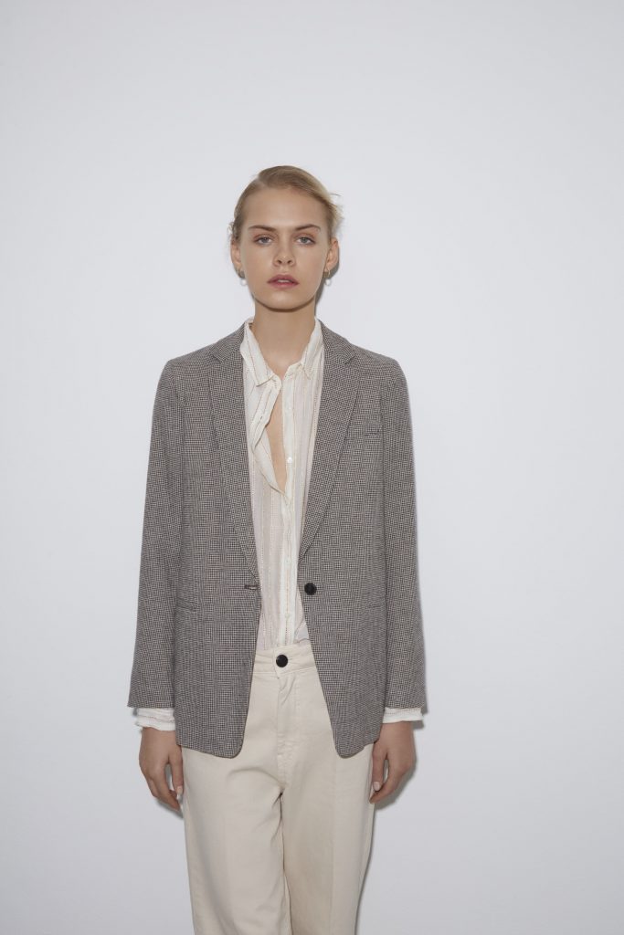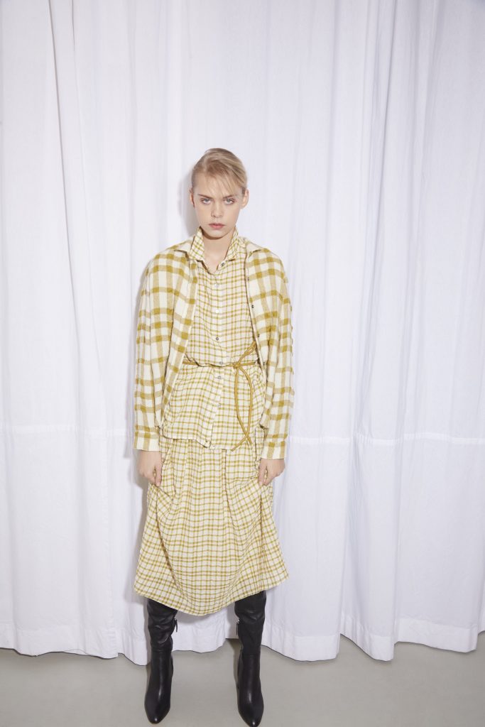 I tessuti trovano nuova identità e carattere attraverso un’accurata selezione, ispirata dai tre temi cardini della collezione. La parte dedicata alla rugiada privilegia tessuti luminosi e cangianti, e il lurex diventa il protagonista nel tulle, nel jacquard laminato e nel filato kid mohair. Il pizzo, le garze fluide e calde, il bouclè per il capospalla e le flanelle sono i tessuti che meglio identificano questo gruppo della collezione, caratterizzato da una stampa tematica “Rugiada” che ricorda un delicato campo di fiori su garza di lana seta. L’arcobaleno da vivacità e carattere alla parte della collezione che si esprime con i tessuti caldi e preziosi come il capospalla di mohair, il velluto degradè e la maglieria multicolor in kid mohair. I tessuti giornalieri e quotidiani come il bull denim e il fustagno vengono abbinati a tessuti dalla tramatura ricca e preziosa come il raso lucido martellato, il velluto liscio e il raso in tinto capo.