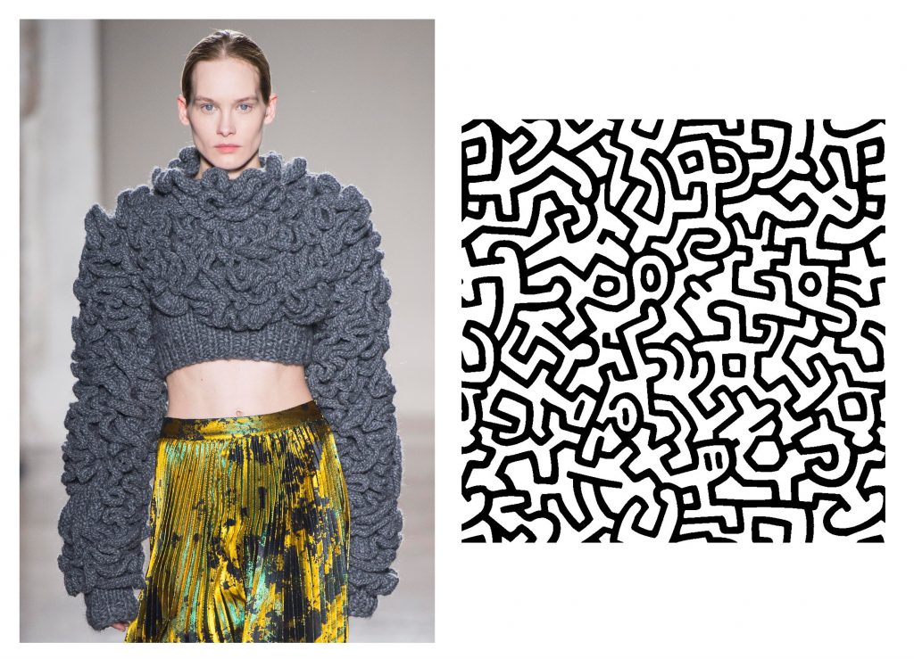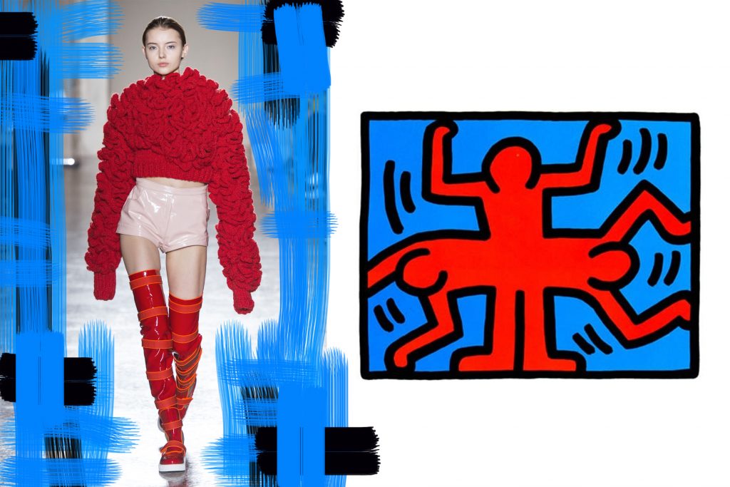 E dall’arte pittorica e fotografica, arriva l’eco della collezione Autunno/Inverno 2018/19 di Cristiano Burani. Dal graffitismo di Keith Haring e dal suo linguaggio universale che arriva dalla strada, fatto di segni netti, distinti, popolato da personaggi stilizzati e bidimensionali, ma che veicolano messaggi universali quali l’amore, il sesso, il razzismo, il capitalismo, la droga, il riarmo nucleare…