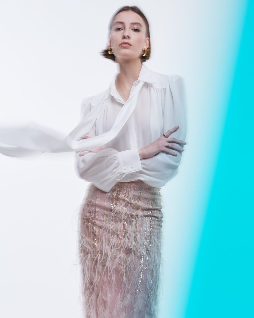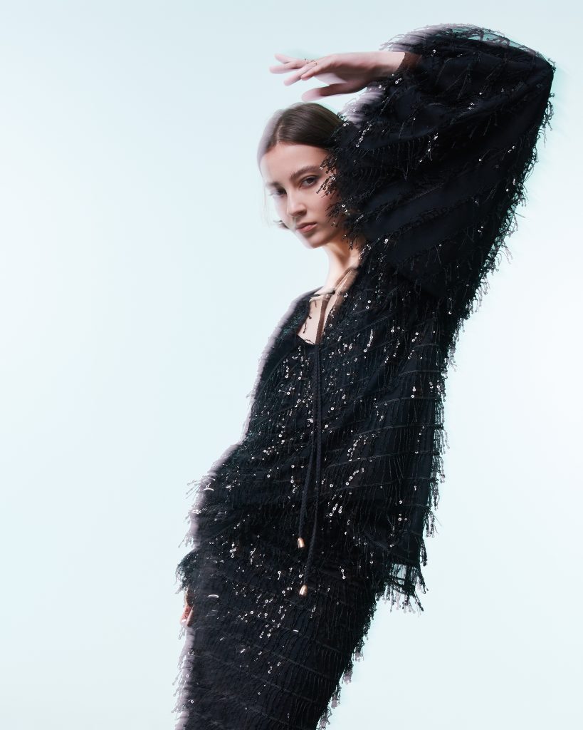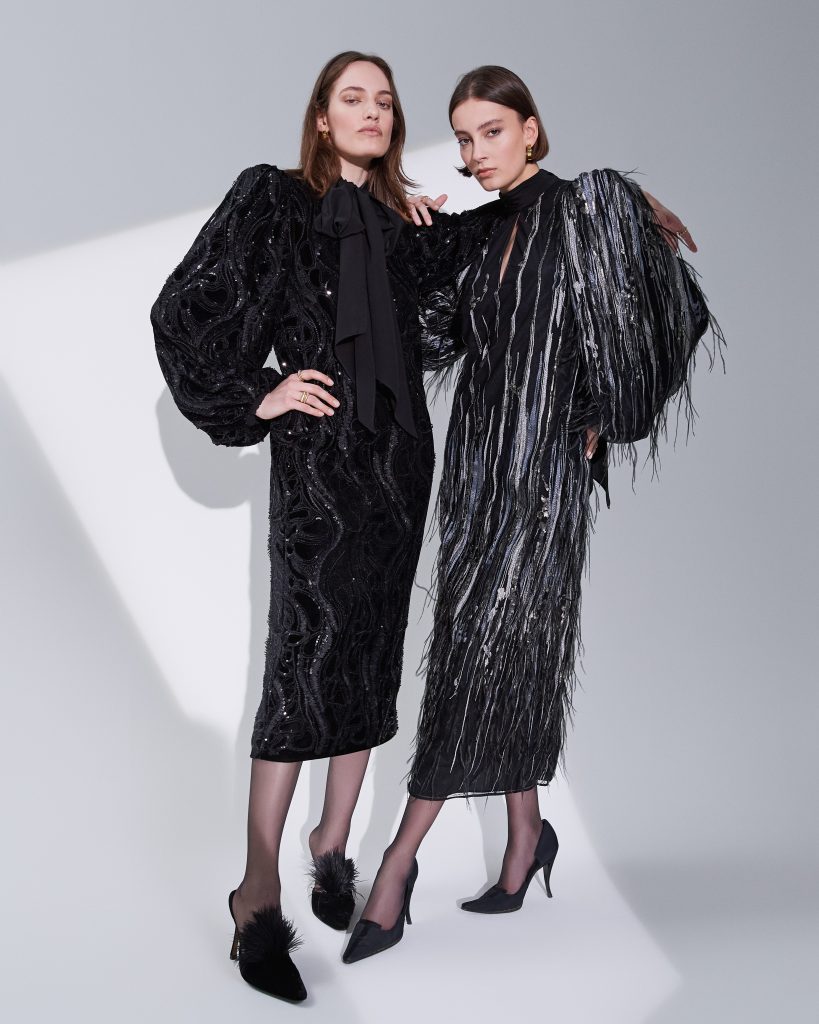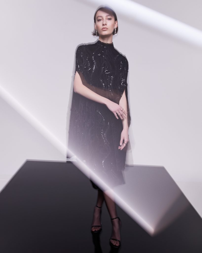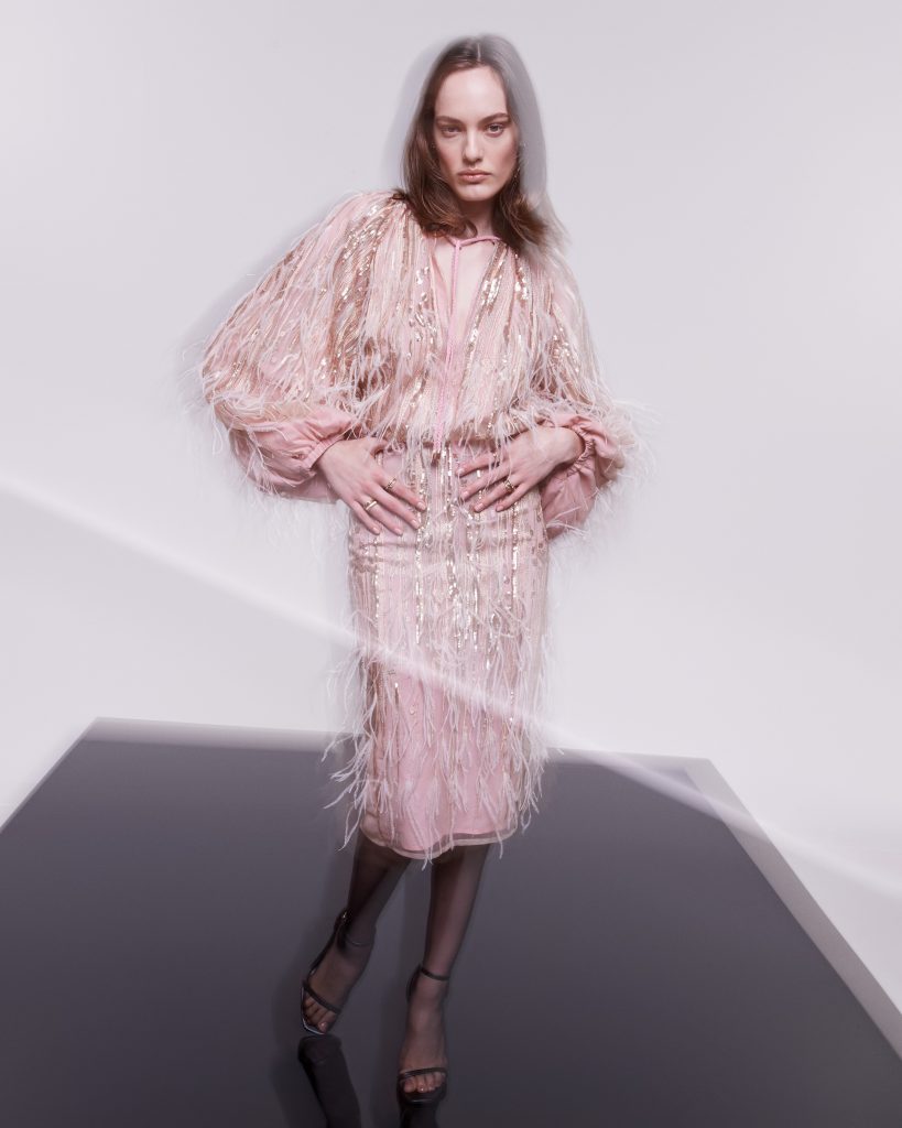 Focus sulla tridimensionalità del vestito. E sulla sua magia cinetica. Perché un abito diventa una experience, che colpisce i sensi. Il fruscio dei ricami su una gonna ricamata che intriga a ogni passo. Il micro vibrare delle piume che sono un pretesto per introdurre la parte grafica. Le paillette messe a correre creando un pavé specchiato, un all over che porta la luce nello sguardo. La sensazione soft sulla pelle del velluto di seta per una cappa black dai ricami ton sur ton. Sovrapposizioni leggere di trasparenze che agiscono come pennellate per creare l’effetto di colore finale, ricordando le tecniche pittoriche. Sciarpe e fiocchi lasciati volutamente aperti, tagliando l’insieme. Nasce un segno visivo che non si dimentica.