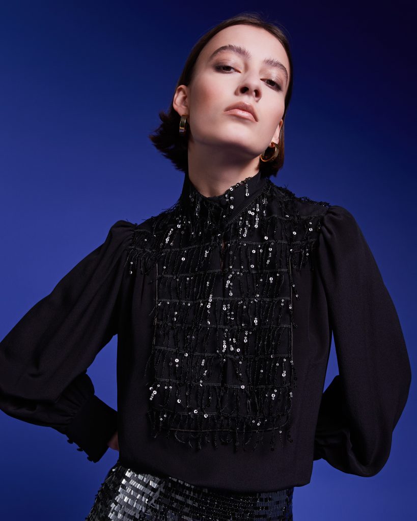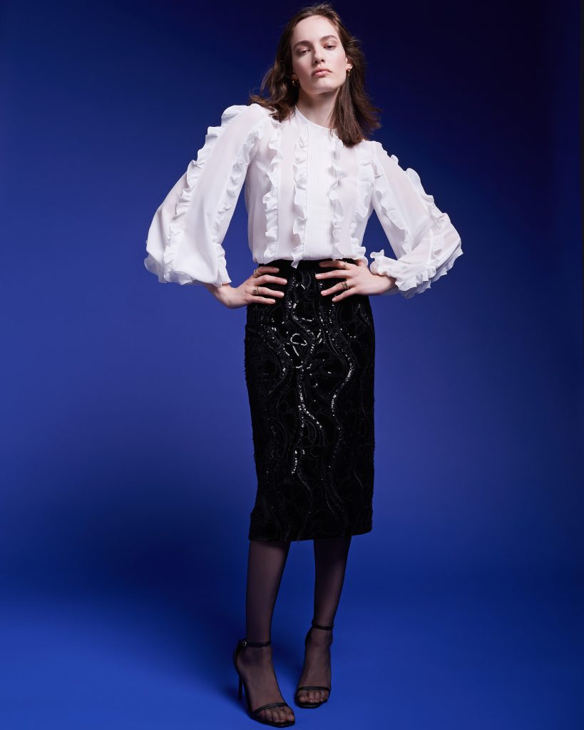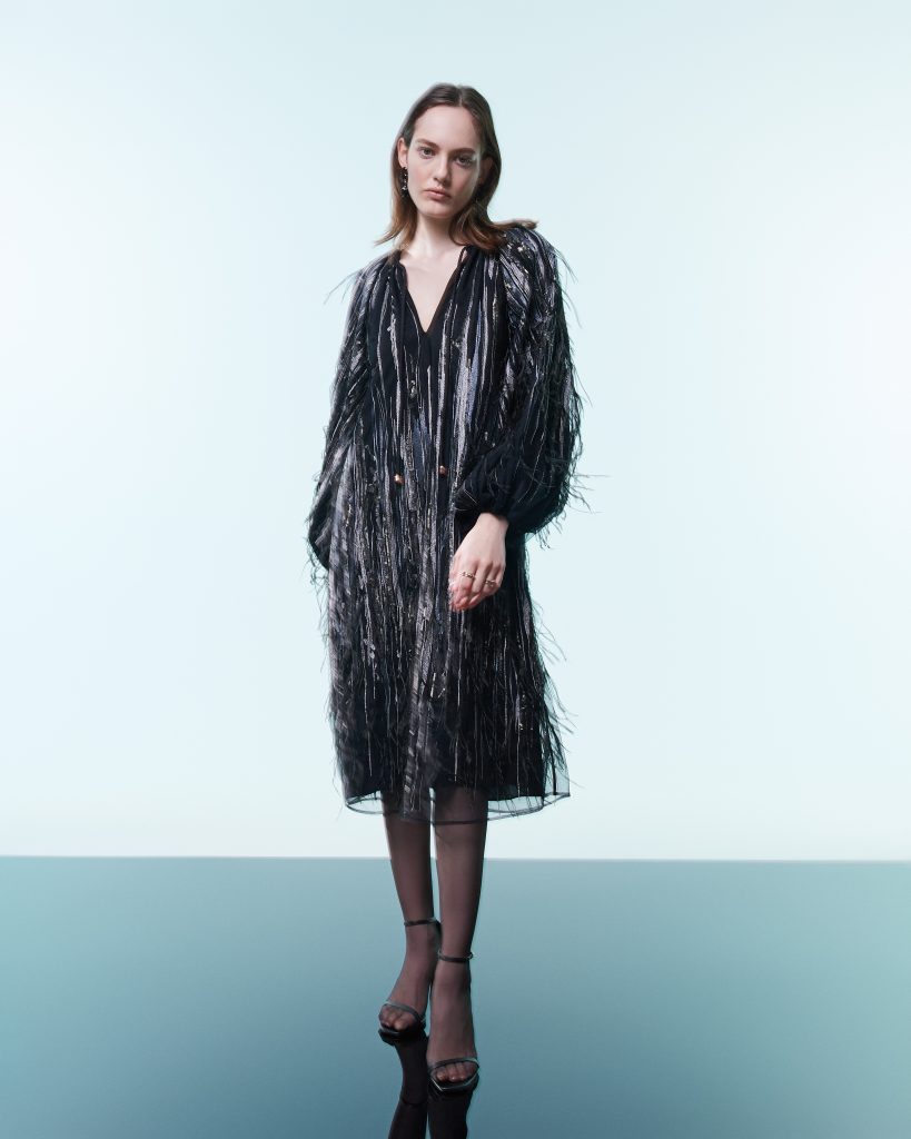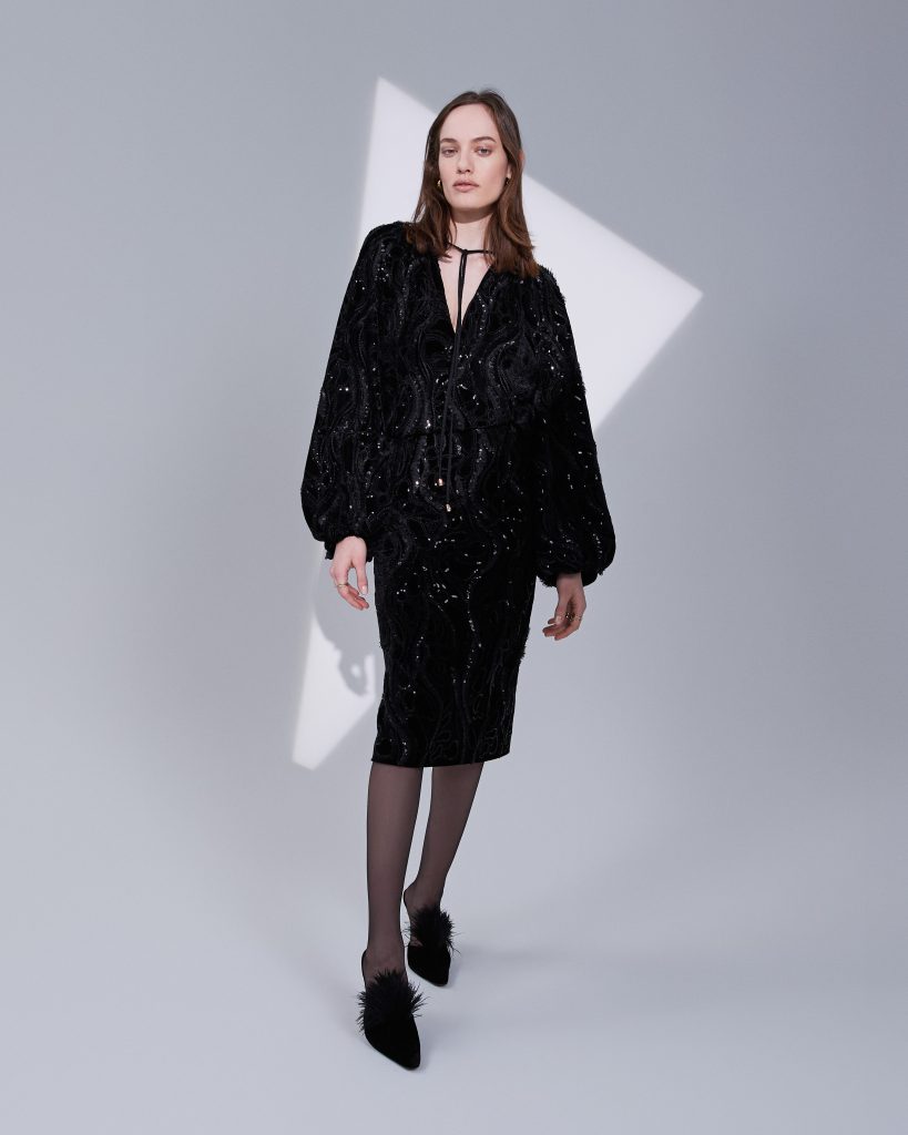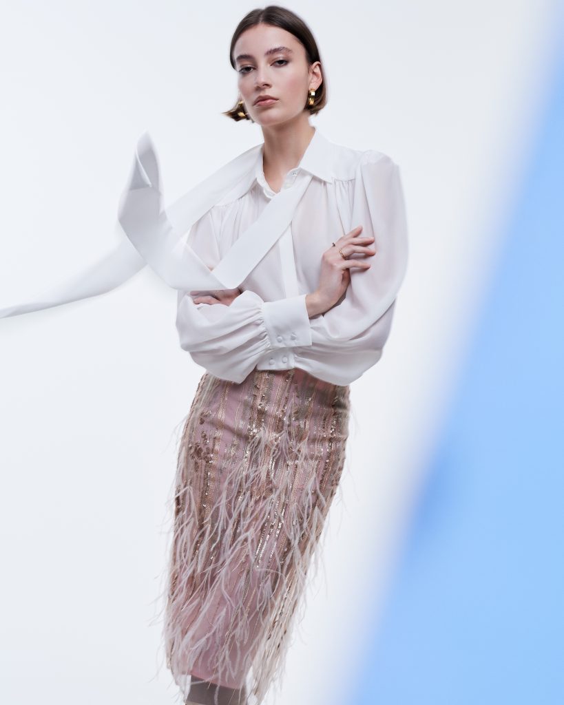 Focus sulla tridimensionalità del vestito. E sulla sua magia cinetica. Perché un abito diventa una experience, che colpisce i sensi. Il fruscio dei ricami su una gonna ricamata che intriga a ogni passo. Il micro vibrare delle piume che sono un pretesto per introdurre la parte grafica. Le paillette messe a correre creando un pavé specchiato, un all over che porta la luce nello sguardo. La sensazione soft sulla pelle del velluto di seta per una cappa black dai ricami ton sur ton. Sovrapposizioni leggere di trasparenze che agiscono come pennellate per creare l’effetto di colore finale, ricordando le tecniche pittoriche. Sciarpe e fiocchi lasciati volutamente aperti, tagliando l’insieme. Nasce un segno visivo che non si dimentica.