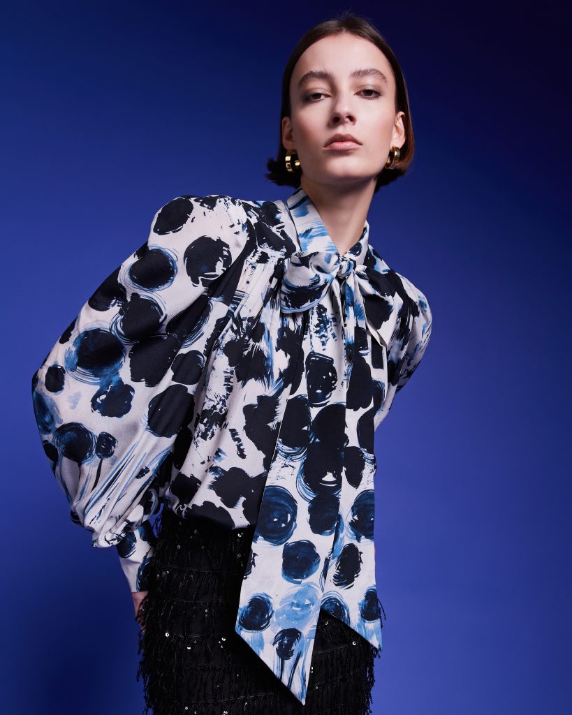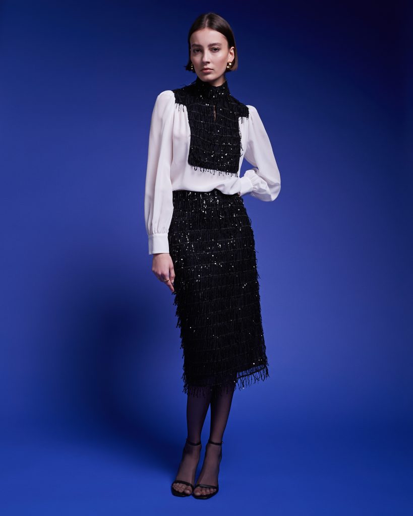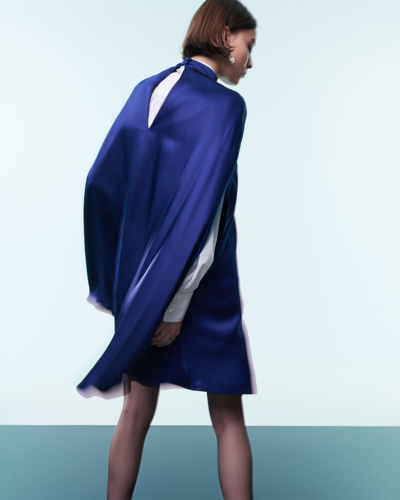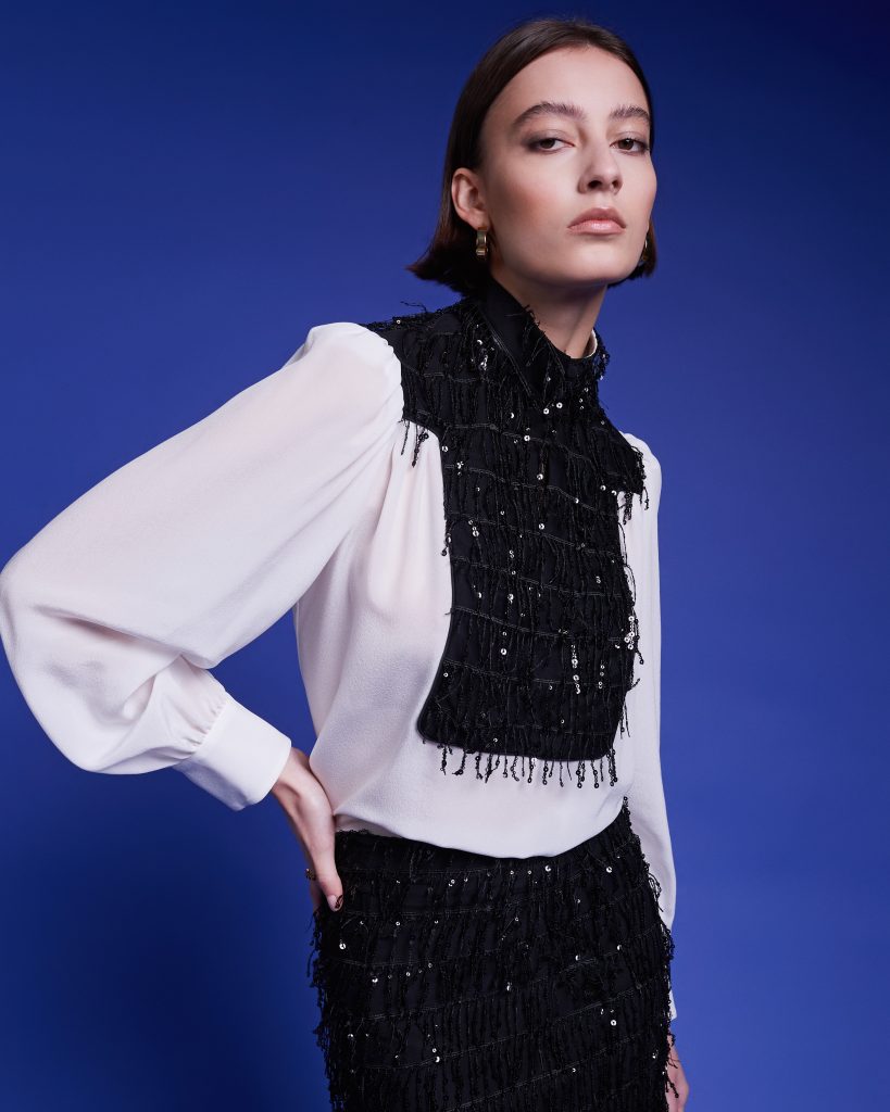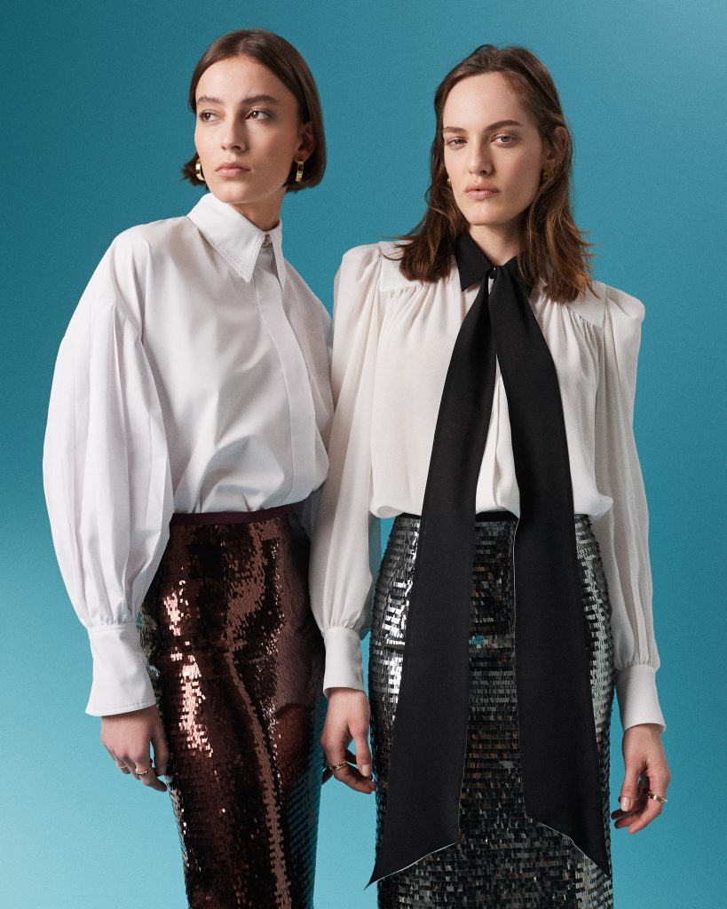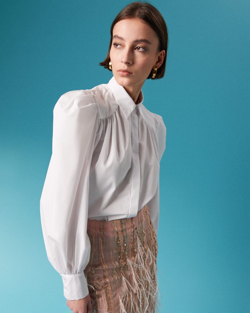 La camicia è mutante, diventa abito, diventa cappa. È il primo step di un’evoluzione naturale, con l’inserimento di nuovi pezzi pensati per completare il racconto di quel mondo nato dalla forza della personalità e dei contrasti. Si va verso un total look all’insegna delle collisioni. Grafismi assoluti e anima couture. Tela grezza e riverberi preziosi. Lucido e opaco. Daywear e sera. L’imperativo è giocare negli abbinamenti che sono sempre eyecandy. Per un guardaroba che parla lo stesso linguaggio, declinato in una palette che è un meccanismo di sincronie cromatiche, dal black and white al blu acceso, al rosa powder, al bordeaux intenso. Gocce di memoria sensoriale nate dai tessuti, dal raso pesante al tulle impalpabile, toccando gli antipodi ma sempre con un’anima e una storia. Per avvolgere il corpo con un materiale che vive.