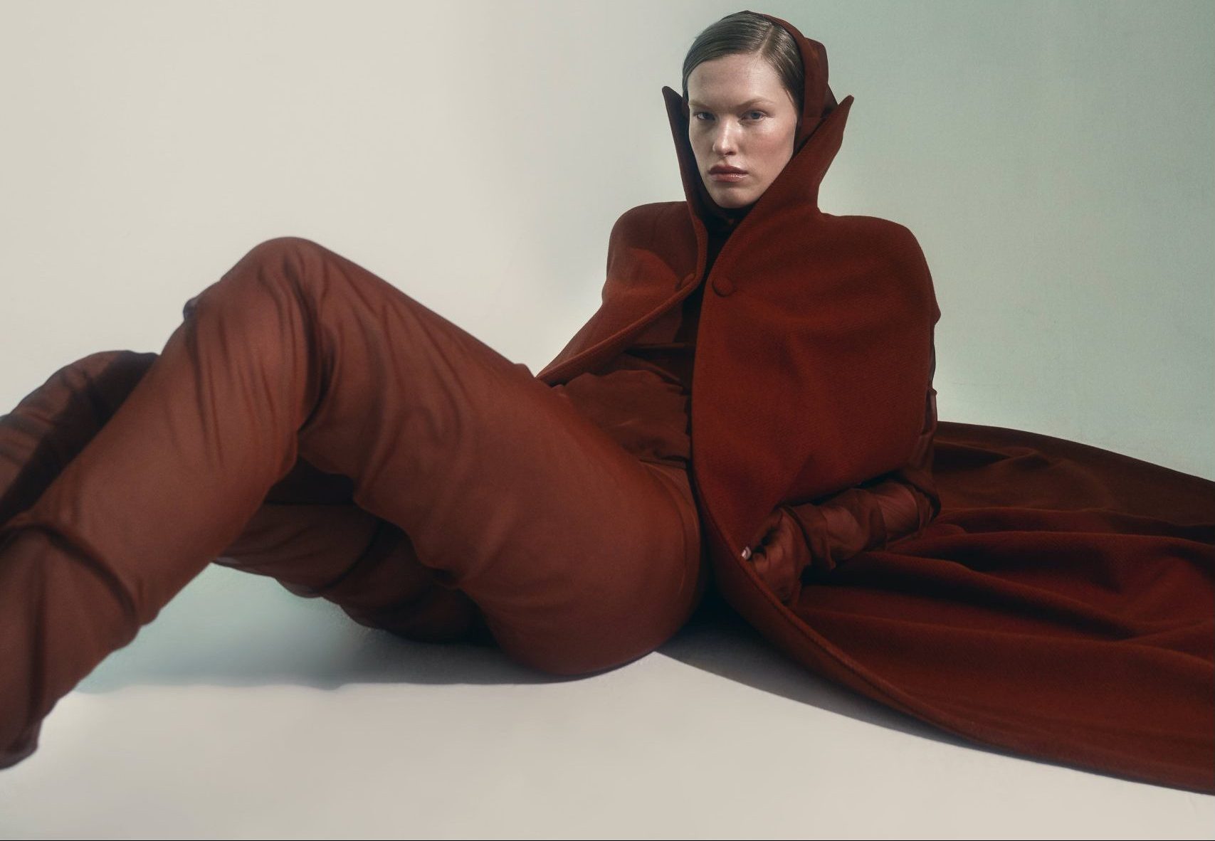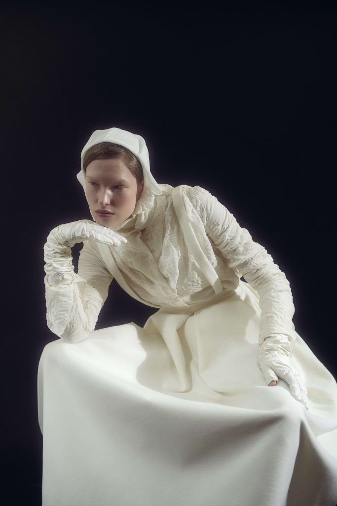 Ecco si svela l’affinità che giace nell’ideazione della collezione: l’istinto alla trasversalità, che fu la spinta al nuoto della leggendaria carpa Koi, che è il fuoco della scintilla di genio in Romeo Gigli. Un cuore che pulsa d’anticonformismo: l’ardore di andar controcorrente. Ogni outfit obbedisce alla bussola creativa che indica la direzione trasversale: lì si orientano le forme, slegate dall’estetica diffusa ma allacciate in un processo di costruzione composto in stratificazioni e sovrapposizioni; lì giungono i capiche si fanno interscambiabili, nati da sostanze tessili volubili che si poggiano sulla pelle con leggerezza impalpabile, o avvolgono il corpo nella tridimensionalità protettiva. Da lì si origina il sorprendente approccio materico: capace di creare meraviglia sulla stoffa, e di rinnovare l’incanto sperimentale che appartiene all’anima del brand calandolo nell’attuale. Più che lavorazione, è un’opera d’ingegnosa sperimentazione la pratica riservata al poliestere riciclato da cui si genera lo stupore di indossare la pelle del drago: merito della fiamma di uno scaldino il cui calore rigonfia la superficie del tessuto, la brucia e l’arriccia in una goffratura evocativa che richiama la leggenda. Un colpo di scena tessile interpretato dal maxi-piumino Bekko, nella morbida confortevolezza che lo rende leggero e caldo nonostante la struttura ricca; operazione che si ripete altrove, come nella giacca Shirudo, a cui dona un impercettibile effetto rilievo; nella gonna Cheri dove amplifica lo spacco sensuale; nel pantalone Kurayami a cui enfatizza l’apparenza gonfia; fin a ridisegnare il micro-gilet Cherireddo.