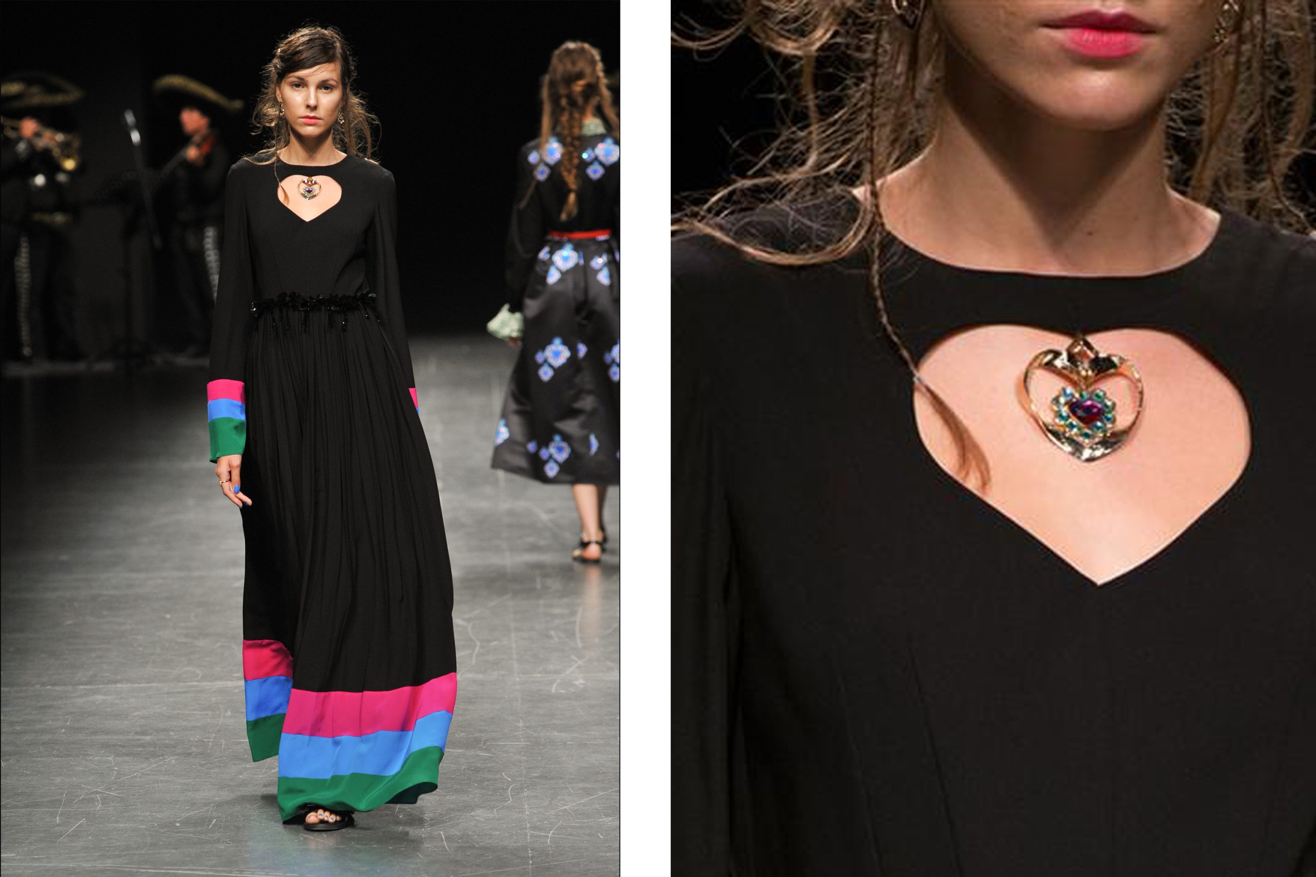 Da sempre legato alla sua terra, il Messico, San Andrés sfoggia i suoi colori vivaci, una presenza fissa della firma, con ricami di cristalli Swarovski e parure Stroili create appositamente per la sfilata.